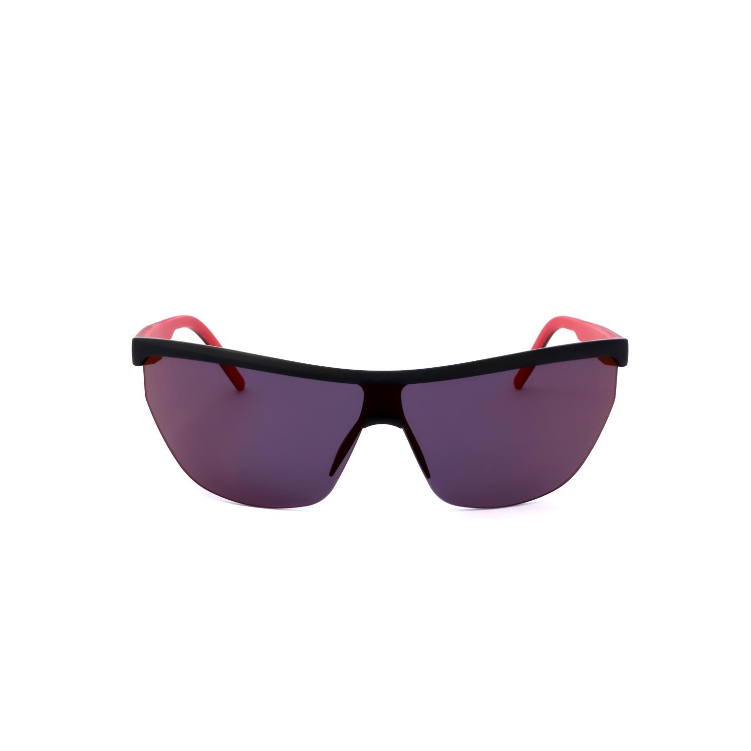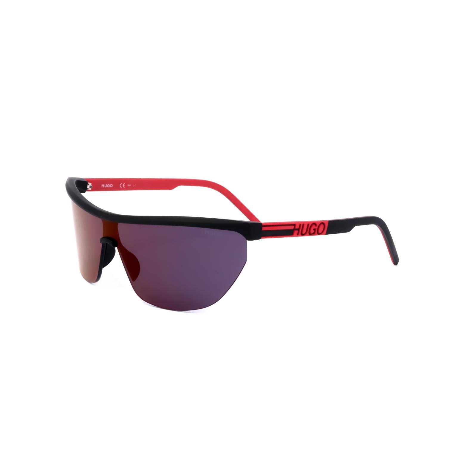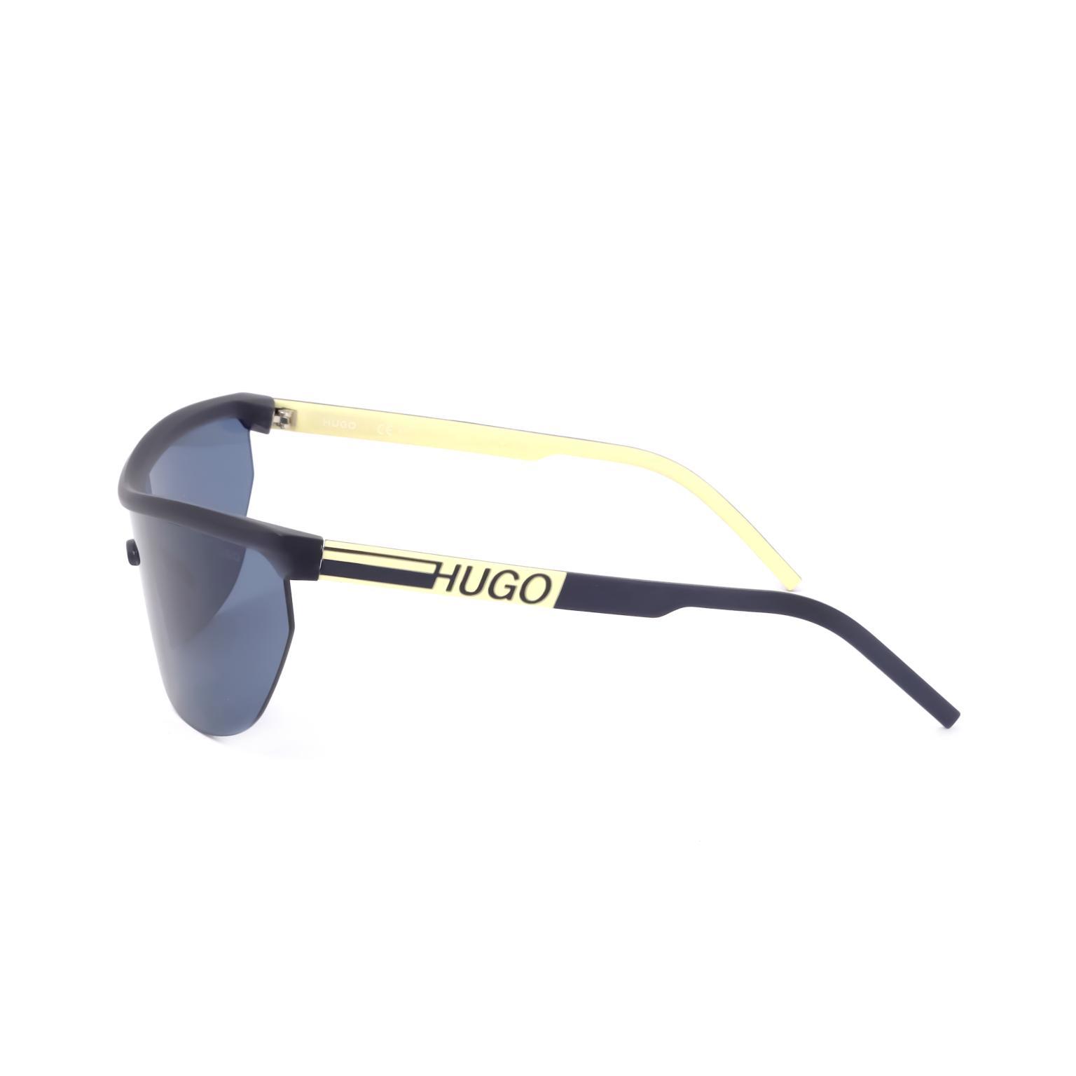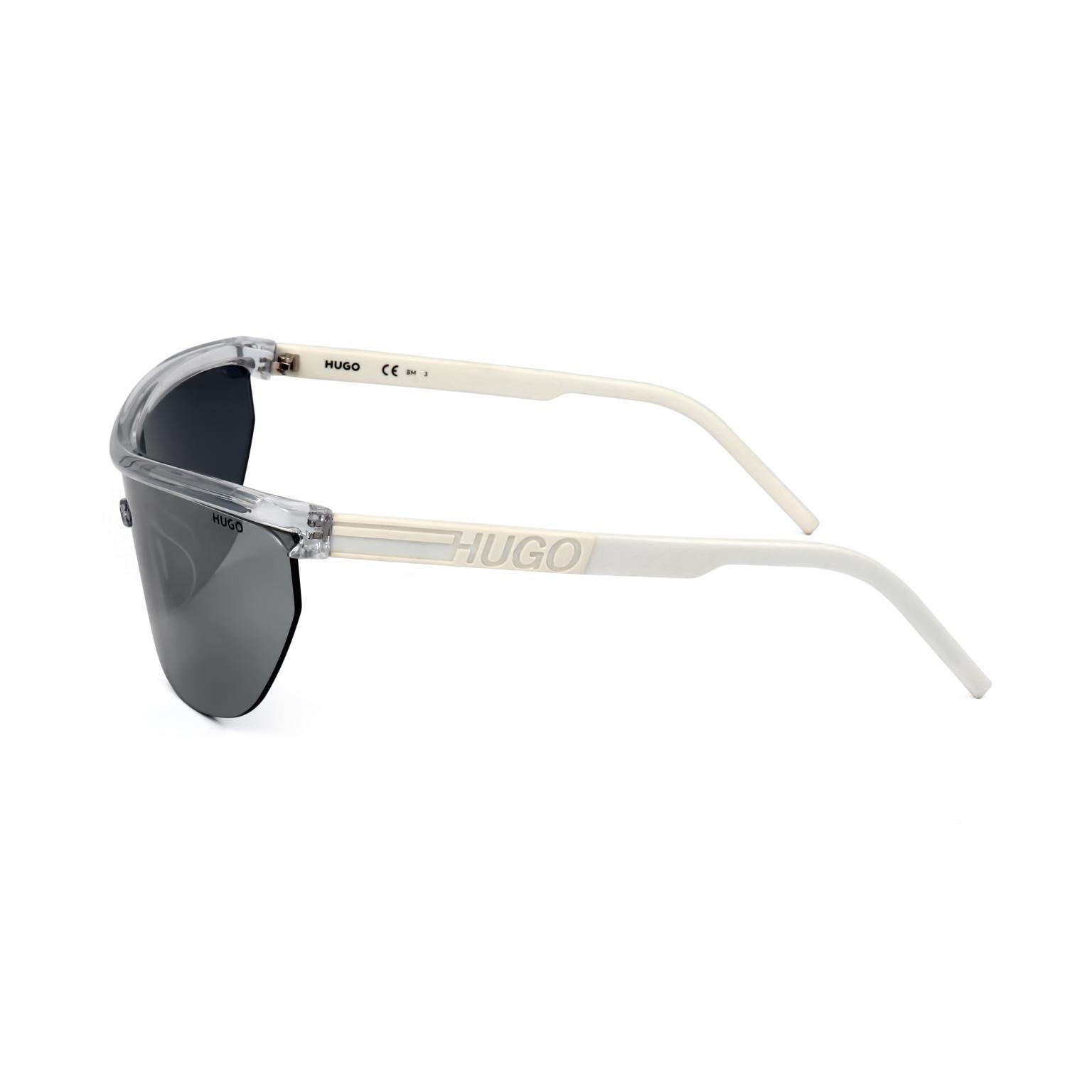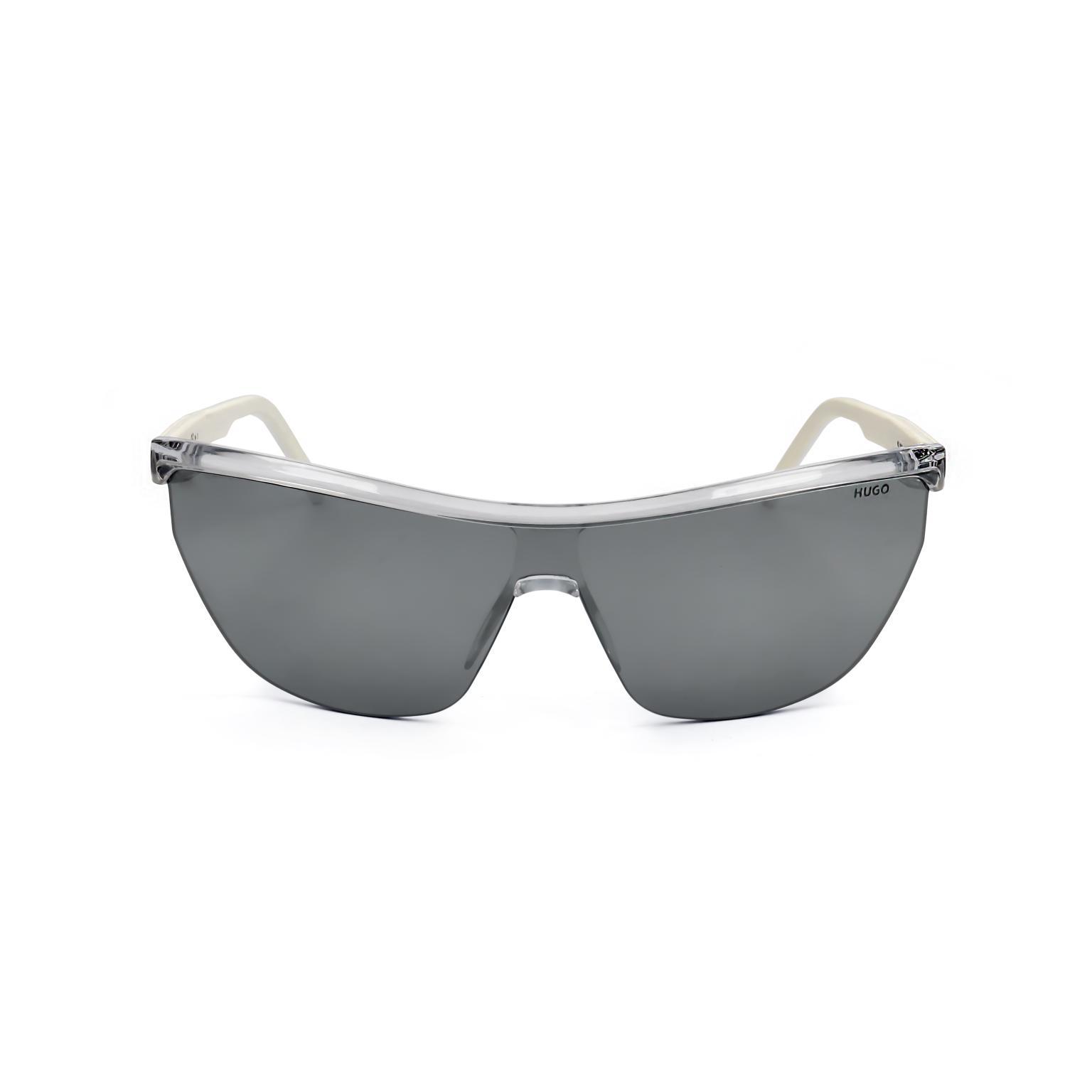 These HUGO sunglasses showcase a bold wrap-around silhouette characterized by a large, singular lens appearance. The architectural frame design integrates the bridge and temples into a cohesive, aerodynamic form. Precise engineering is visible in the way the transparent frame supports the expansive lens, creating a futuristic profile that captures attention through its volume.