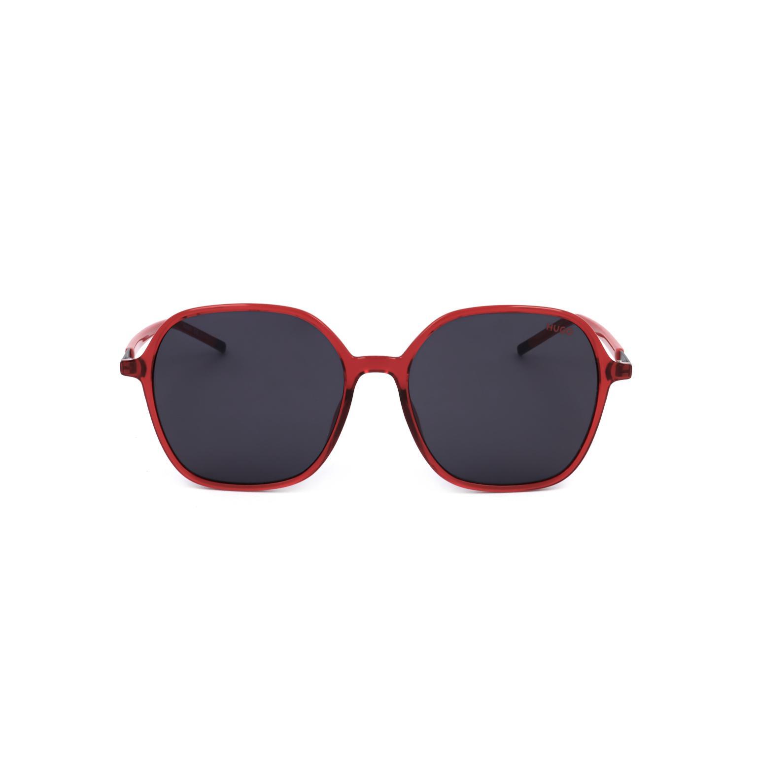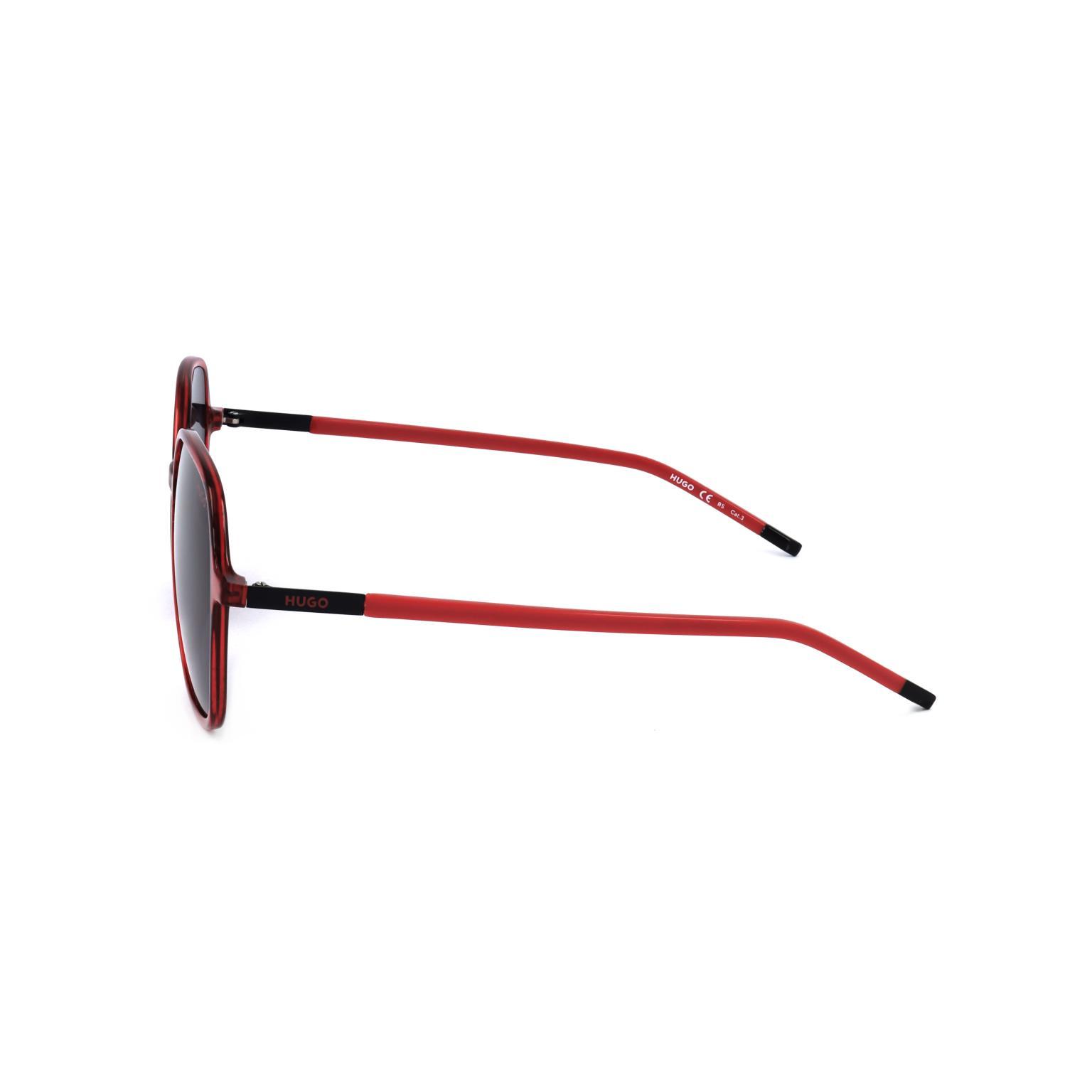 These women's sunglasses by HUGO feature a distinct geometric silhouette with a subtly translucent frame, presenting a contemporary and assertive aesthetic. The dark lenses are complemented by sleek, slender temples, which discreetly display the brand's logo, making them a commercially appealing accessory.