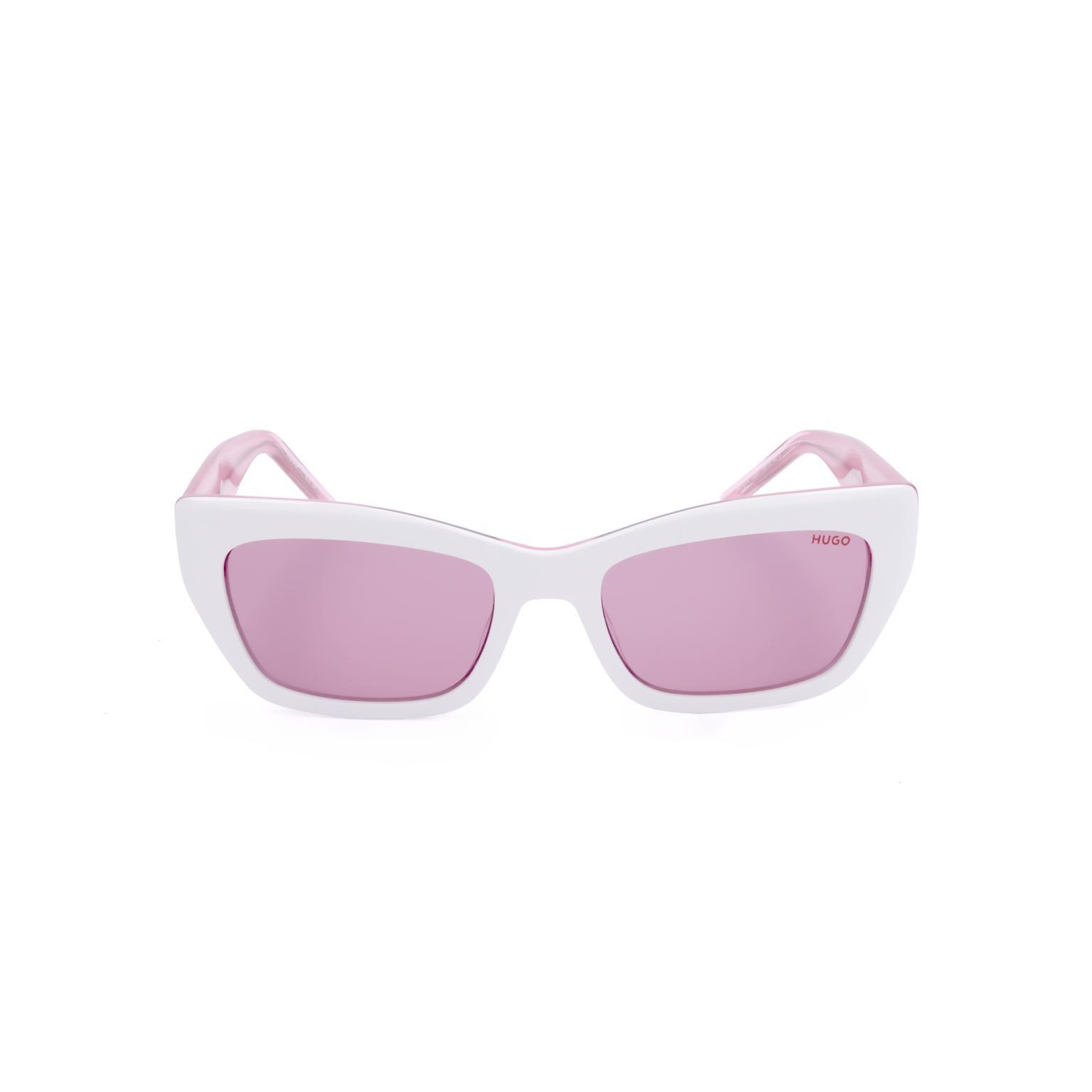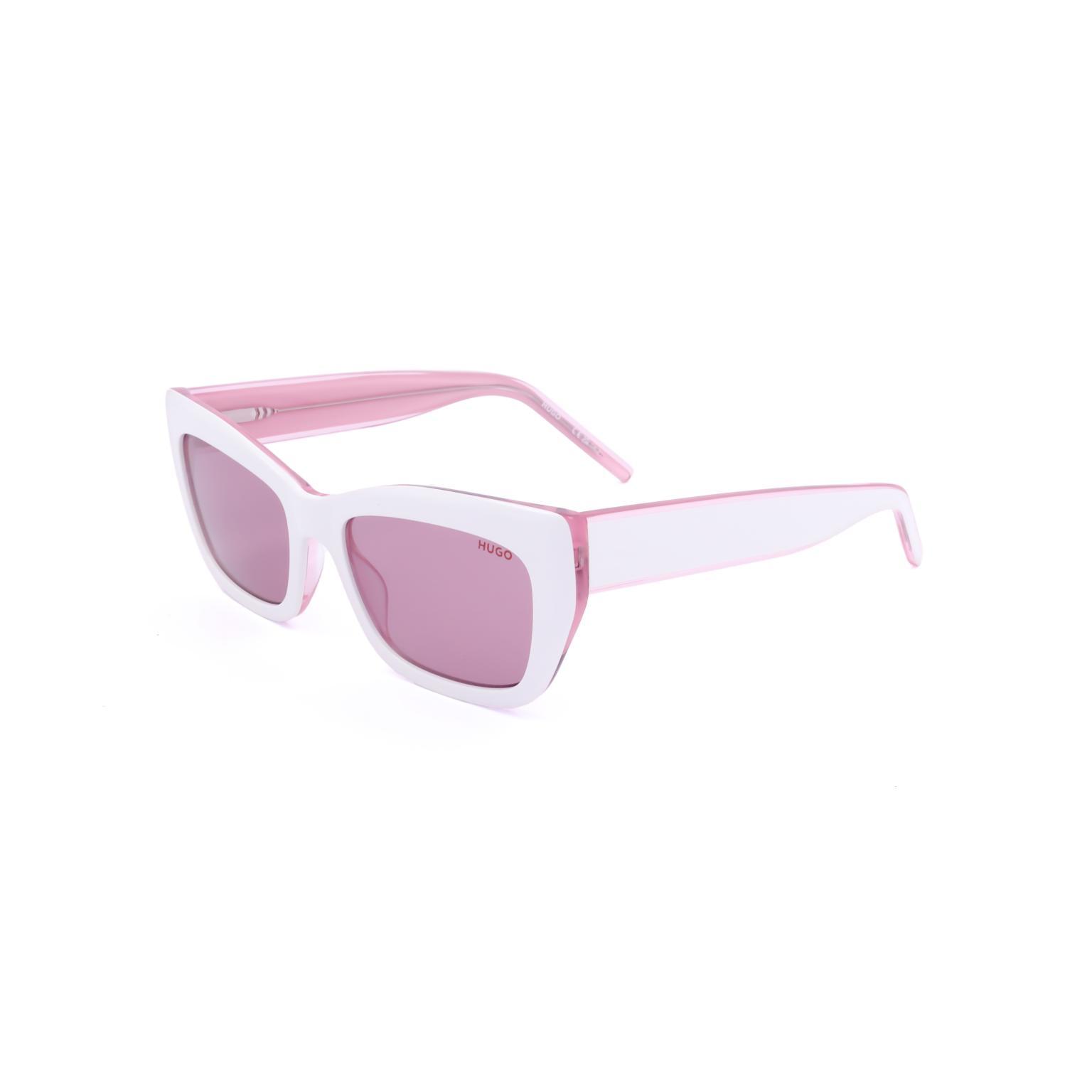 These women's sunglasses by HUGO offer a sharp, modern aesthetic, featuring a substantial frame with a distinctive angular profile. The clean lines and robust construction create a compelling visual statement, while the subtly tinted lenses provide clear vision and a polished look. The temples offer a refined contrast, adding to the overall appeal.
