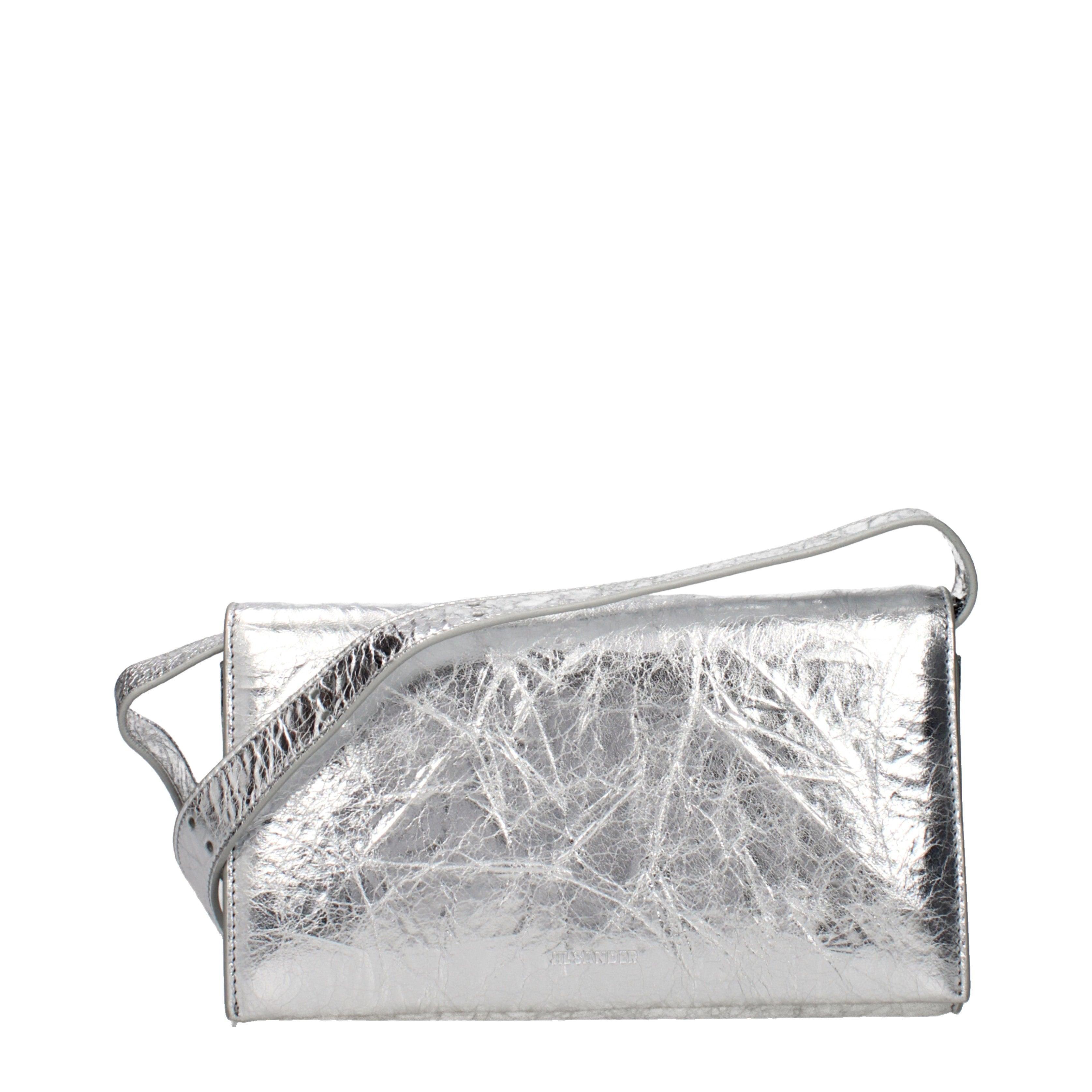This All Day shoulder bag by Jil Sander showcases a minimalist rectangular silhouette defined by sharp lines and a unique crinkled surface. The compact dimensions house a functional interior designed for organized storage, including six card slots and a dedicated compartment.
