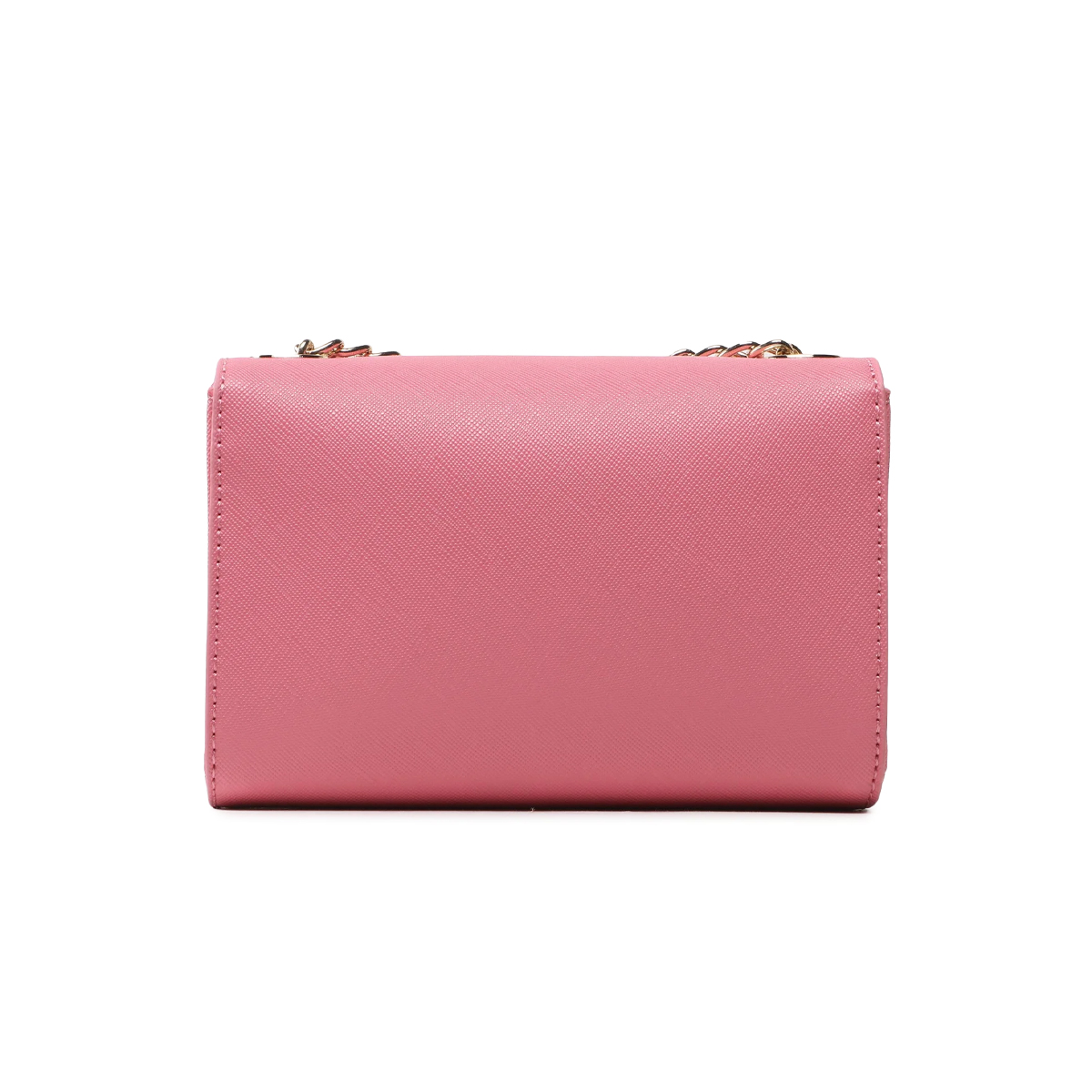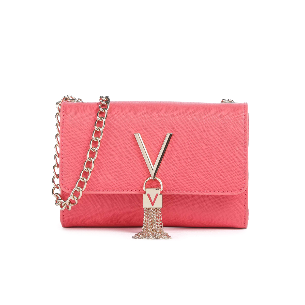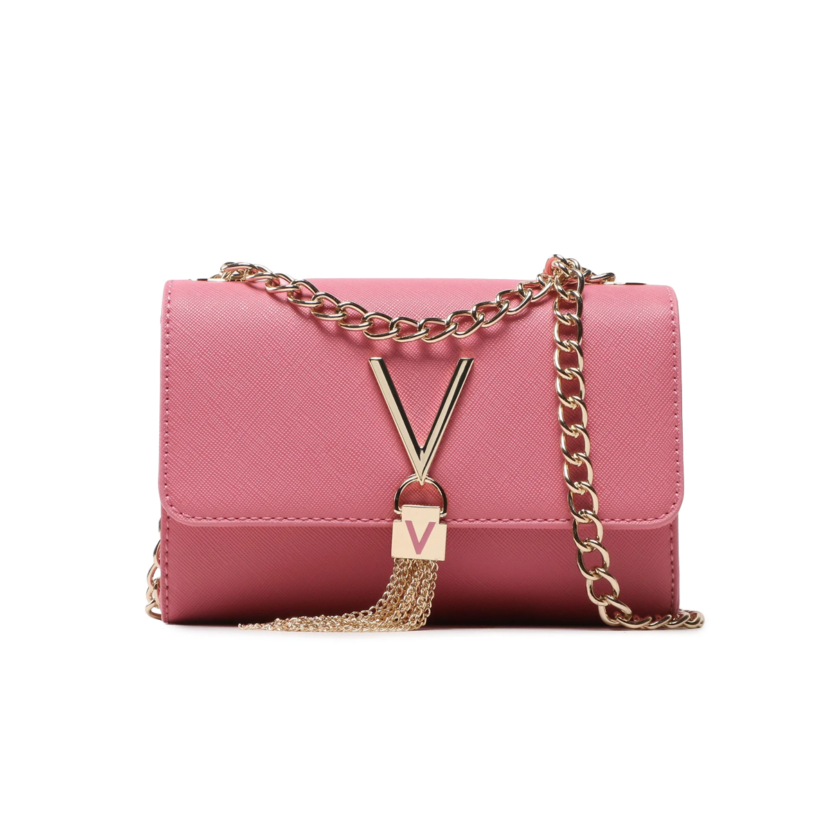 This DIVINA SA crossbody bag by MARIO VALENTINO features a structured silhouette with a distinct architectural influence. The focal point remains the polished metal hardware, consisting of a prominent V-shaped logo and a decorative padlock finished with delicate chain fringes that create a refined visual contrast against the fine-grained exterior.