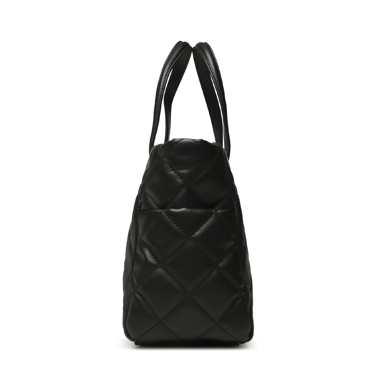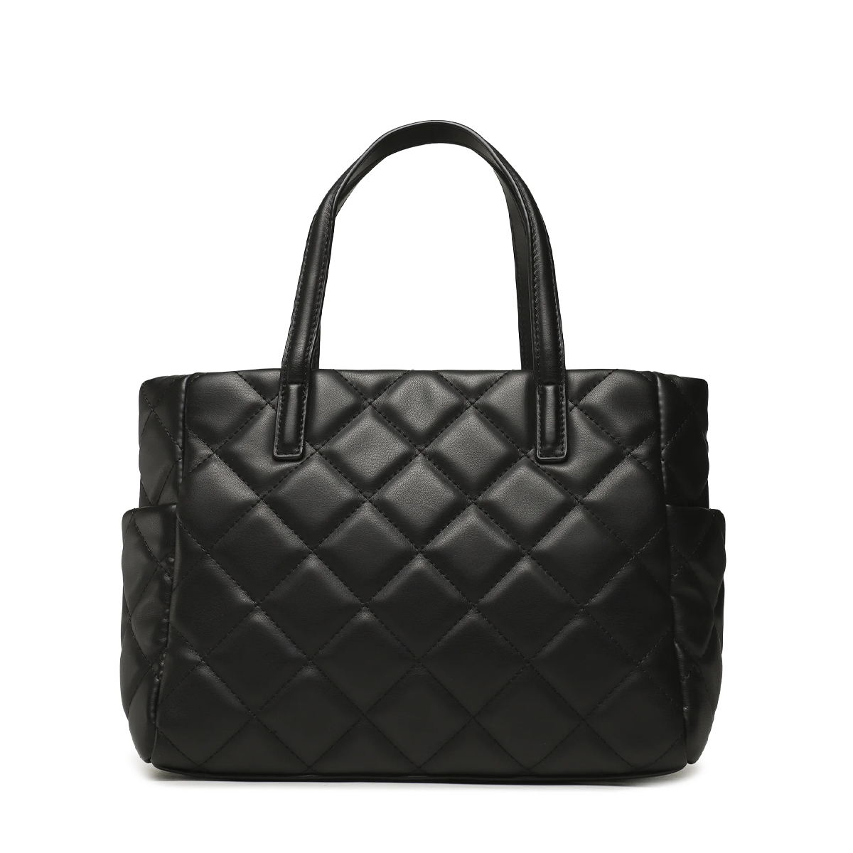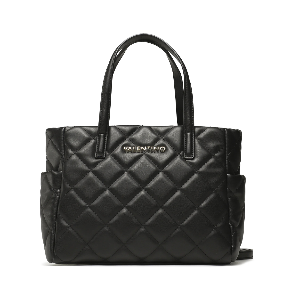 This Ocarina handbag by MARIO VALENTINO is a structured piece defined by a distinctive quilted finish and architectural lines. The diamond-patterned stitching creates a rhythmic texture across the entire body, providing a sense of depth and luxury. Featuring sturdy top handles and an adjustable, removable shoulder strap, the design prioritizes a professional silhouette that maintains its form regardless of contents. The metallic branding on the front panel serves as a focal point of quality.