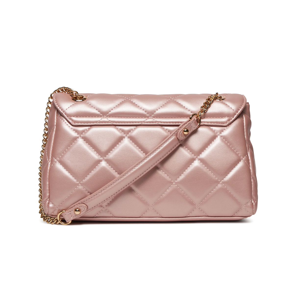 This BORSE ADA by MARIO VALENTINO is a sophisticated shoulder bag featuring a structured silhouette and distinctive quilted detailing. The design showcases a rhythmic diamond pattern across the exterior, punctuated by a central horizontal panel housing the embossed brand name. Its construction includes a dual-component strap, utilizing metallic links and a flat grip for comfortable placement on the shoulder during daily use.