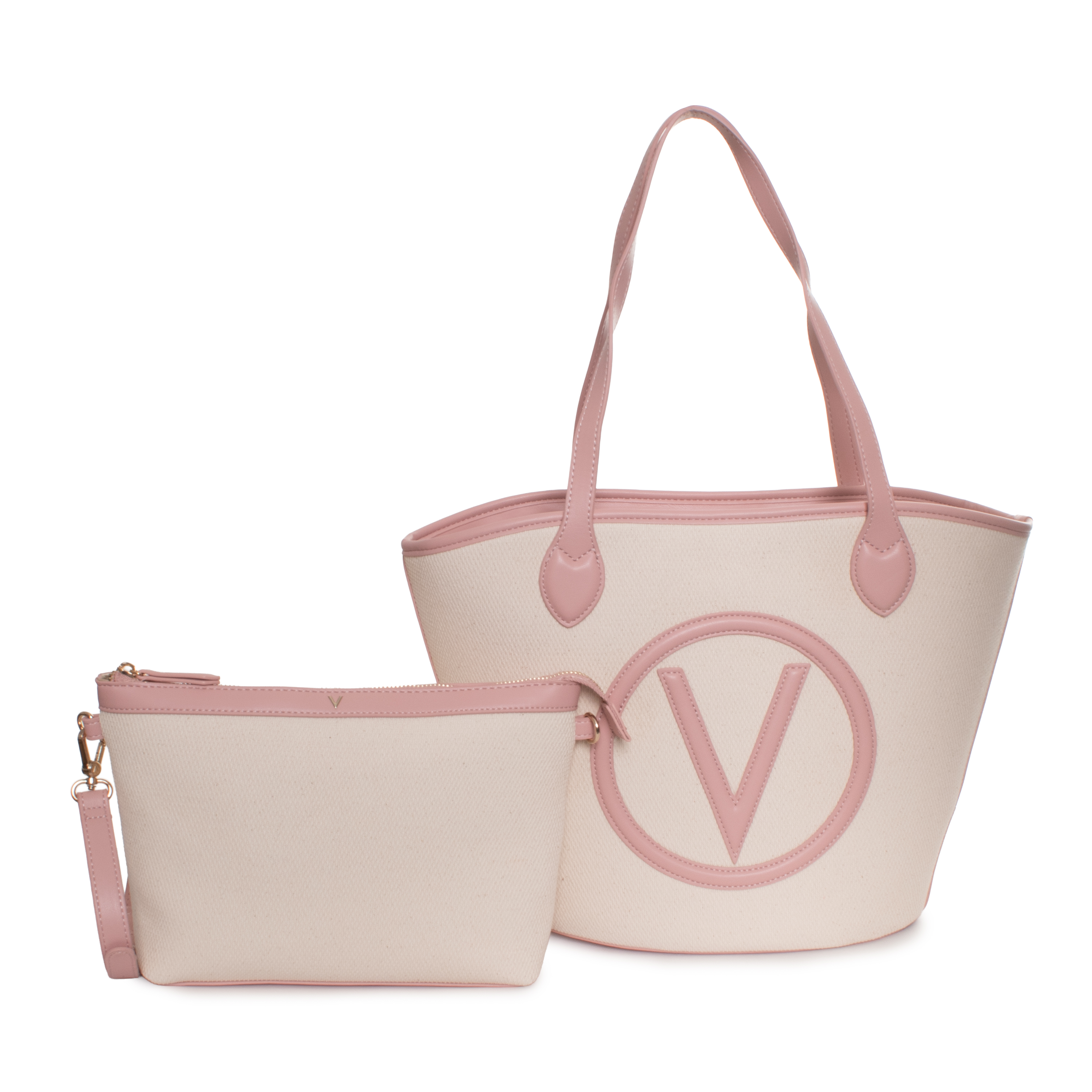 This COVENT shoulder bag by MARIO VALENTINO is a sophisticated example of functional geometry. The trapezoidal silhouette provides ample internal volume, complemented by a prominent embroidered circular logo that anchors the visual composition. Its dual handles are securely attached to the main body, ensuring stability and a balanced weight distribution during use.