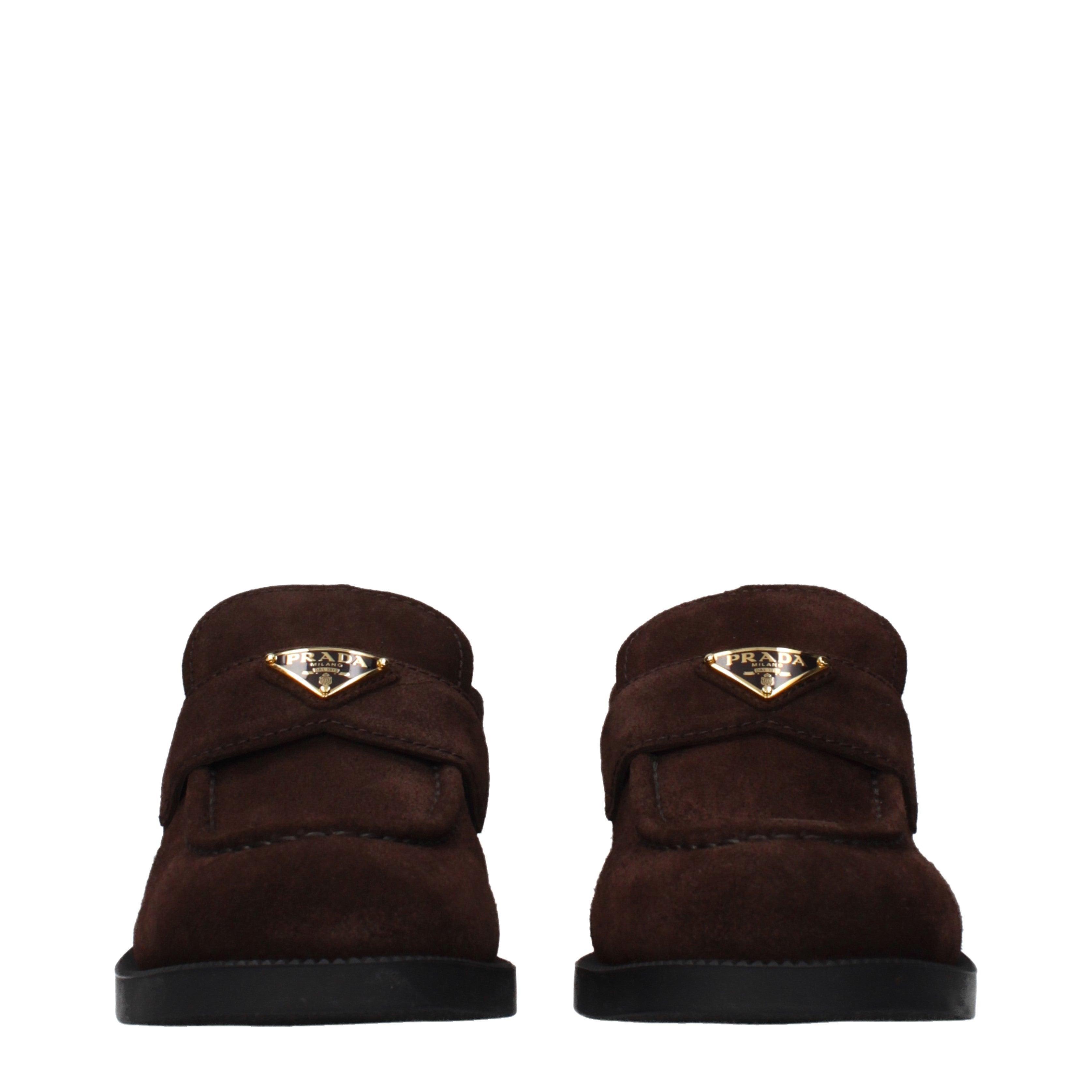 These PRADA loafers showcase a sophisticated silhouette characterized by a rounded toe and a structured upper. The design emphasizes a clean profile where the visible stitching along the apron adds a touch of textural depth. A distinctive metallic logo detail sits prominently on the vamp, adding a signature accent to the traditional construction.