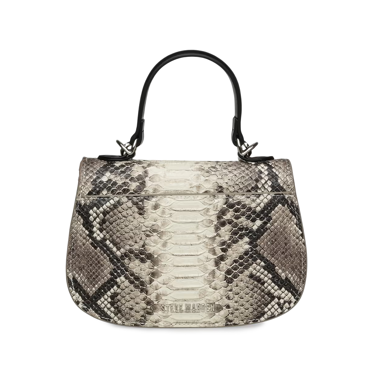 This STEVE MADDEN shoulder bag captivates with its sculptural form and compact dimensions. Its design features a gracefully curved flap secured by a prominent, branded hook closure, complemented by a short top handle and a sleek chain strap. The overall aesthetic is one of refined boldness, showcasing an eye-catching python-effect texture across its surface.