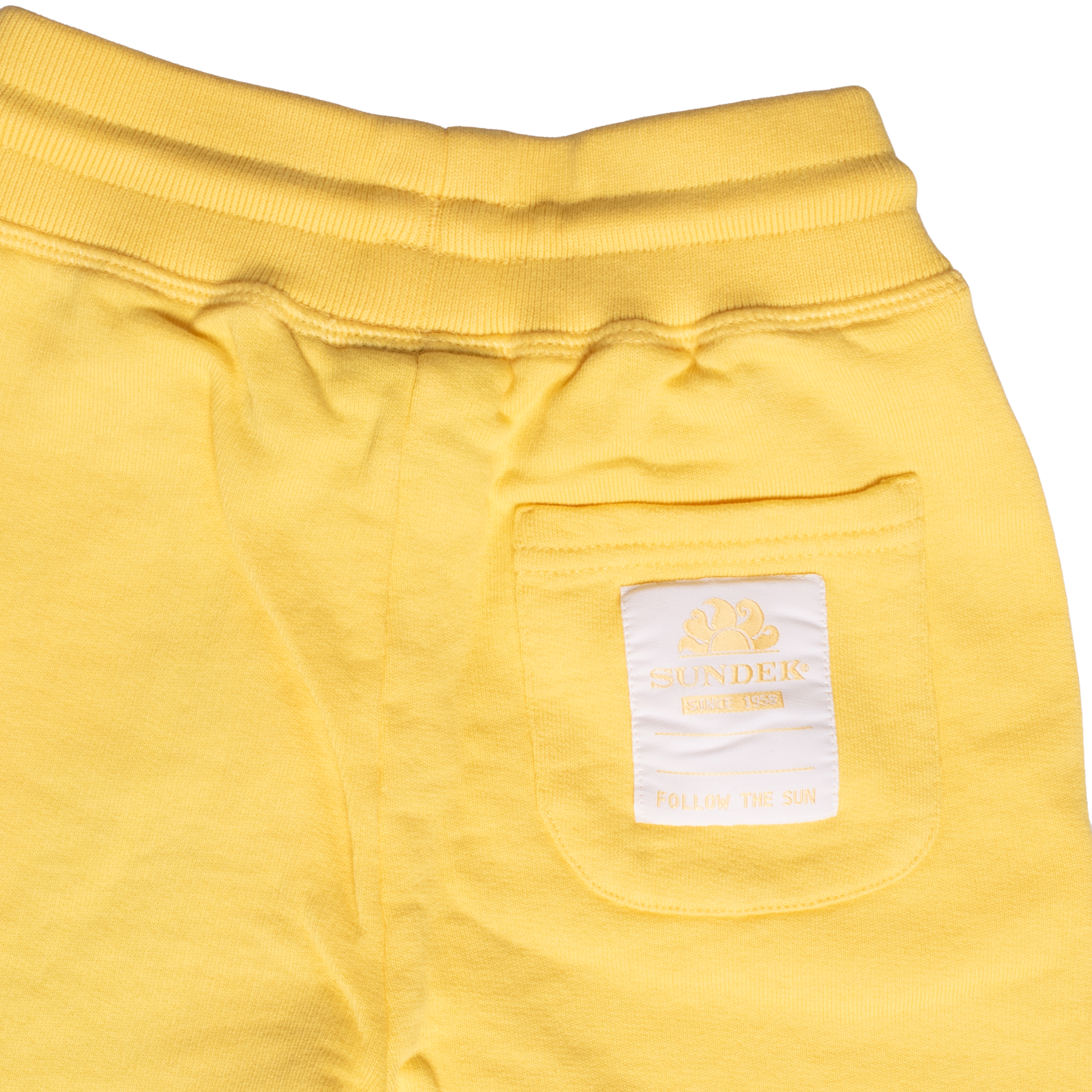 This BERMUDA E SHORTS SUNDEK - MINI SUNDEK PRINT-W by SUNDEK displays a relaxed silhouette focused on ease of movement. The garment features a flexible ribbed waistband with a visible drawstring, allowing for a personalized fit that remains secure. A prominent vertical logo print adorns the side, creating a bold visual focus that emphasizes the heritage of the label while maintaining a contemporary look.