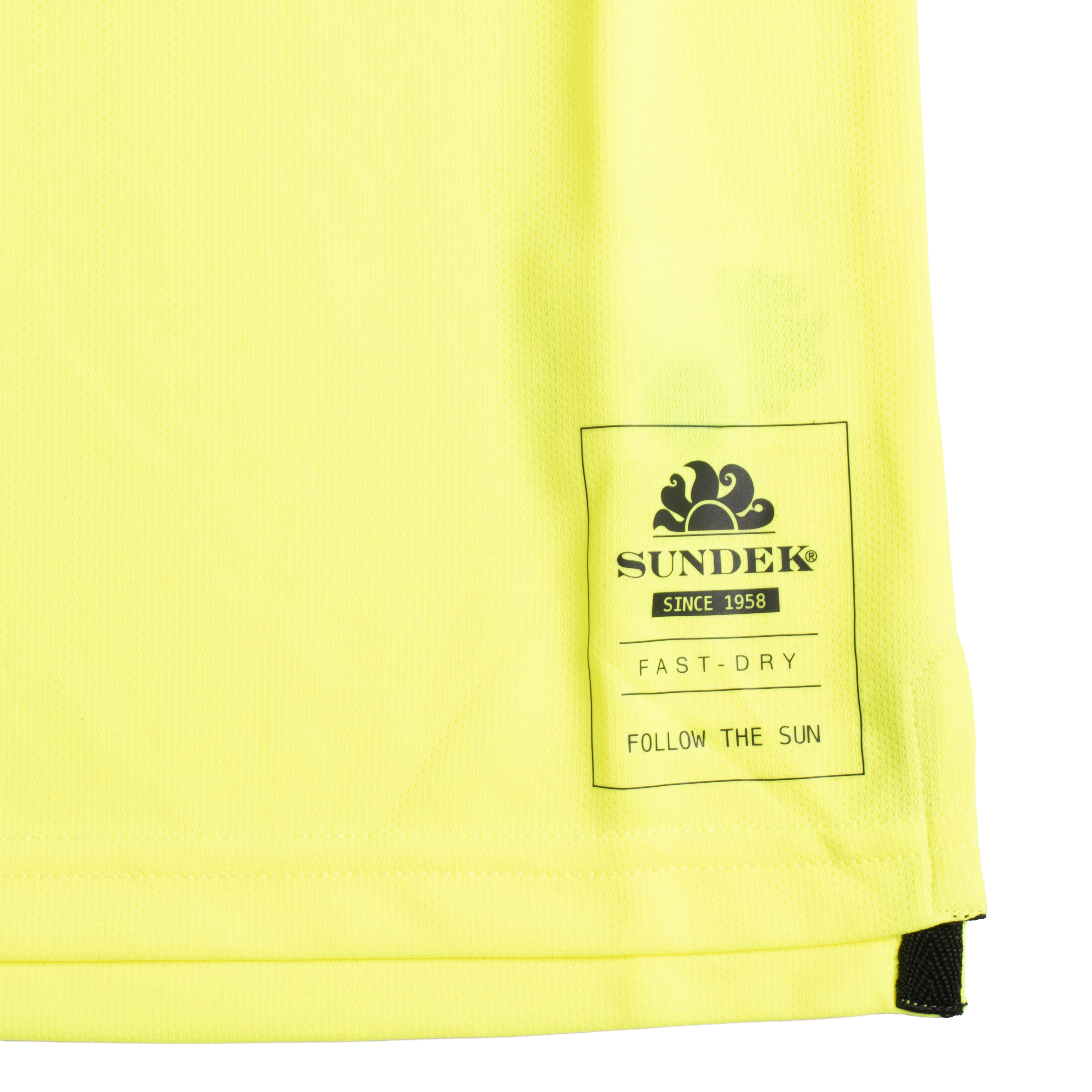 This POLO SUNDEK - MINI BROADWAY-POLO by SUNDEK is a sharp interpretation of athletic apparel, specifically designed for younger wardrobes requiring both style and substance. The silhouette is defined by clean lines and precise contrast tipping along the ribbed collar and sleeve cuffs, creating a distinguished profile that speaks to quality manufacturing. A square logo patch positioned near the hemline underscores the brand's heritage and attention to finishing, providing a subtle point of interest.
