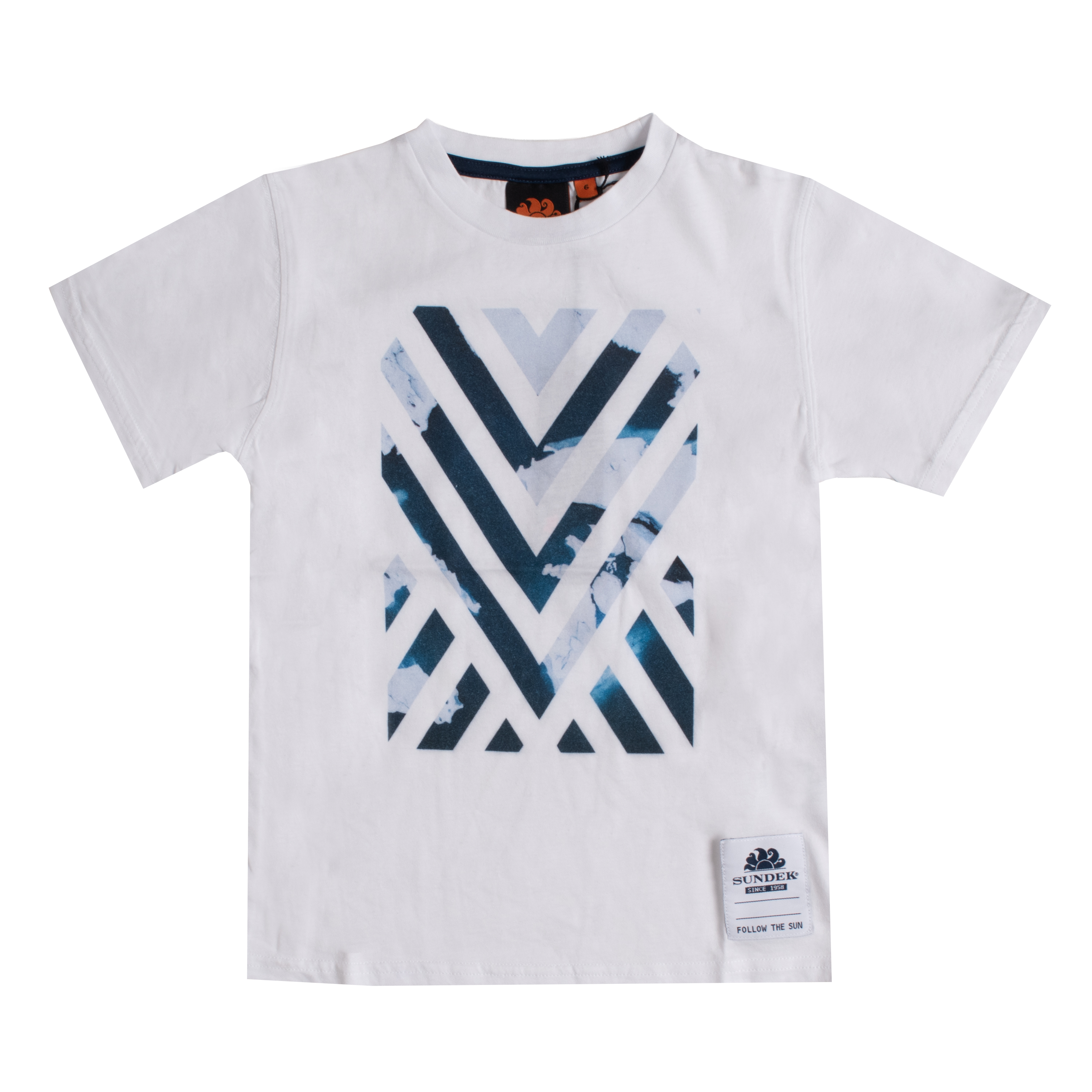 This T-SHIRT MINI ICELAND GEO-T- by SUNDEK is a versatile garment featuring a prominent geometric graphic on the chest that creates a strong visual focus. The construction prioritizes a comfortable fit with a well-defined crew neck and precise stitching along the sleeves and hem. A discrete woven patch near the bottom edge serves as a signature mark of quality.