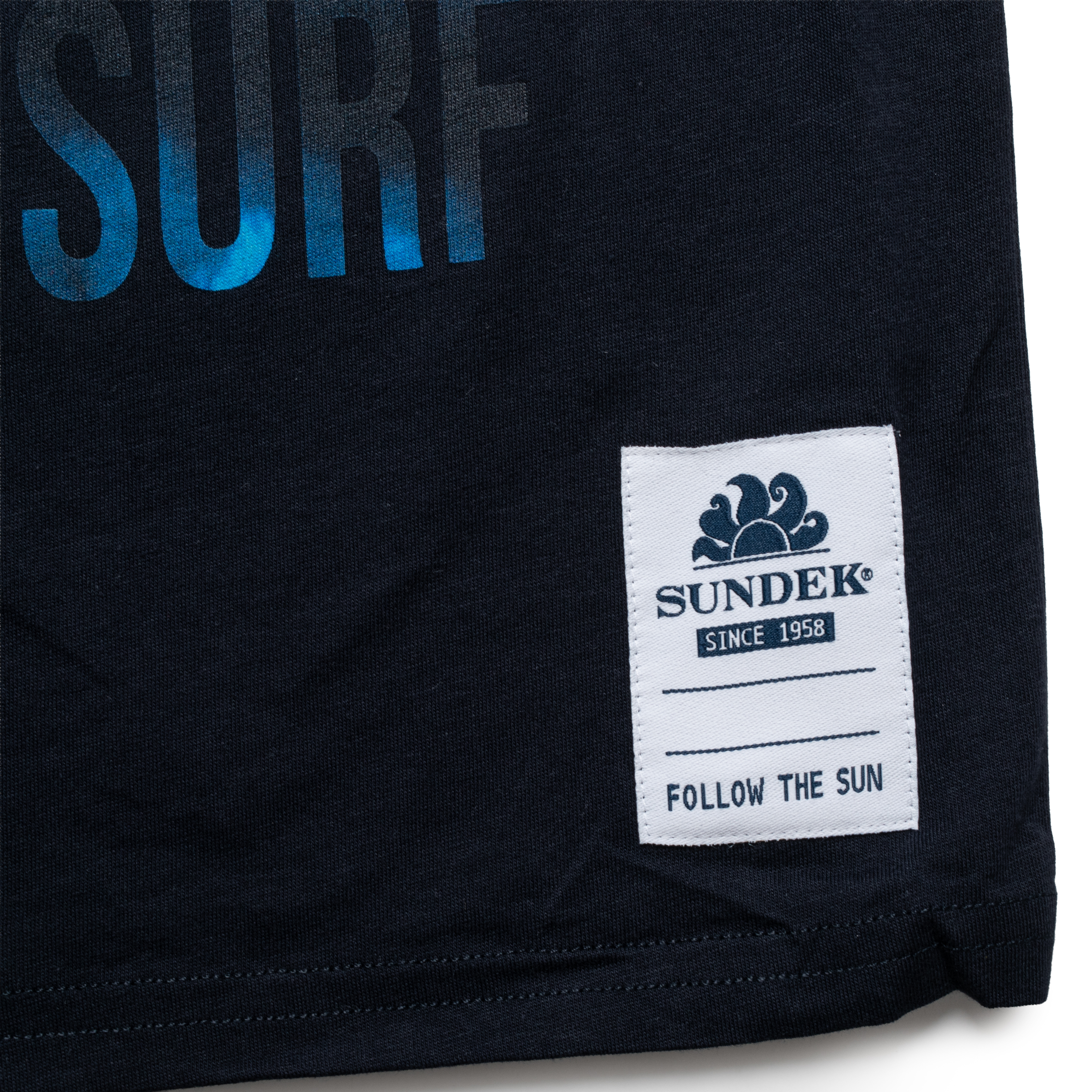 This T SHIRT NEW MINI WE SURF-T- by SUNDEK presents a bold aesthetic through its central graphic artwork and precise tailoring. The garment features a sturdy ribbed crewneck and clean-cut short sleeves that maintain a structured profile suitable for active daily use. A signature woven patch near the hem emphasizes the brand's attention to functional branding and detailed finishing, providing a professional touch for any retail display.
