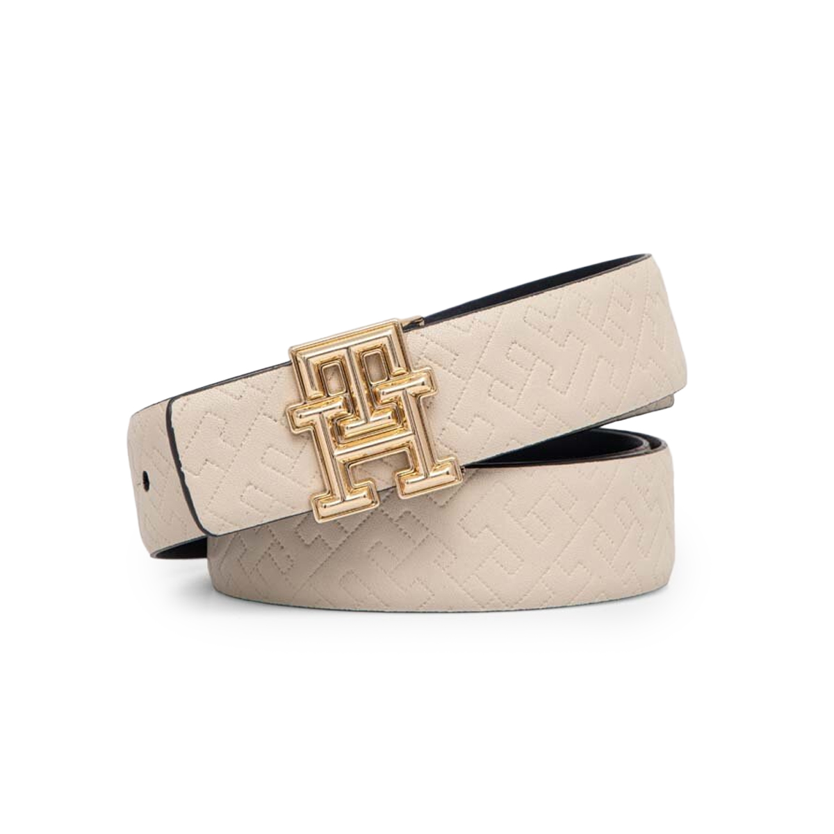 This TH REVAMP REV 3.0, 0GJ belt by TOMMY HILFIGER is a masterclass in functional elegance. The design features a striking embossed pattern across the strap, creating a rich tactile experience that highlights the iconic monogram. A bold, interlocking metal buckle serves as a sophisticated fastener, showcasing the brand's commitment to polished hardware and clean lines.