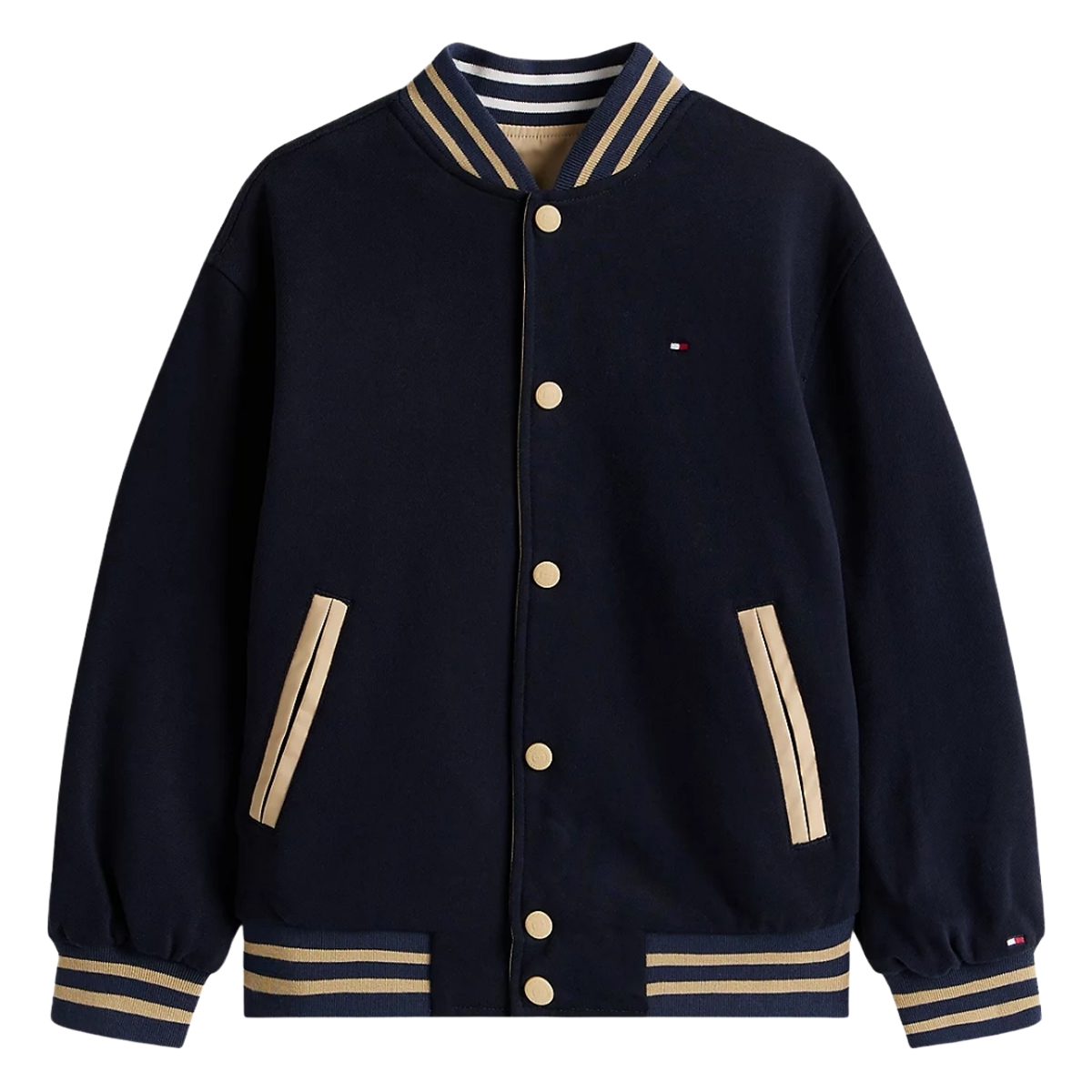 This jacket REVERSIBLE BOMBER JACKET by TOMMY HILFIGER is a dynamic piece designed with a focus on adaptability and clean lines. The reversible construction allows for multiple styling options within a single garment, featuring traditional ribbed trims that maintain a structured yet flexible shape. Its silhouette captures an iconic collegiate look that remains relevant across various retail segments.