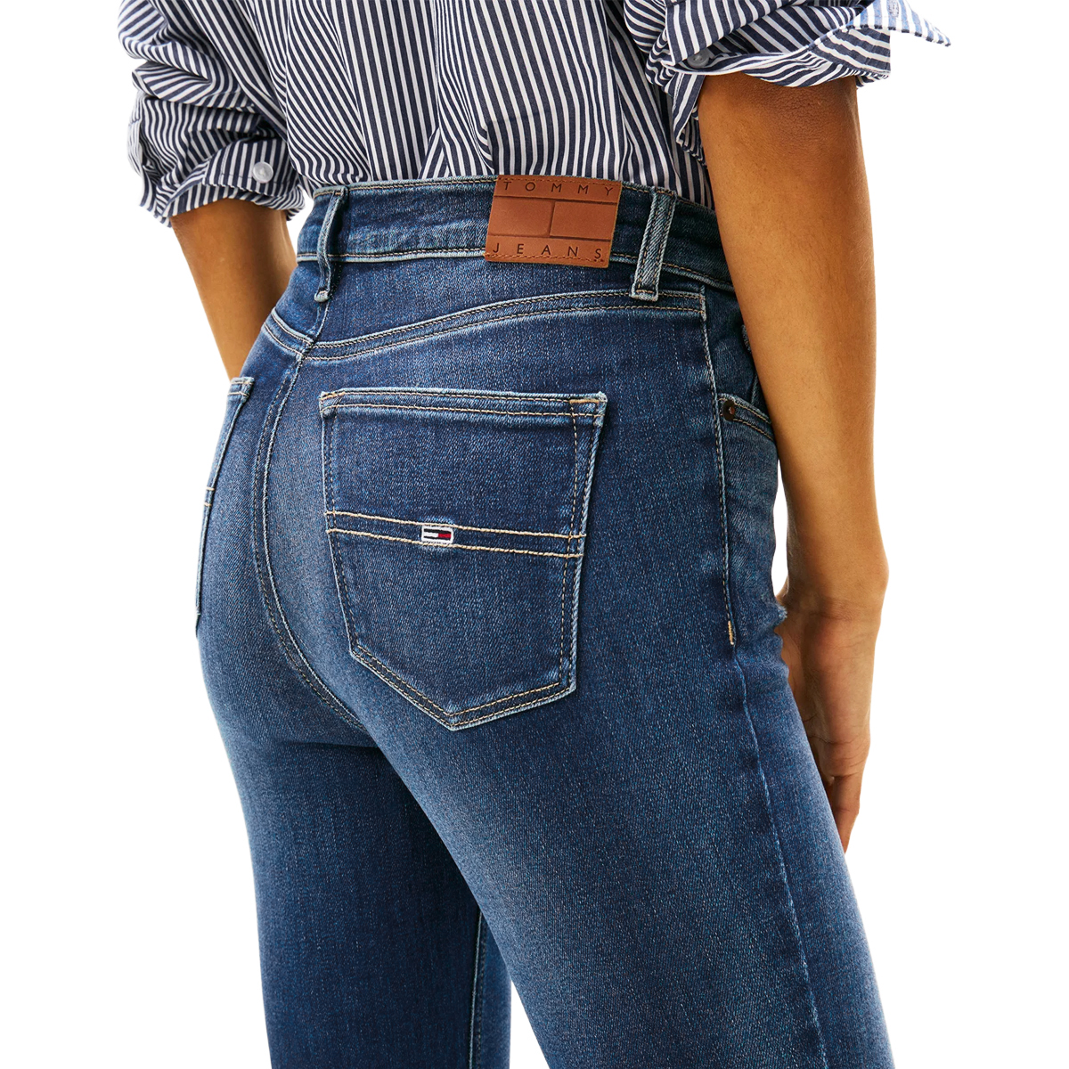 These jeans NORA MD SKN AI3354, 1BK by TOMMY JEANS offer a sophisticated take on a classic wardrobe staple, meticulously crafted for refined appeal. The slim, form-fitting cut from hip to ankle creates a sleek line, suitable for a myriad of styling options. They feature the enduring five-pocket configuration, secured with a sturdy zip fly and button closure.Constructed from a robust 90% cotton, 7% polyester, 3% elastane blend, the fabric ensures remarkable flexibility and enduring wear. The high cotton content provides natural softness and breathability, complemented by polyester for enhanced strength and shape retention, while elastane delivers the essential stretch for comfortable movement.
