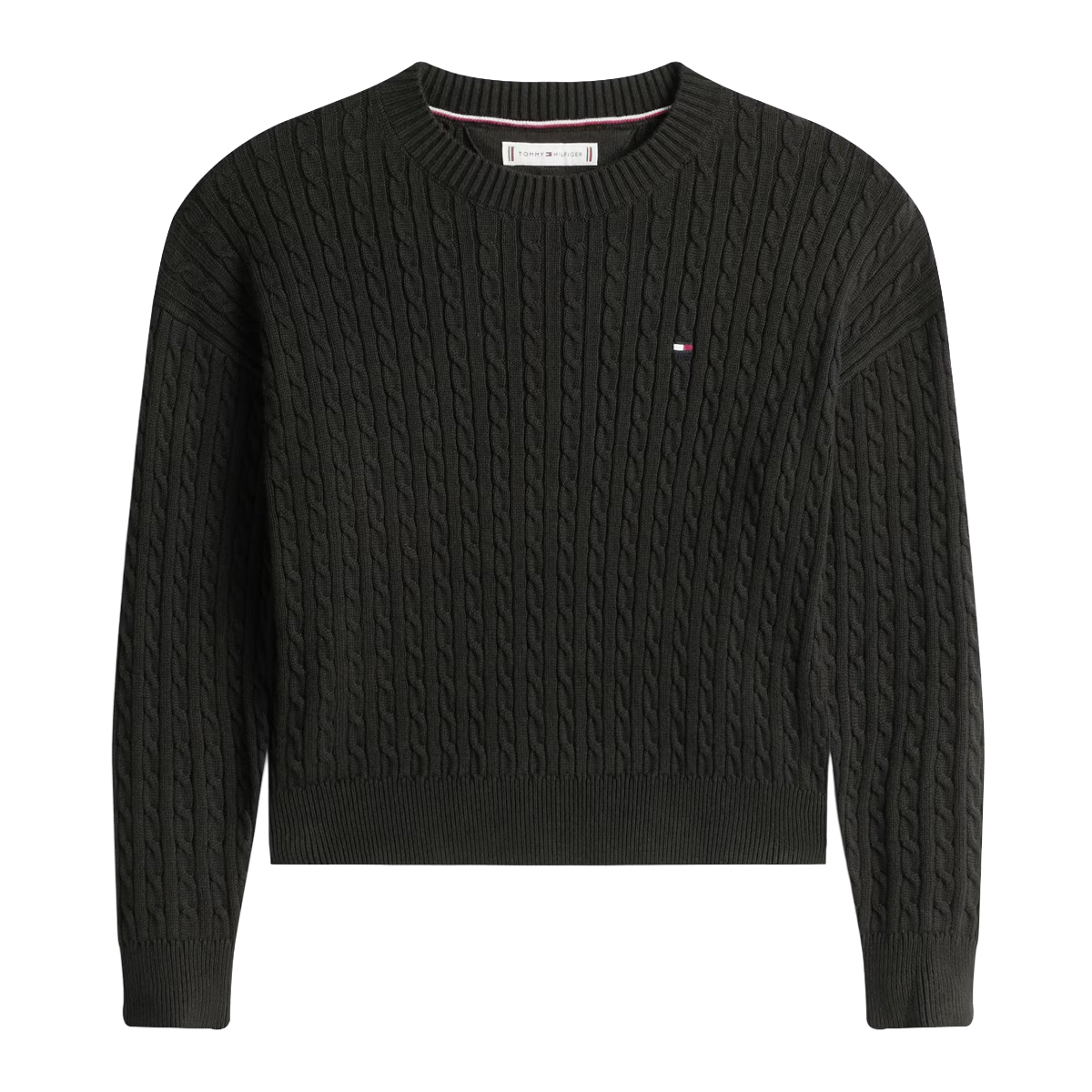 This sweater Cable Sweater by Tommy Hilfiger is a refined piece of knitwear that showcases a traditional cable-knit pattern across the entire body and sleeves. The relaxed silhouette is anchored by a sturdy crew neck and thick ribbed trims, creating a look of timeless sophistication that suits various retail environments.