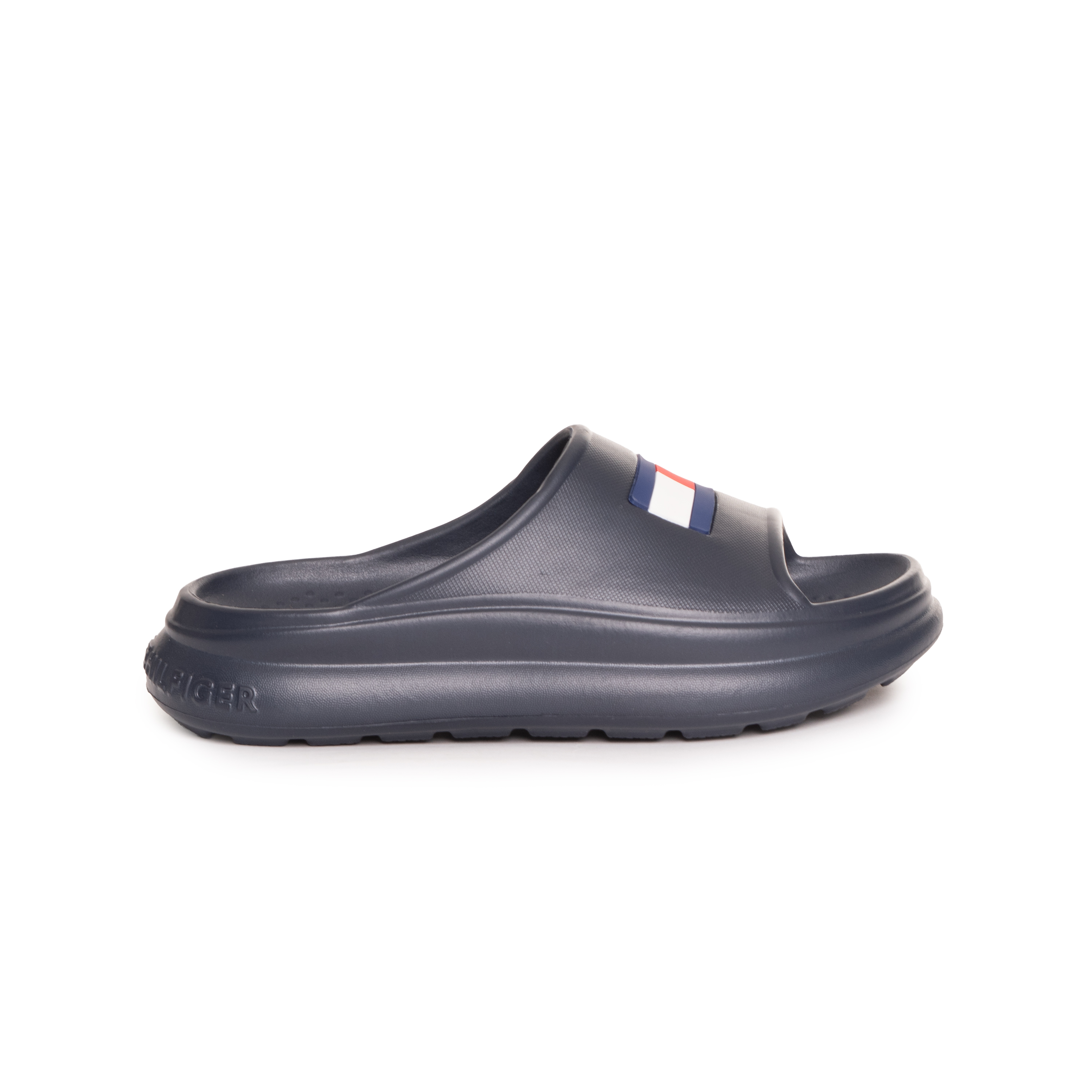 This FOAM SLIDE ciabatta by TOMMY HILFIGER represents a modern take on casual footwear, focusing on a bold, chunky silhouette that provides substantial underfoot support. The wide upper strap features the signature flag branding, which serves as a distinctive hallmark of the brand's heritage, while the contoured footbed is engineered for a secure and comfortable fit.