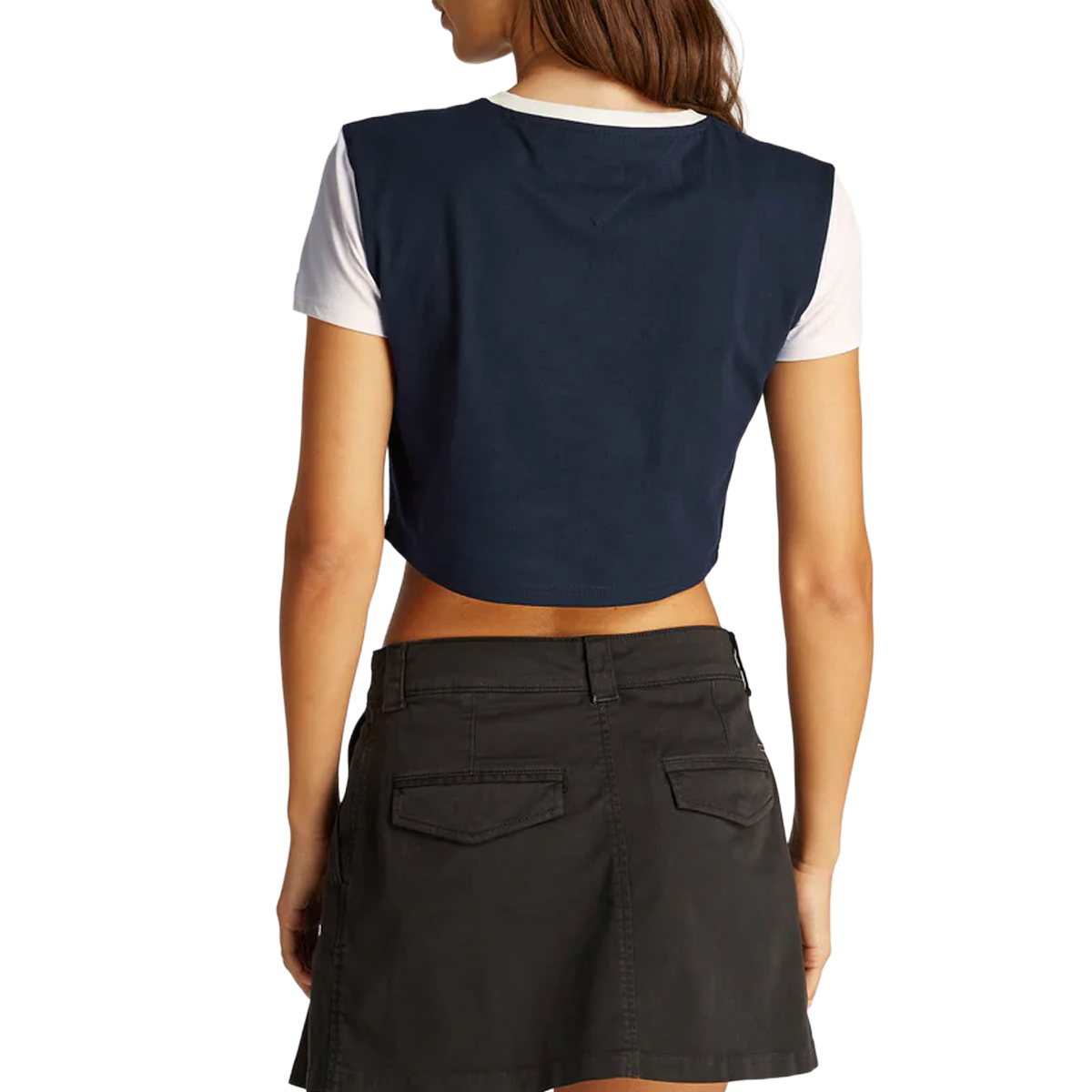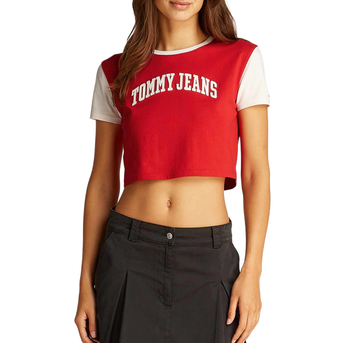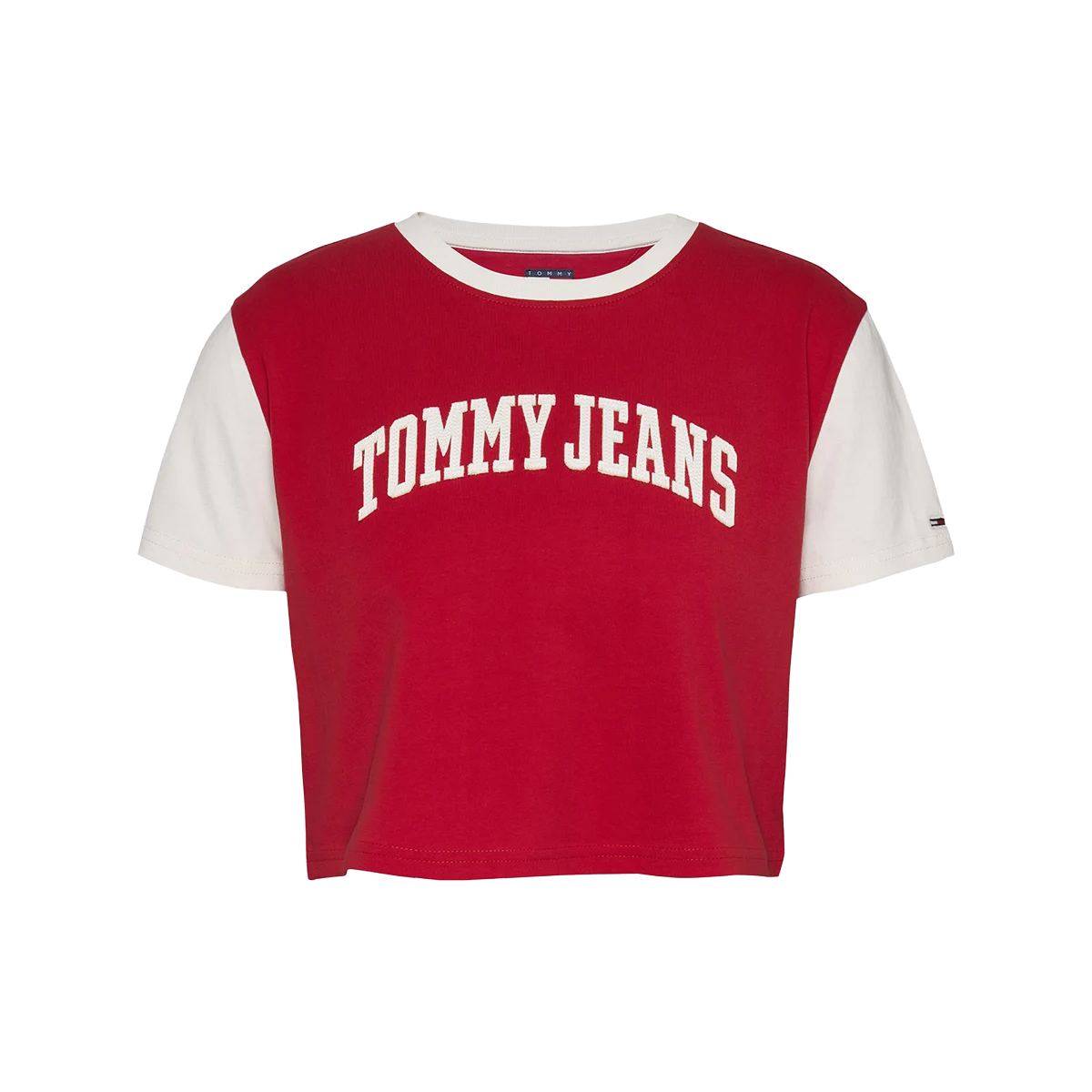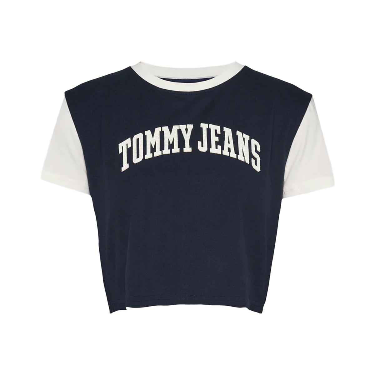 The TOMMY JEANS women's T-SHIRT offers a fresh and dynamic silhouette with its cropped length and short sleeves. Its distinctive bicolour design features a contrasting crew neck and a prominent chest panel, showcasing the arched TOMMY JEANS logo, meticulously embroidered for a premium finish. This garment provides an appealing contemporary aesthetic.