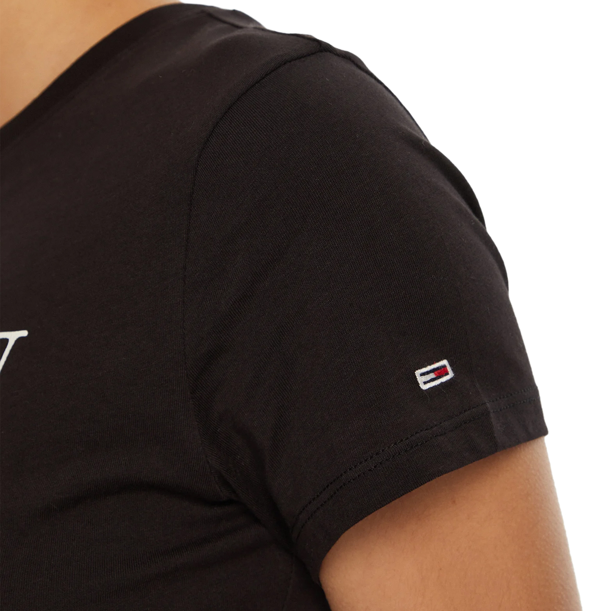 This women's T-shirt by TOMMY JEANS is a quintessential piece for any curated collection, offering a sleek slim fit and a classic crew neck design. Its short sleeves and clean lines provide a foundational aesthetic, distinguished by the prominent brand logo elegantly printed across the chest, signifying authentic style.