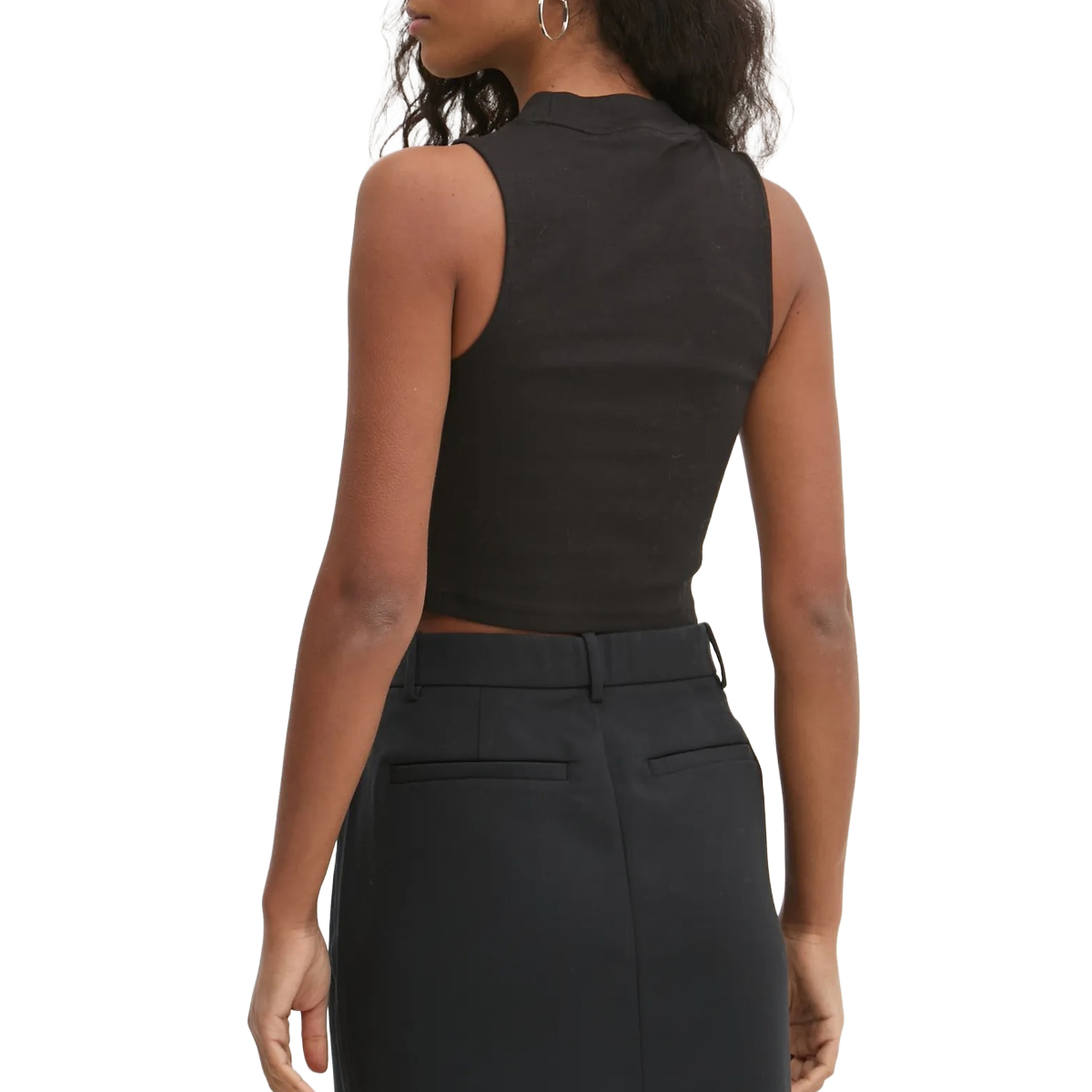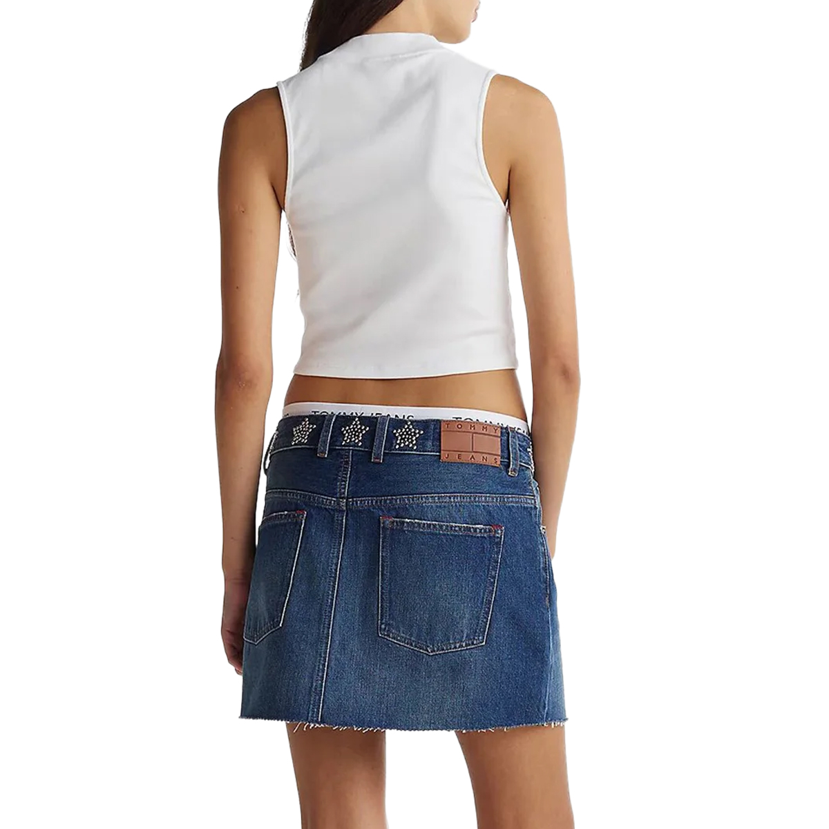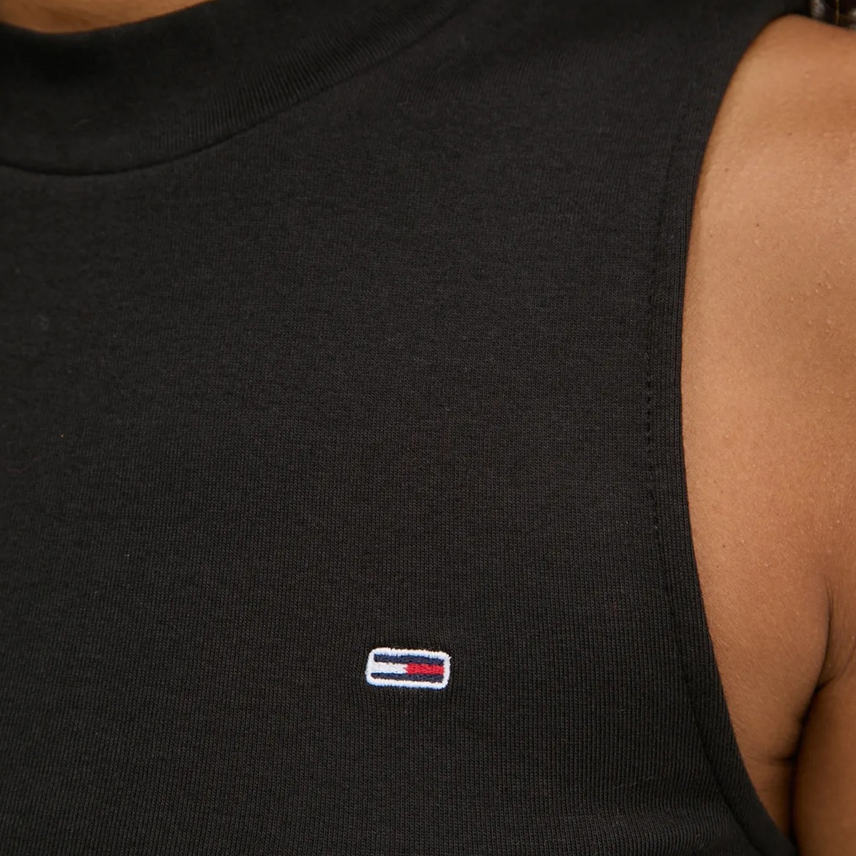 This sleeveless top from TOMMY JEANS offers a contemporary profile with its high crew neck and close-fitting cut. The design is clean and understated, featuring the iconic flag logo subtly positioned on the left chest, signifying brand quality. Its cropped length and sleek lines make it a versatile piece for diverse retail offerings.Composed of 95% regenerative cotton and 5% elastane, the fabric ensures a smooth feel and comfortable stretch. Regenerative cotton is produced using farming methods that restore soil health and biodiversity, making it a more environmentally conscious material choice that also provides inherent breathability and form retention.