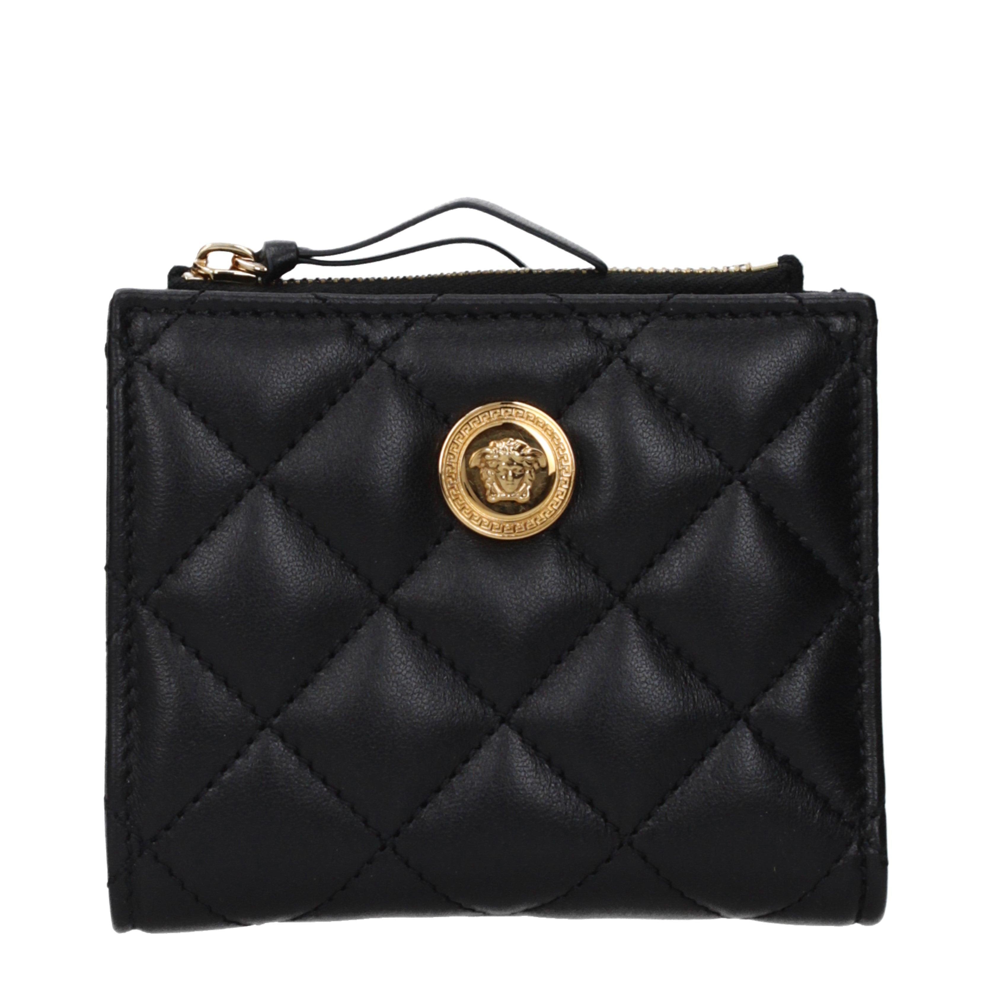 This VERSACE wallet showcases a rigorous approach to luxury, meticulously crafted in ITALY from premium leather. The exterior features a distinctive quilted pattern that adds a tactile depth to the silhouette, centered by a signature metal medallion that serves as a focal point of the design.
