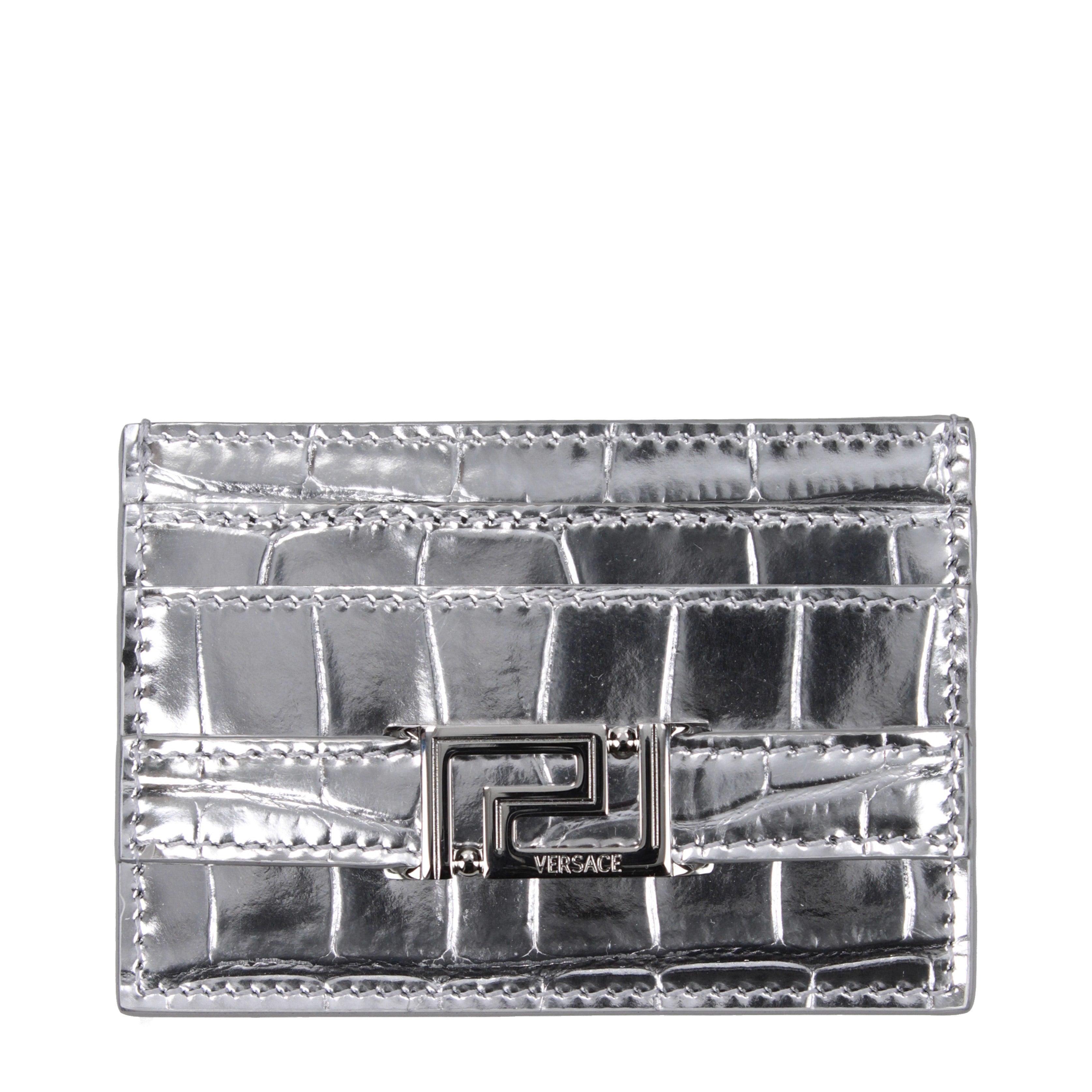 This VERSACE card holder showcases a bold approach to small accessories, featuring a distinctive embossed texture that mimics exotic skins. The rectangular silhouette is defined by sharp lines and a central metallic element that acts as a focal point, reflecting the house's heritage. With five dedicated slots, the organization is streamlined and efficient for professional needs.