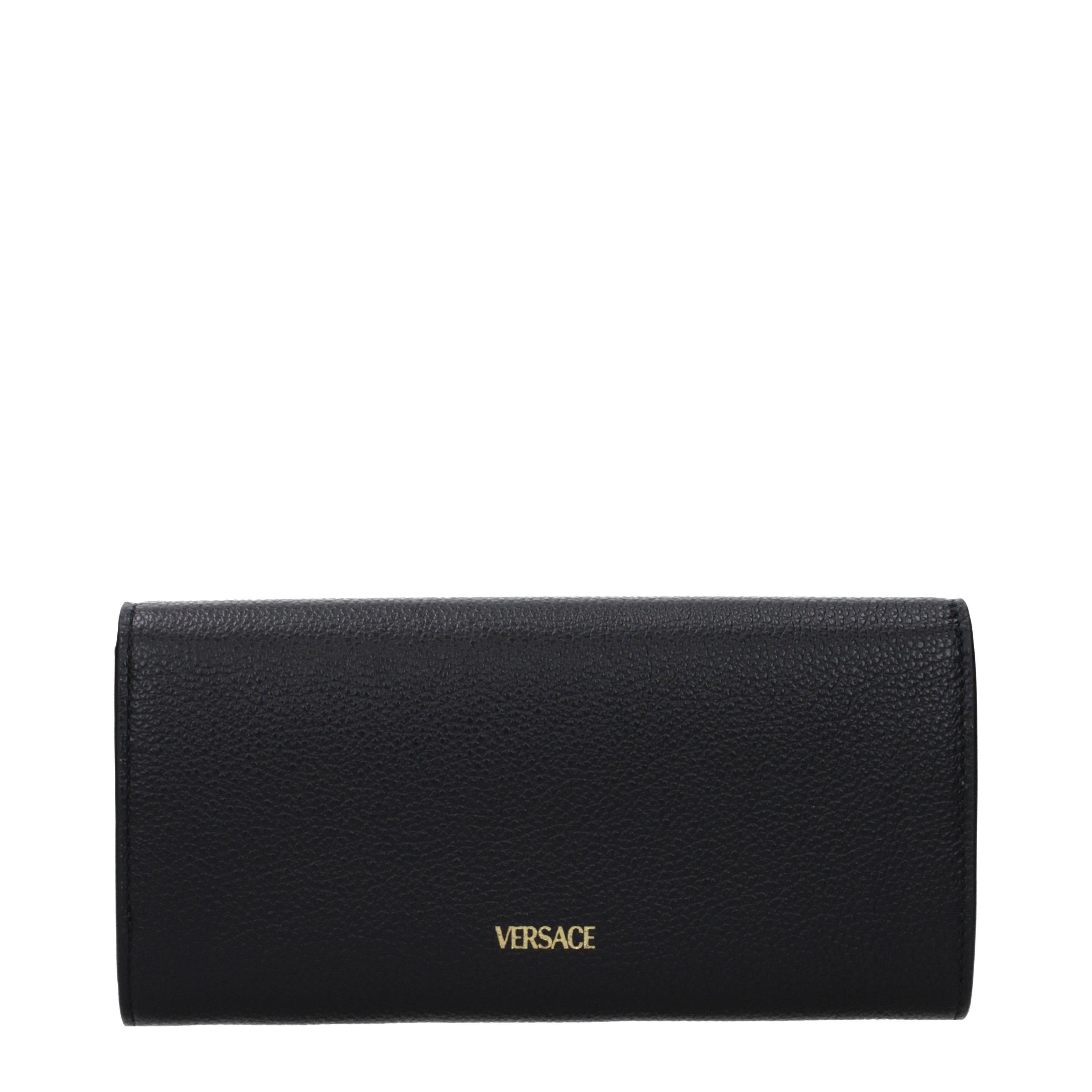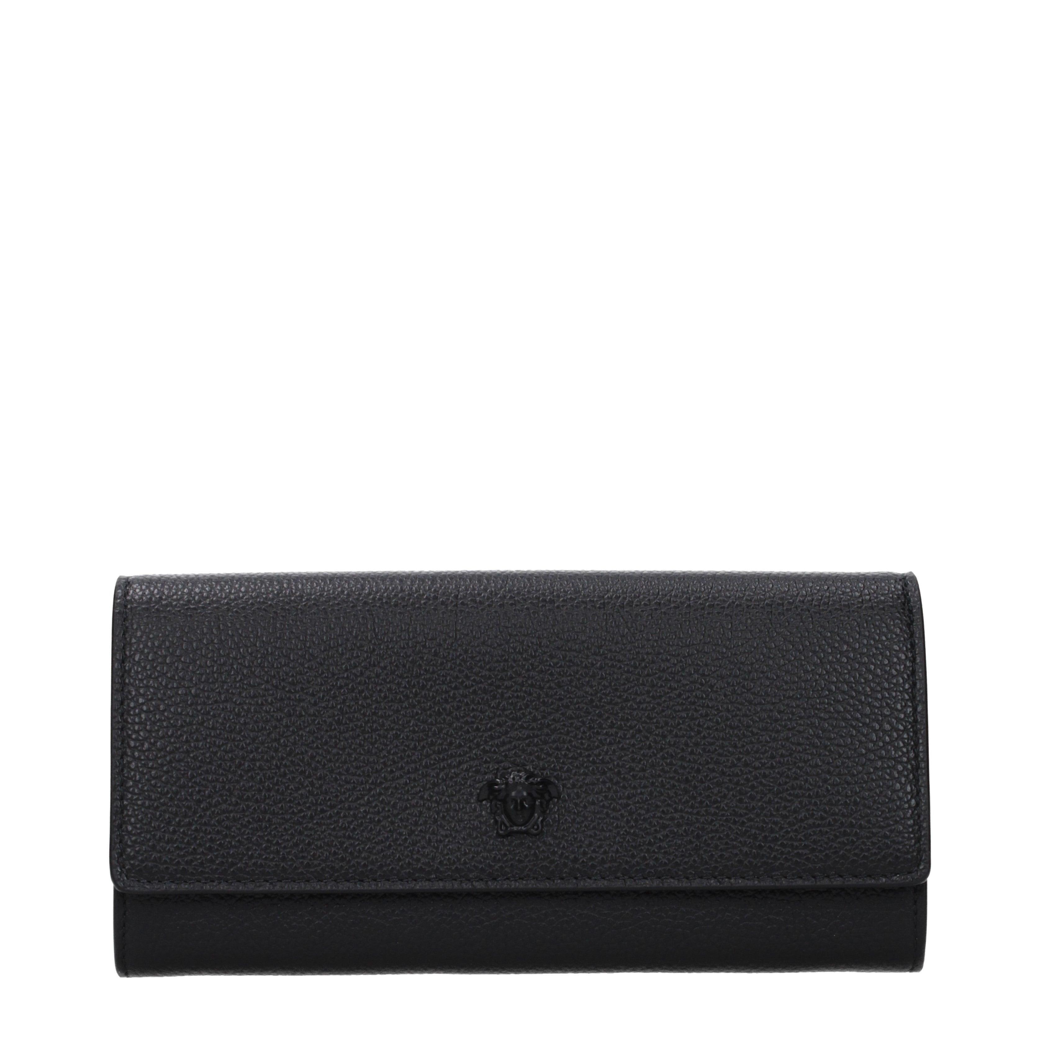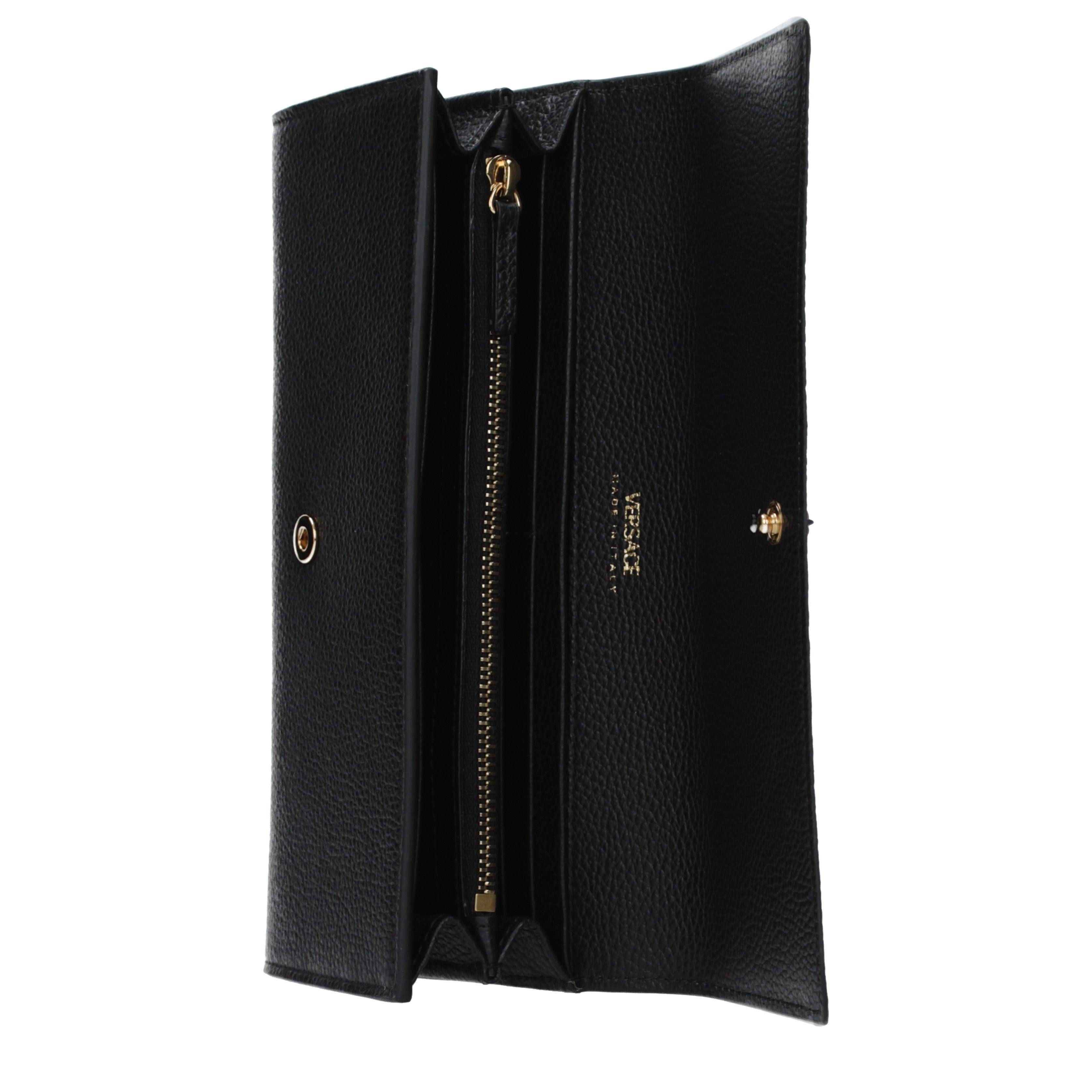 This VERSACE wallet showcases a rigorous approach to design, centered around the house's legendary emblem. The exterior features a distinct pebbled texture that highlights the depth of the leather, providing a grippy yet refined surface. Its long, rectangular silhouette is secured by a discreet button closure, maintaining a sleek aesthetic while protecting the internal contents during daily use.