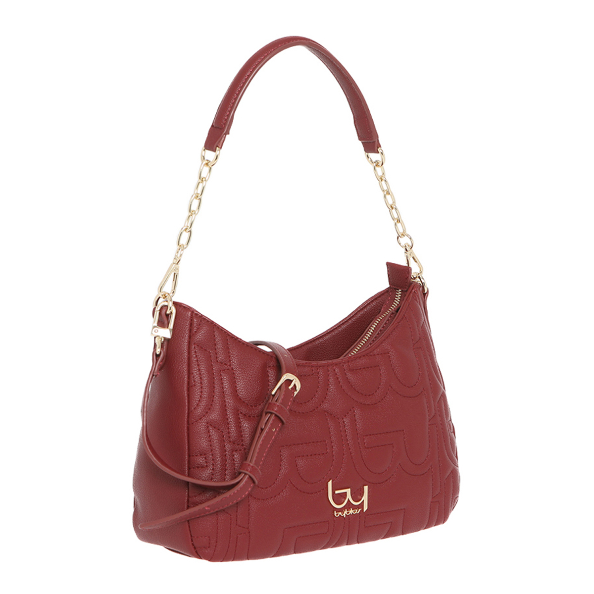 Este bolso de hombro Turchese de Byblos destaca por su silueta arqueada y su intrincado patrón de monograma pespunteado que aporta relieve y textura. El logotipo metálico frontal y los eslabones dorados de la correa añaden un brillo distinguido a la construcción general de la pieza, ofreciendo una opción versátil para escaparates de moda exigentes.