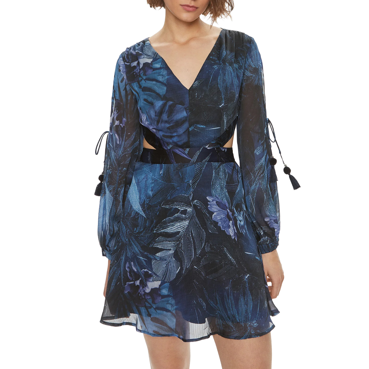 VESTIDO CORTO, MUJER, CUELLO EN V, MANGA LARGA, FANTASÍA, BICOLOR, CIERRE CON ZIP