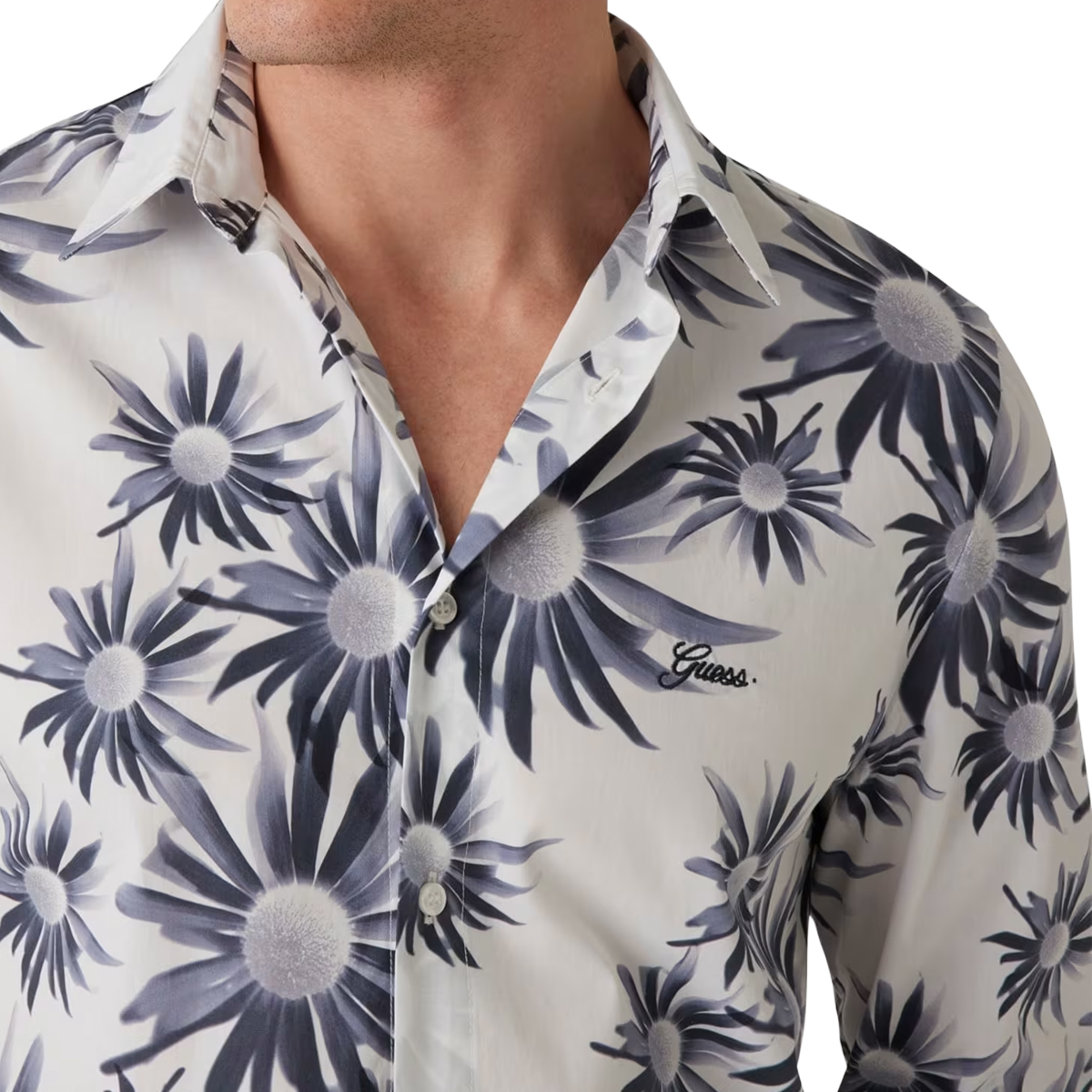 Esta camisa QUID JACK LS SHIRT de GUESS destaca por su meticulosa confección Made in ITALY, presentando un patrón floral bicolore que recorre toda la prenda de forma armoniosa. La estructura incluye un collo classico y puños definidos en sus manica lunga, subrayando una atención al detalle excepcional en cada costura y en la disposición de su cierre central.