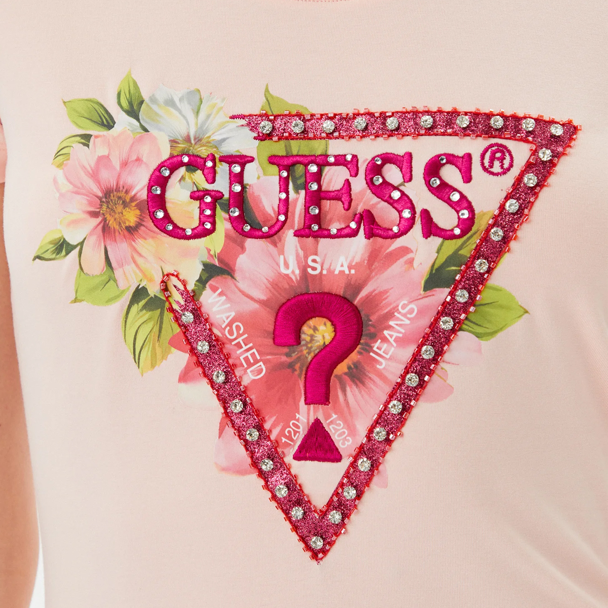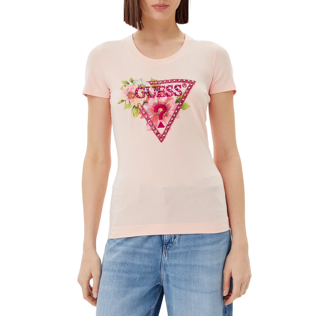 Esta T SHIRT SS CN TRIANGLE BEADS TEE de GUESS es una pieza que resalta por su construcción detallada y su estética contemporánea. La silueta se define por un corte entallado que realza la figura, mientras que el pecho presenta el emblemático logo triangular decorado con cuentas brillantes y elementos botánicos, aportando un aire distinguido que atrae todas las miradas en cualquier escaparate profesional.
