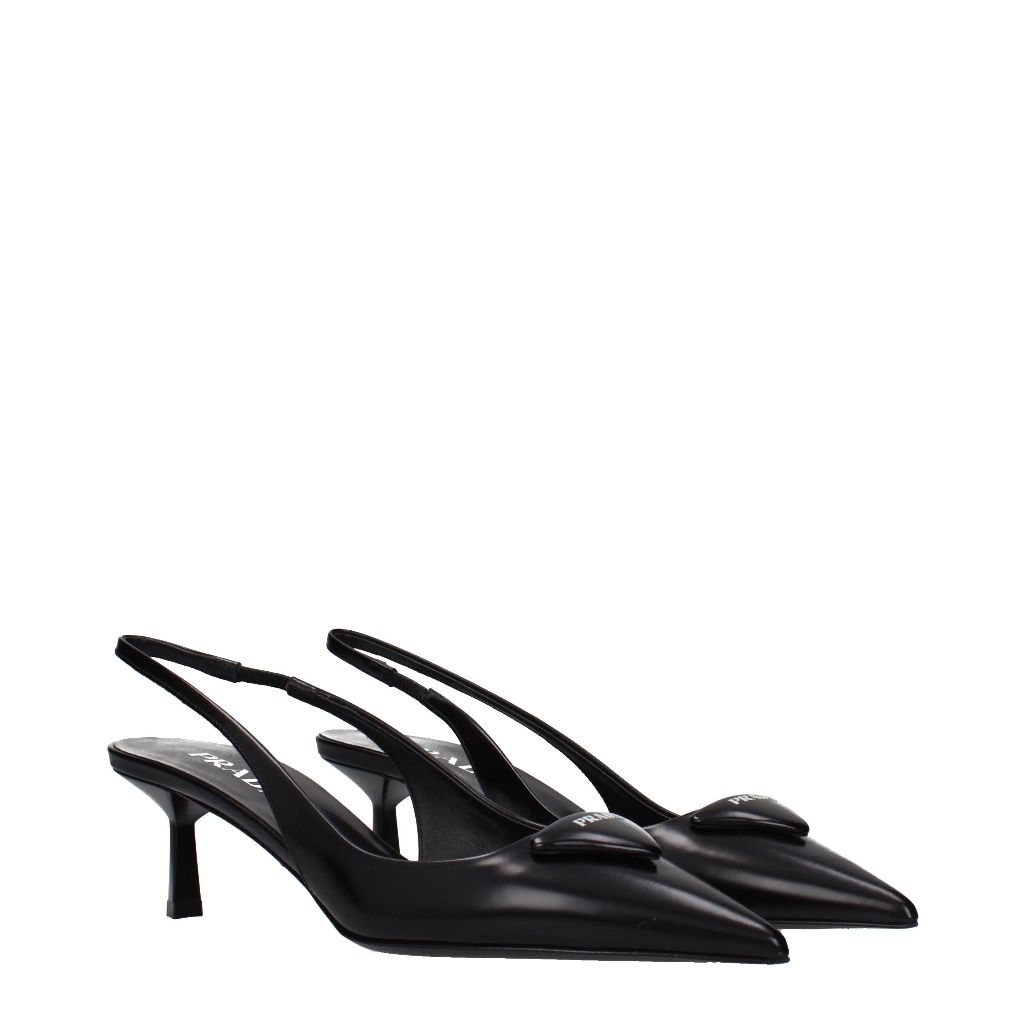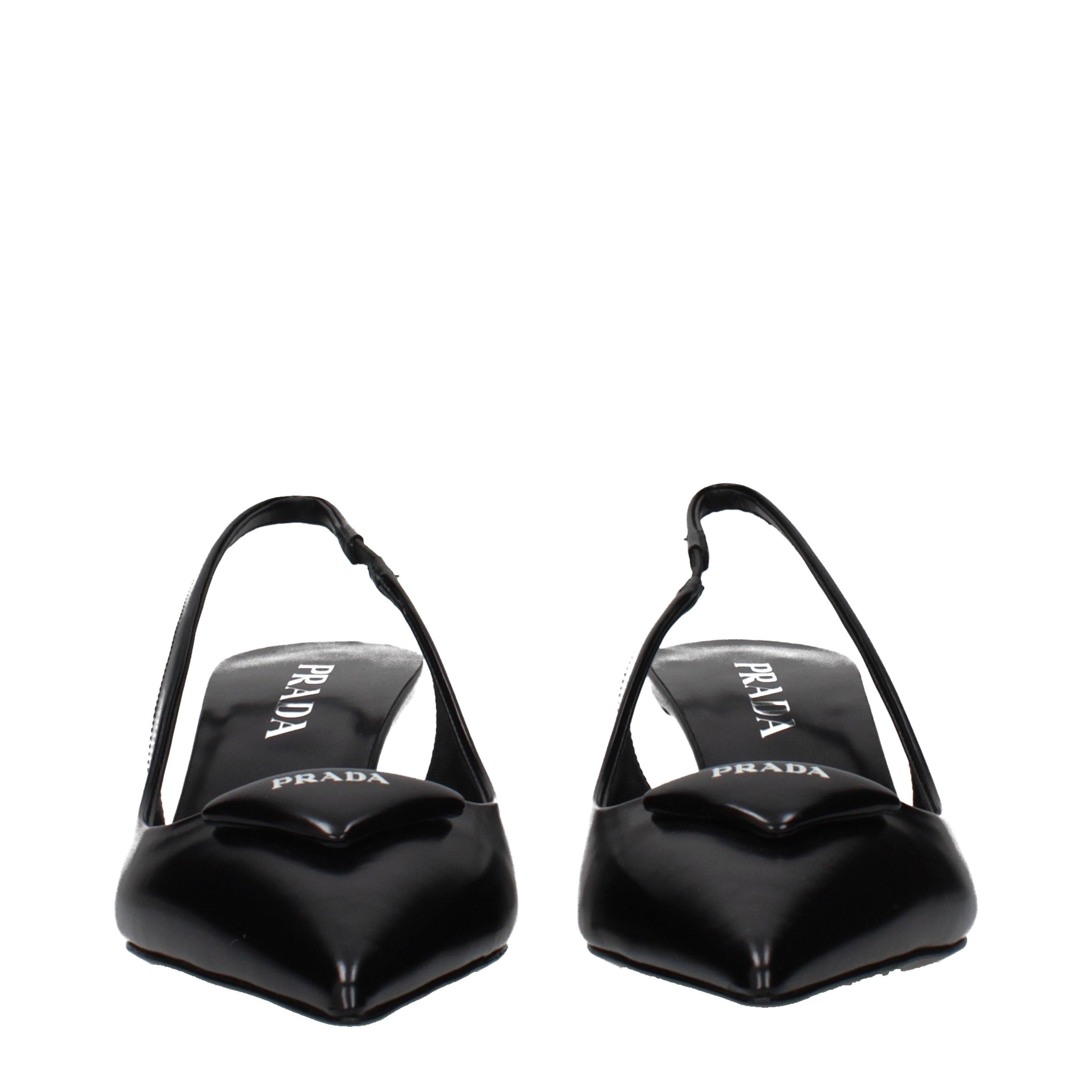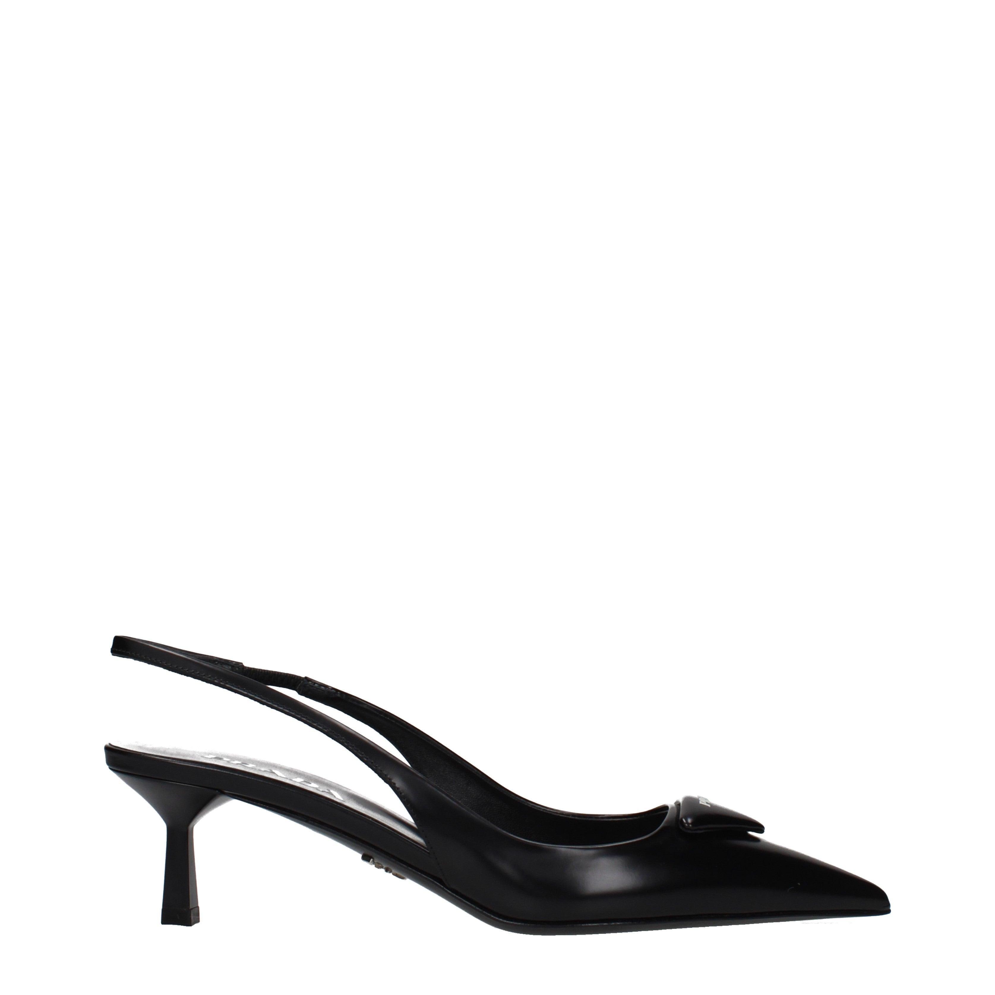 La propuesta de calzado de PRADA destaca por su silueta de líneas limpias y una construcción atemporal. Estos zapatos presentan una punta afilada y un tacón de altura media que equilibra la comodidad con una estética formal. El cierre tipo slingback se integra suavemente en el diseño, proporcionando una estructura ligera pero firme.