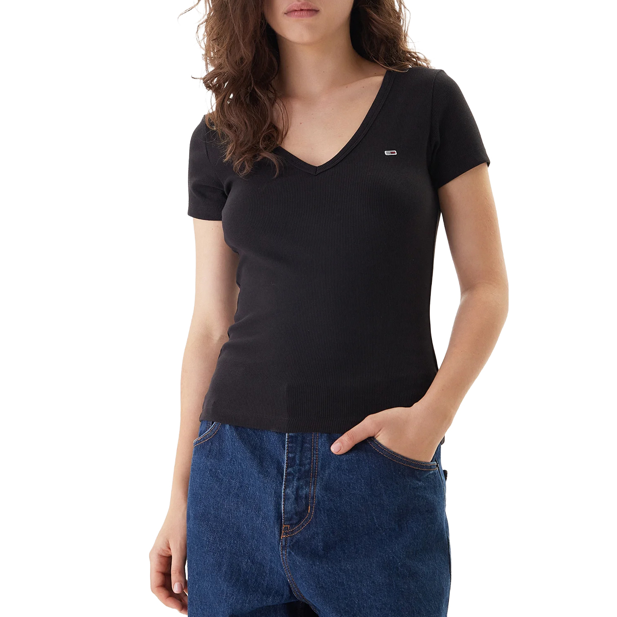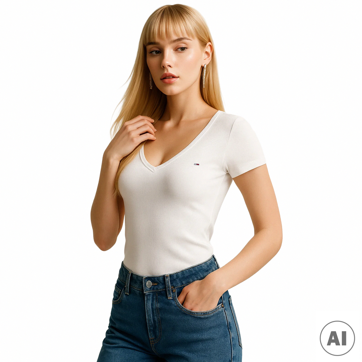 CAMISETA, MUJER, CUELLO EN V, MANGA CORTA, SOLO COLOR, CON LOGO