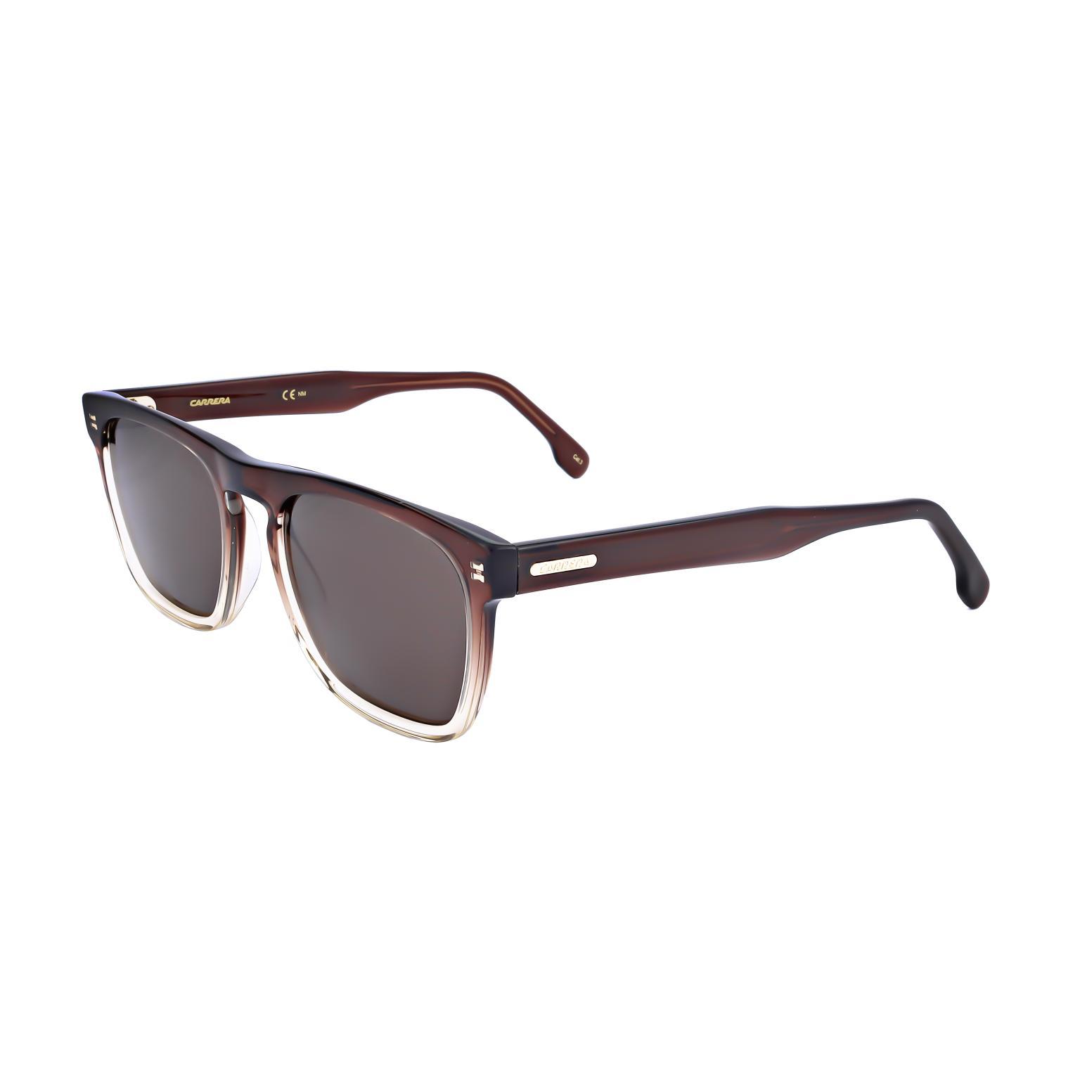 Ces lunettes de soleil Carrera présentent une monture à la géométrie épurée, offrant une allure sophistiquée avec des angles adoucis pour une présence affirmée. Le pont sculpté et les charnières apparentes, renforcées par des rivets métalliques, témoignent d'une attention particulière portée à la solidité de la construction. Le dégradé subtil de la monture enrichit visuellement le design, créant une impression de mouvement.