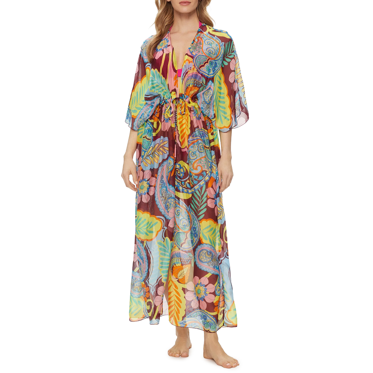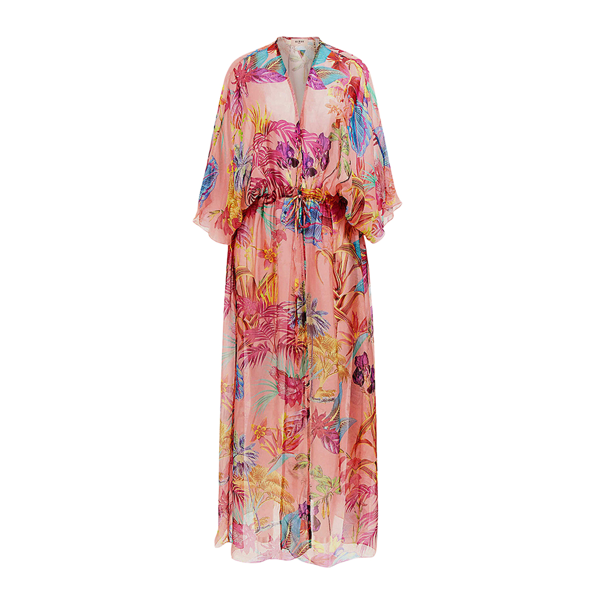 Cette robe de plage GUESS se distingue par son volume généreux et sa fabrication de prestige en ITALIE. Dotée de manches trois-quarts évasées et d'un cordon de serrage à la taille, elle propose une coupe aérienne qui s'ajuste pour souligner la silhouette avec élégance. La transparence du tissu laisse deviner un travail de construction soigné, où chaque couture participe à l'équilibre visuel de cette pièce longue e vaporeuse.