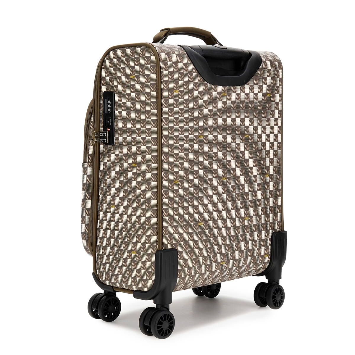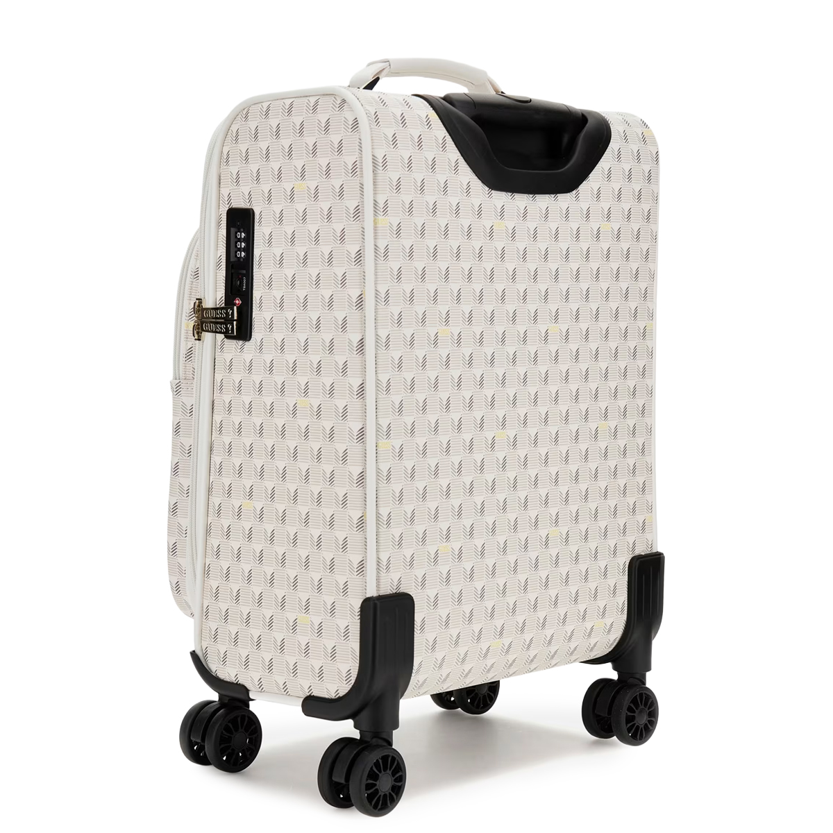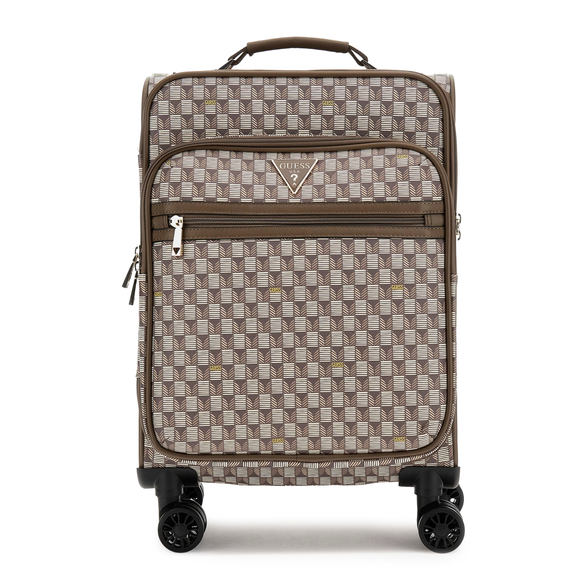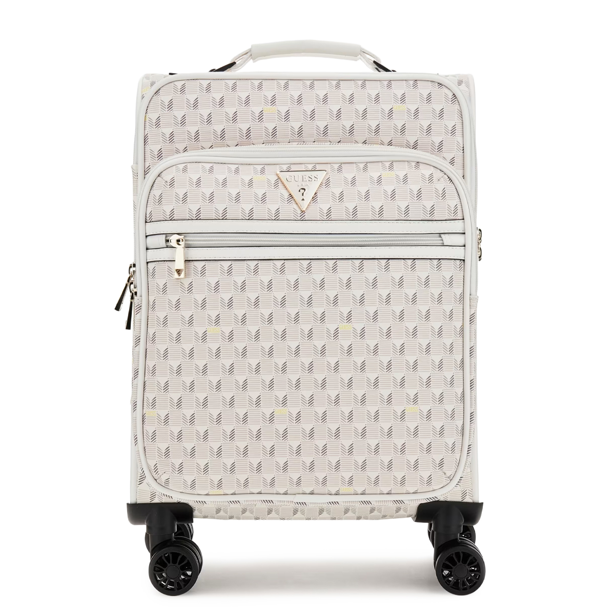 Ce CABIN TROLLEY NOROM 18 IN UPRIGHT 8-WHEELER de GUESS est un bagage cabine qui privilégie une allure structurée et une organisation rigoureuse. On remarque immédiatement le logo triangulaire emblématique qui orne la face avant, ainsi que les poches zippées horizontales qui permettent de compartimenter efficacement les effets personnels.