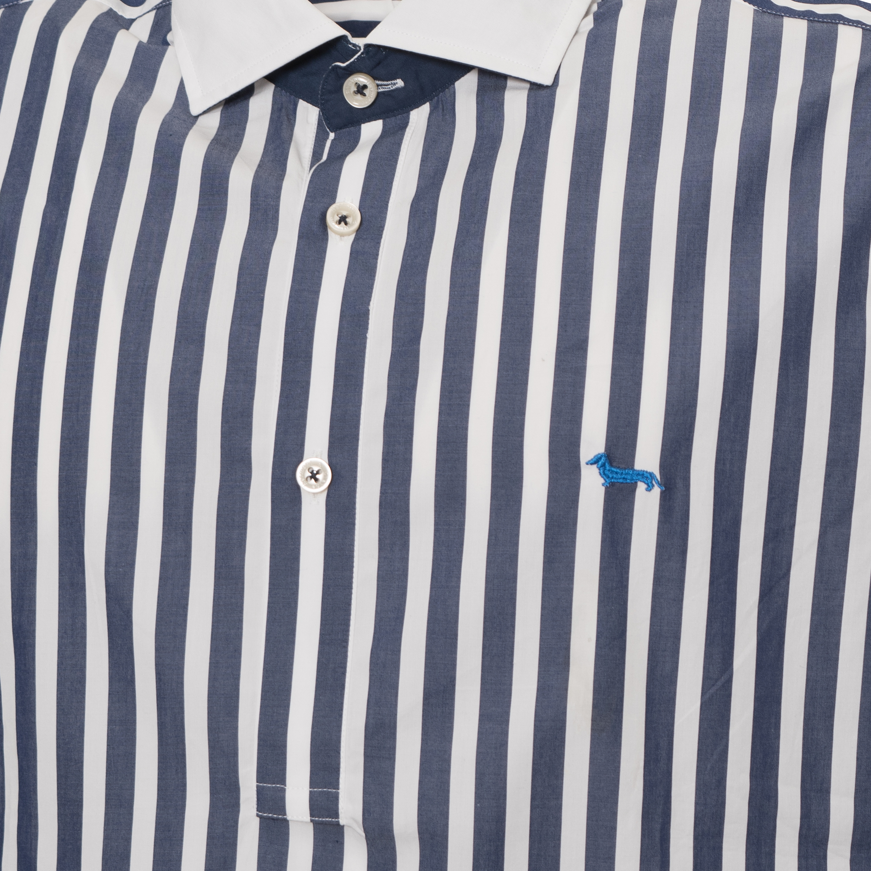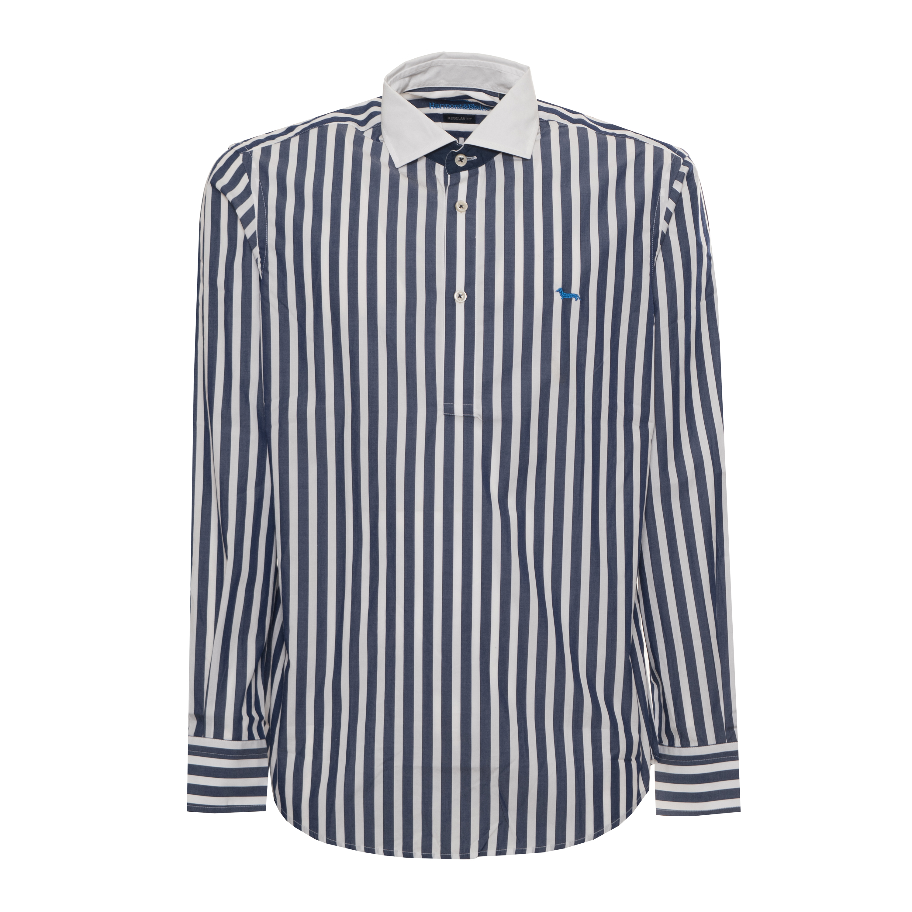 La silhouette de cette chemise à manches longues Harmont & Blaine s'appuie sur une coupe droite et une encolure boutonnée façon polo. Confectionné en coton naturel, ce vêtement affiche des rayures verticales régulières qui contrastent avec un col contrasté. Les finitions des poignets adoptent une orientation graphique différente, apportant une dynamique visuelle aux bras. La fermeture partielle sur le devant assure une allure épurée. Un petit motif animalier brodé sur la poitrine complète l'ensemble avec une précision artisanale, soulignant le caractère unique de cette pièce.