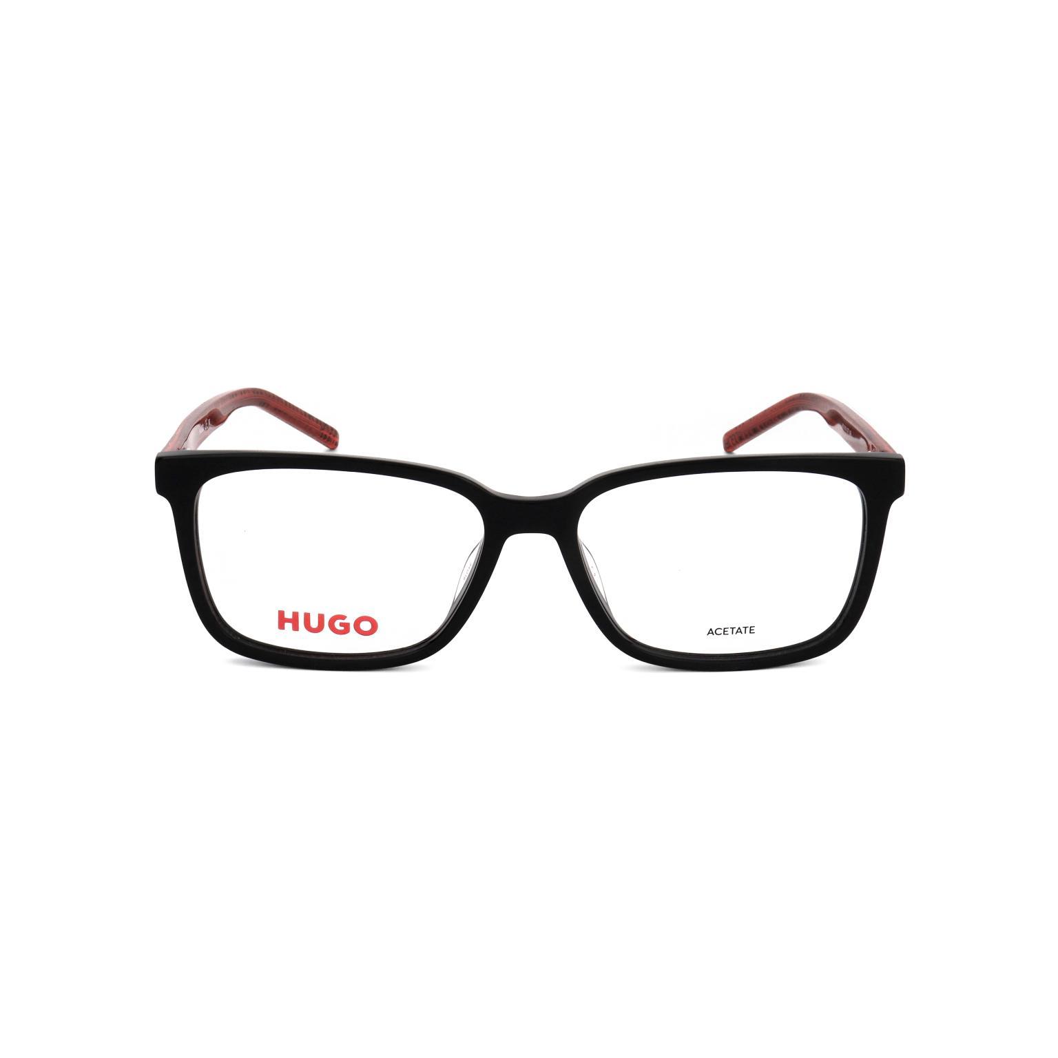 Ces lunettes HUGO se distinguent par une monture imposante aux lignes horizontales marquées, offrant un profil à la fois sobre et affirmé. La conception met en avant des cercles épais qui encadrent les verres de 53 mm, créant une structure visuelle forte qui s'adapte à diverses morphologies grâce à une ingénierie de précision. Le design évite tout ornement superflu pour se concentrer sur la pureté de la forme.