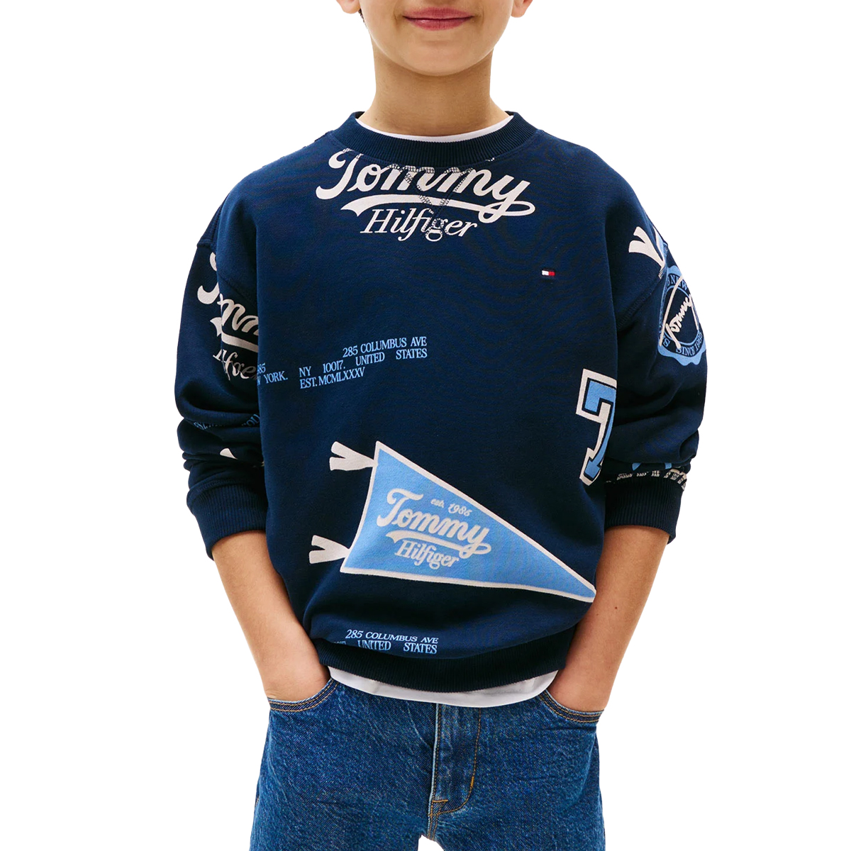 Ce sweat-shirt ALL OVER PRINTED SWEATSHIRT de TOMMY HILFIGER est une pièce forte qui privilégie une allure structurée grâce à ses finitions en maille côtelée au col et aux poignets. Les imprimés variés, incluant des fanions et des logos d'archives, sont disposés de manière asymétrique pour créer un rythme visuel captivant sur l'ensemble de la coupe décontractée.