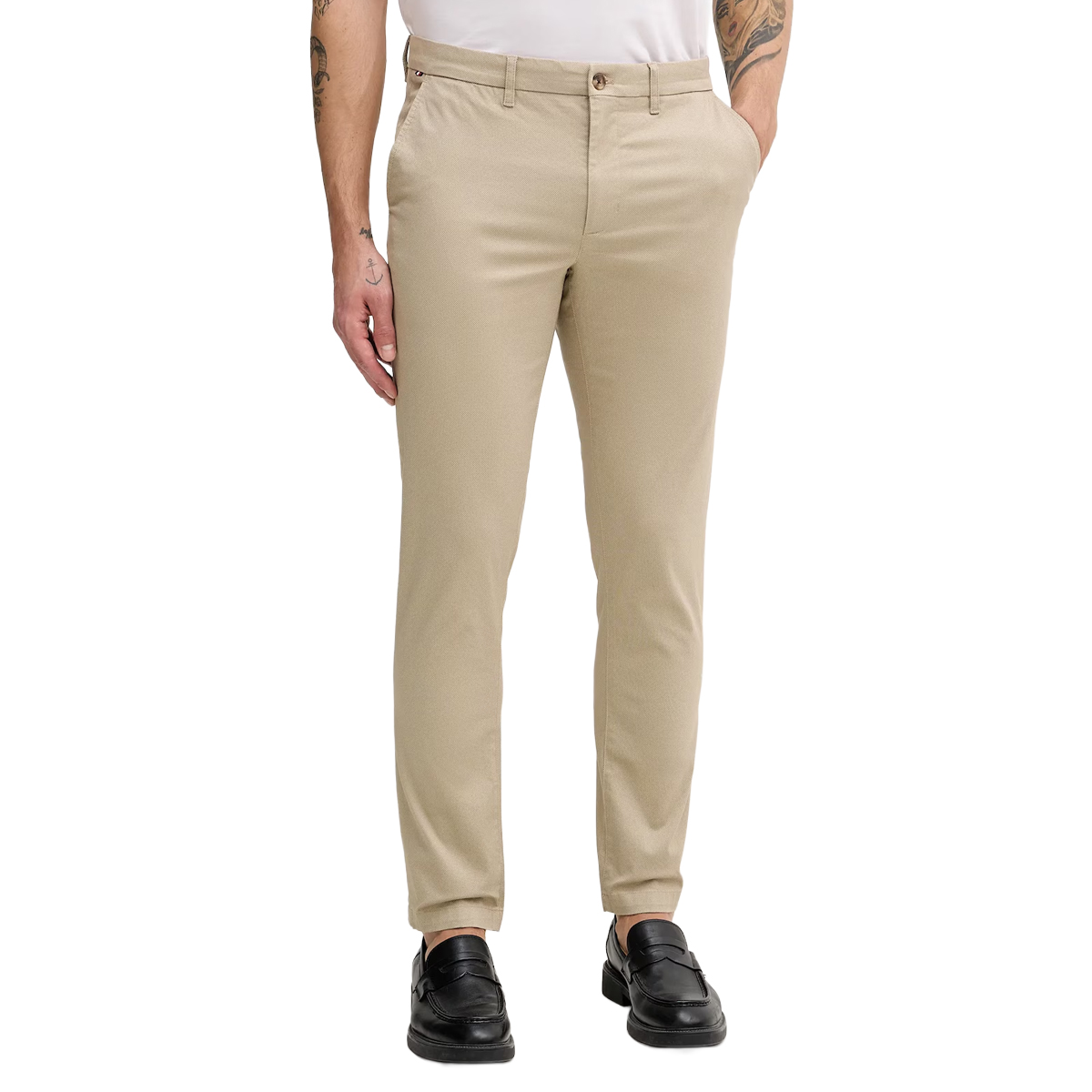 Ce PANTALONI BLEECKER PRINTED STR, DW5 de TOMMY HILFIGER est une pièce à la coupe ajustée qui souligne une allure moderne et soignée. Son design épuré, caractérisé par des poches discrètes et une fermeture classique par bouton, en fait un élément polyvalent pour une présentation en boutique exigeante. La finesse du grain de la matière suggère une rigueur technique propre aux standards de la marque.