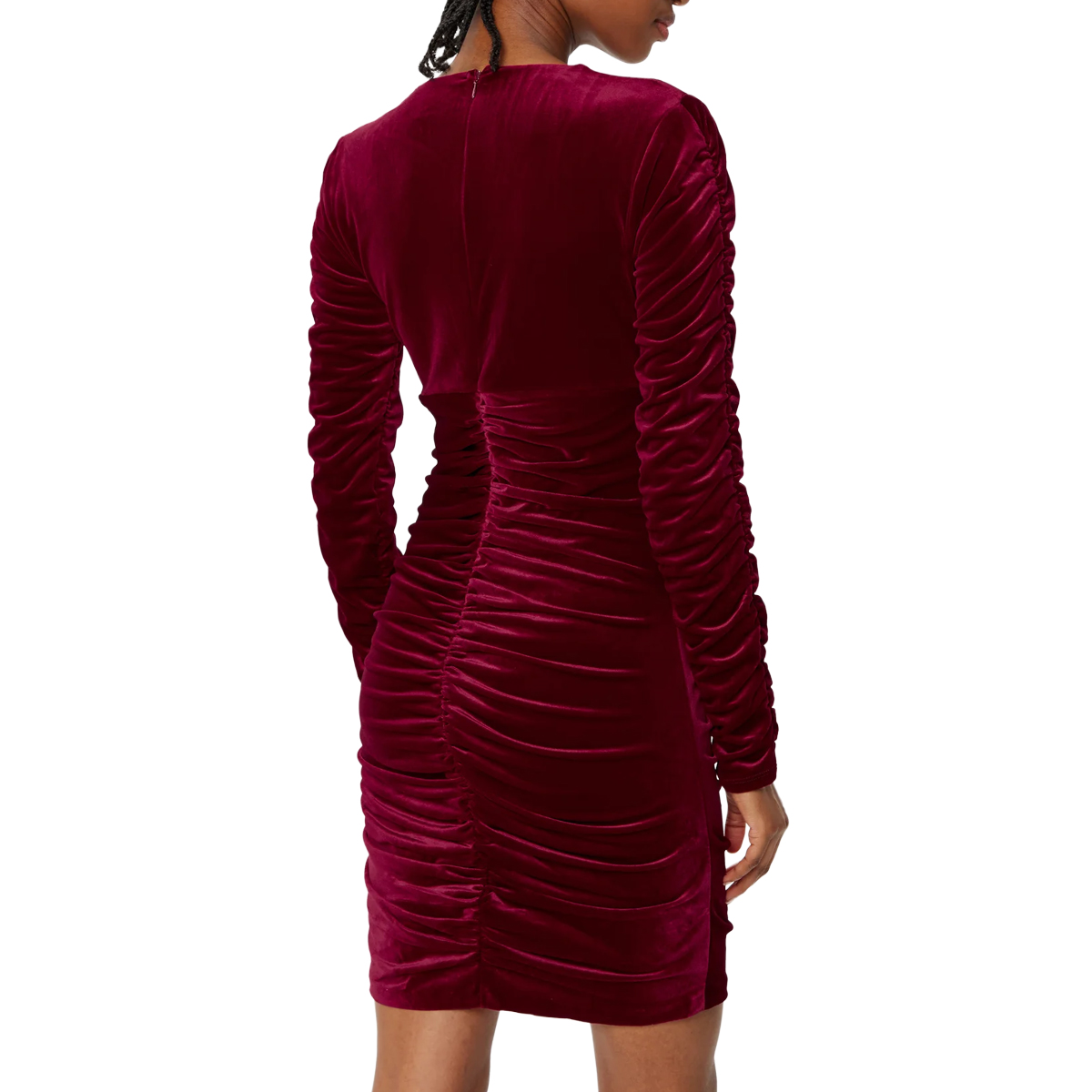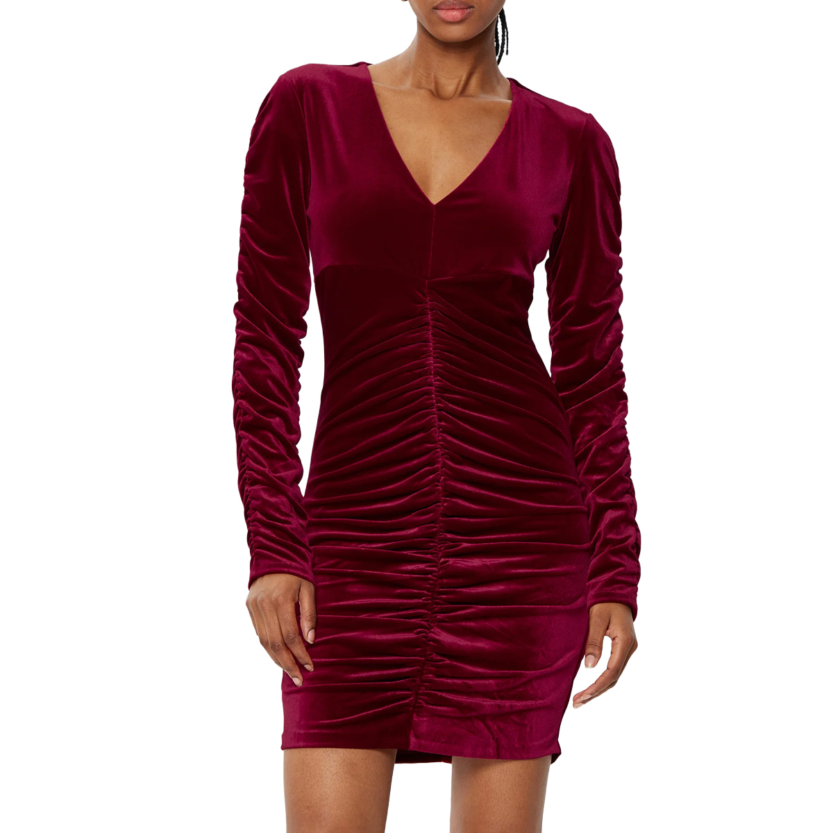 Ez a ruha LS IVANA DRESS a GUESS márkától egy szoborszerű alkotás, amelyet a mély V-kivágás és a látványos középponti ráncolás határoz meg. Az anyag redőzése végigfut a ruha elején és a hosszú ujjakon is, ami különleges vizuális rétegzettséget kölcsönöz a megjelenésnek. A hátoldalon elhelyezett cipzár precíz és diszkrét záródást tesz lehetővé.