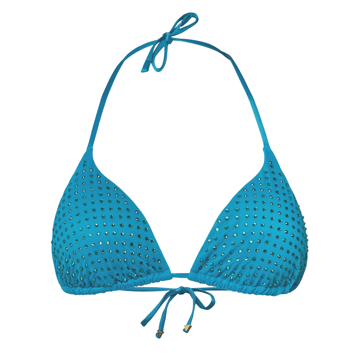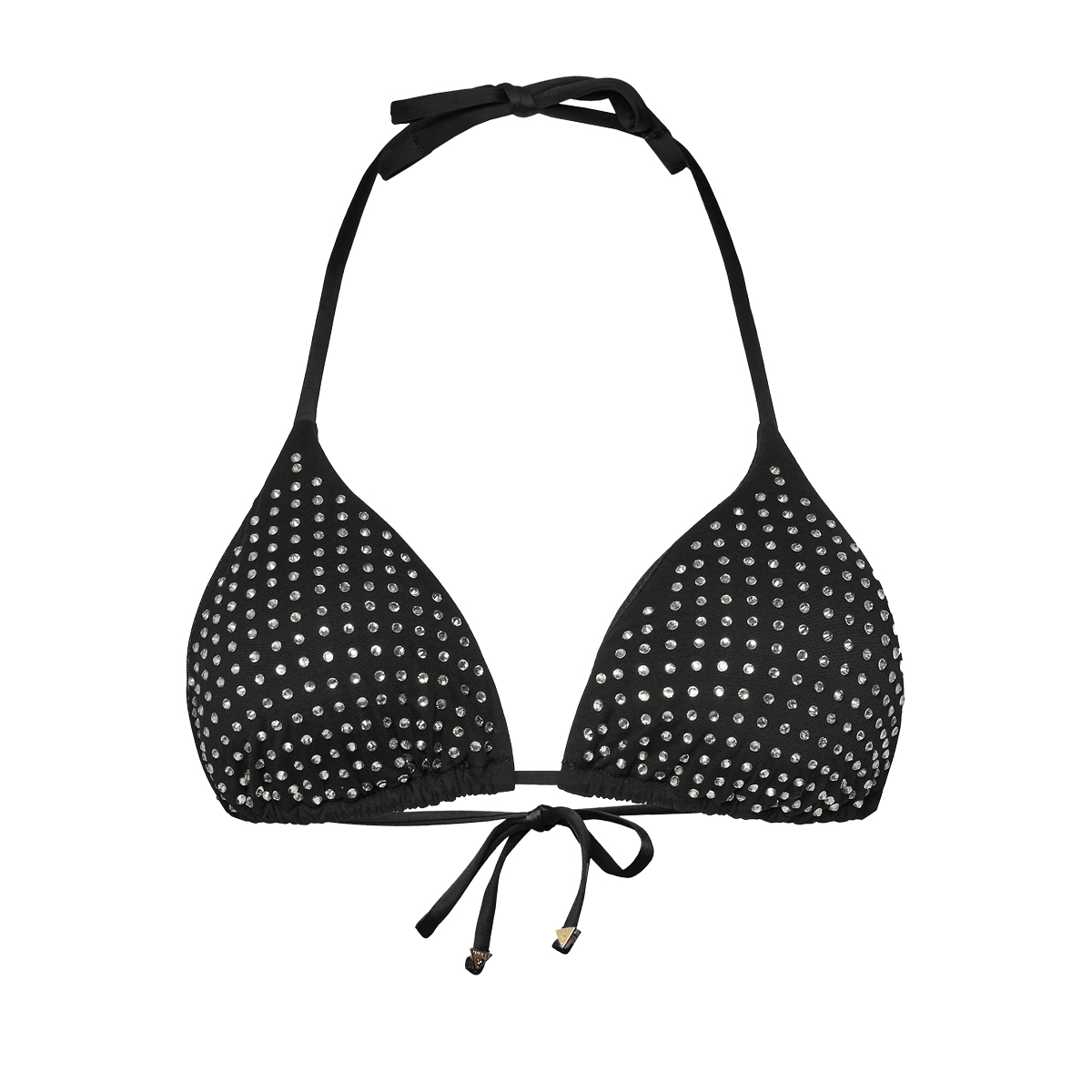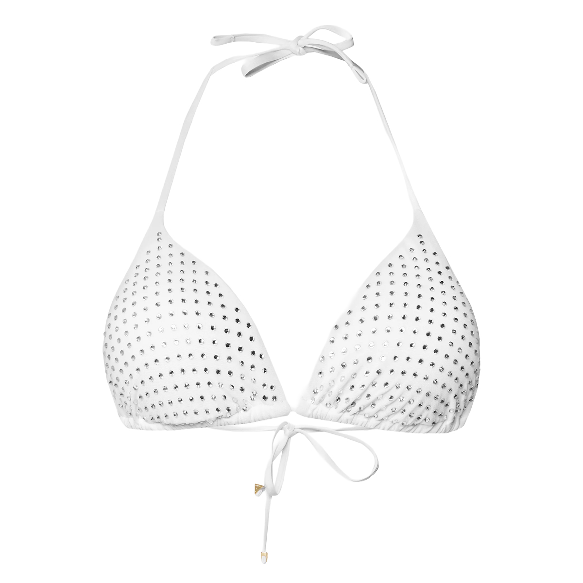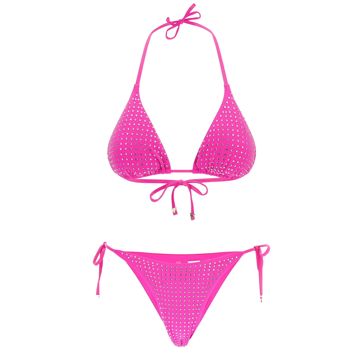 Ez a GUESS bikini a klasszikus háromszög fazont ötvözi a modern, magasított V-kivágású alsórésszel. A teljes felületet apró, csillogó díszítések borítják, amelyek különleges textúrát kölcsönöznek az egyszínű alapnak, tükrözve a márka elkötelezettségét a dekoratív részletek iránt.