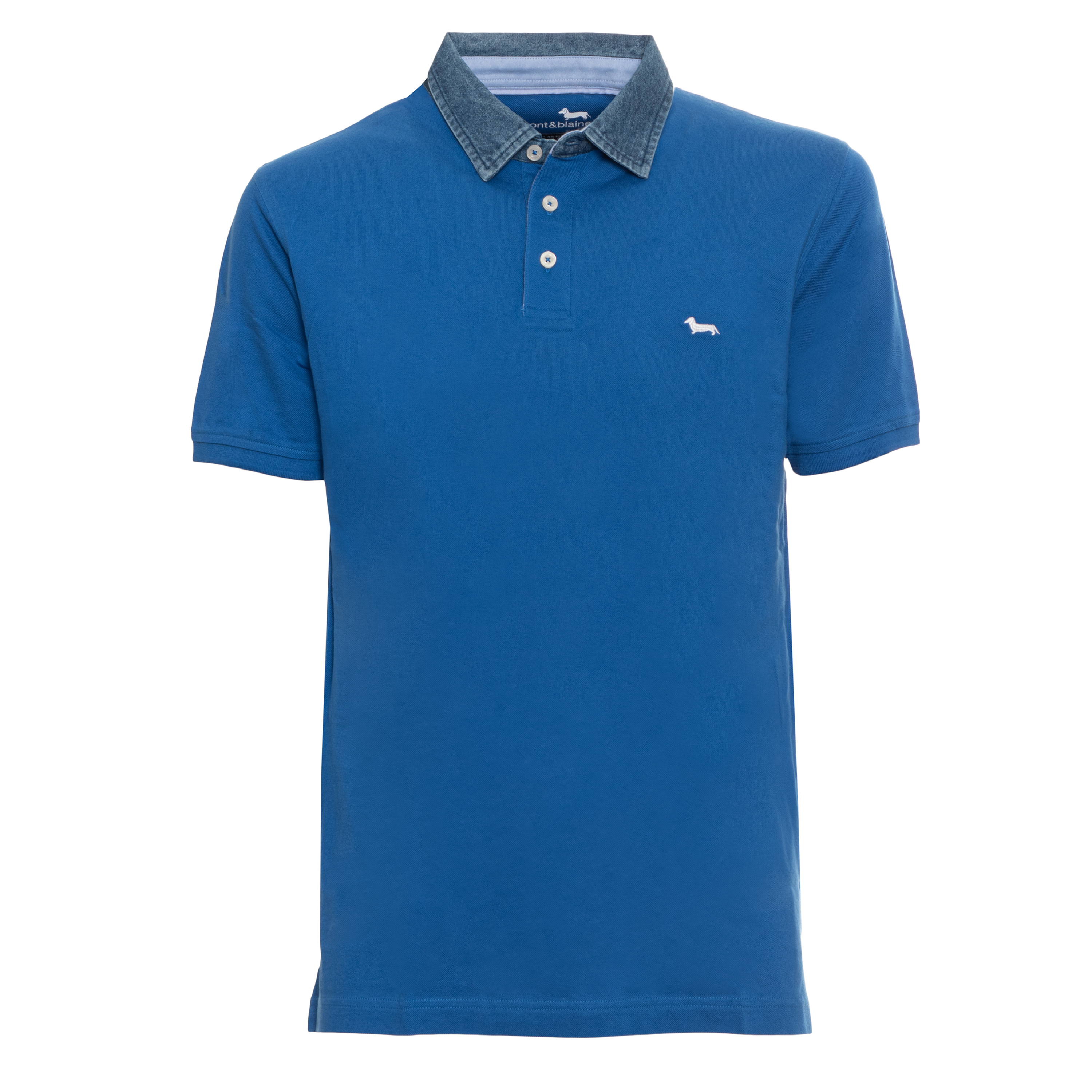 Rövid ujjú, tiszta pamutból készült ez a Harmont & Blaine pólóing, biztosítva a természetes tapintást. A ruhadarab legfőbb jellegzetessége a denim textúrájú gallér, amely gombokkal rögzíthető a szárak végén. A normál szabásvonalat háromgombos záródás és bordázott passzéval ellátott ujjvégek egészítik ki. A mellrészen a márka jellegzetes tacskó logója látható hímzett kivitelben. Az alsó szegélynél található oldalsó hasítékok segítik a szabad mozgást, miközben megtartják a póló strukturált megjelenését. Minden öltés a precíz kidolgozást tükrözi.