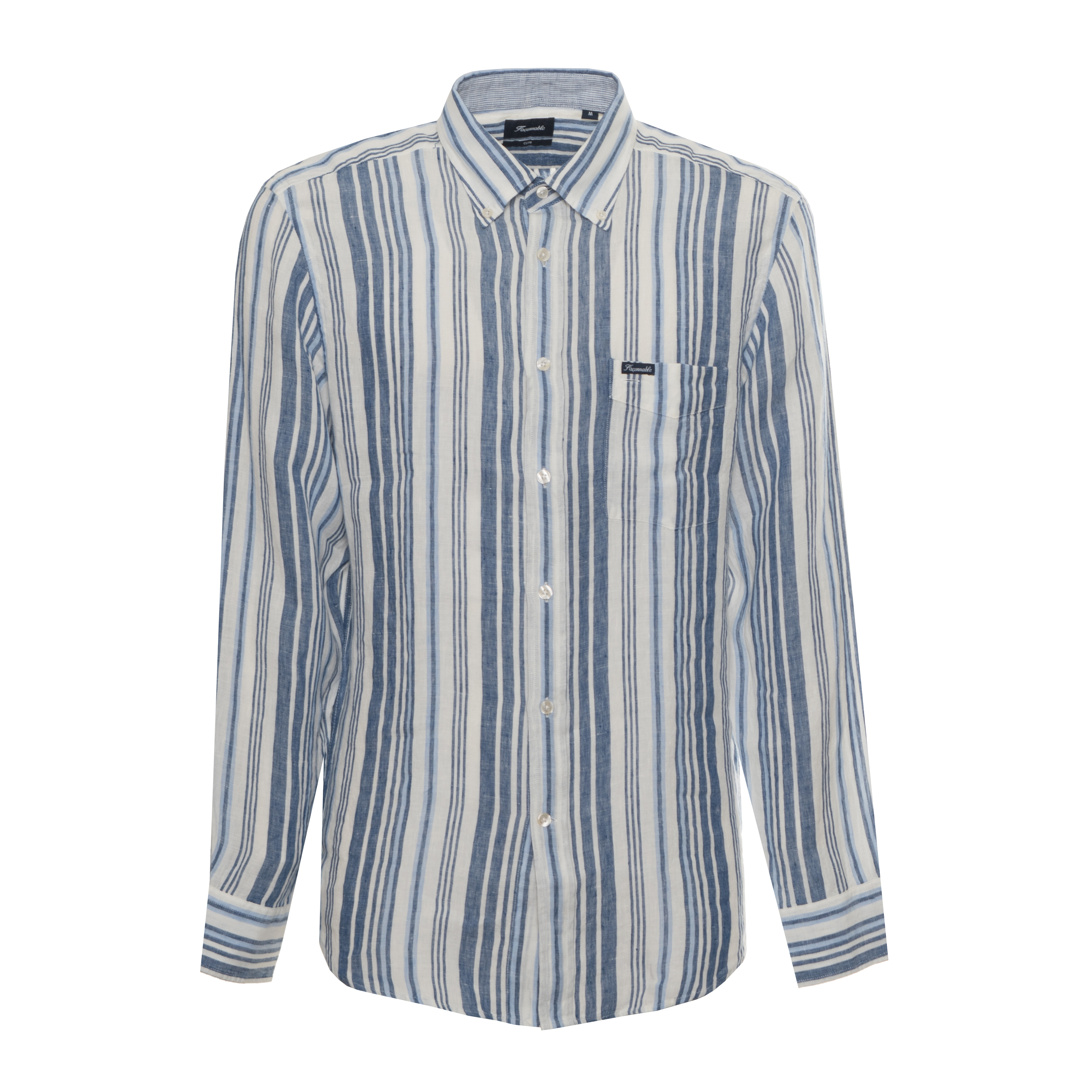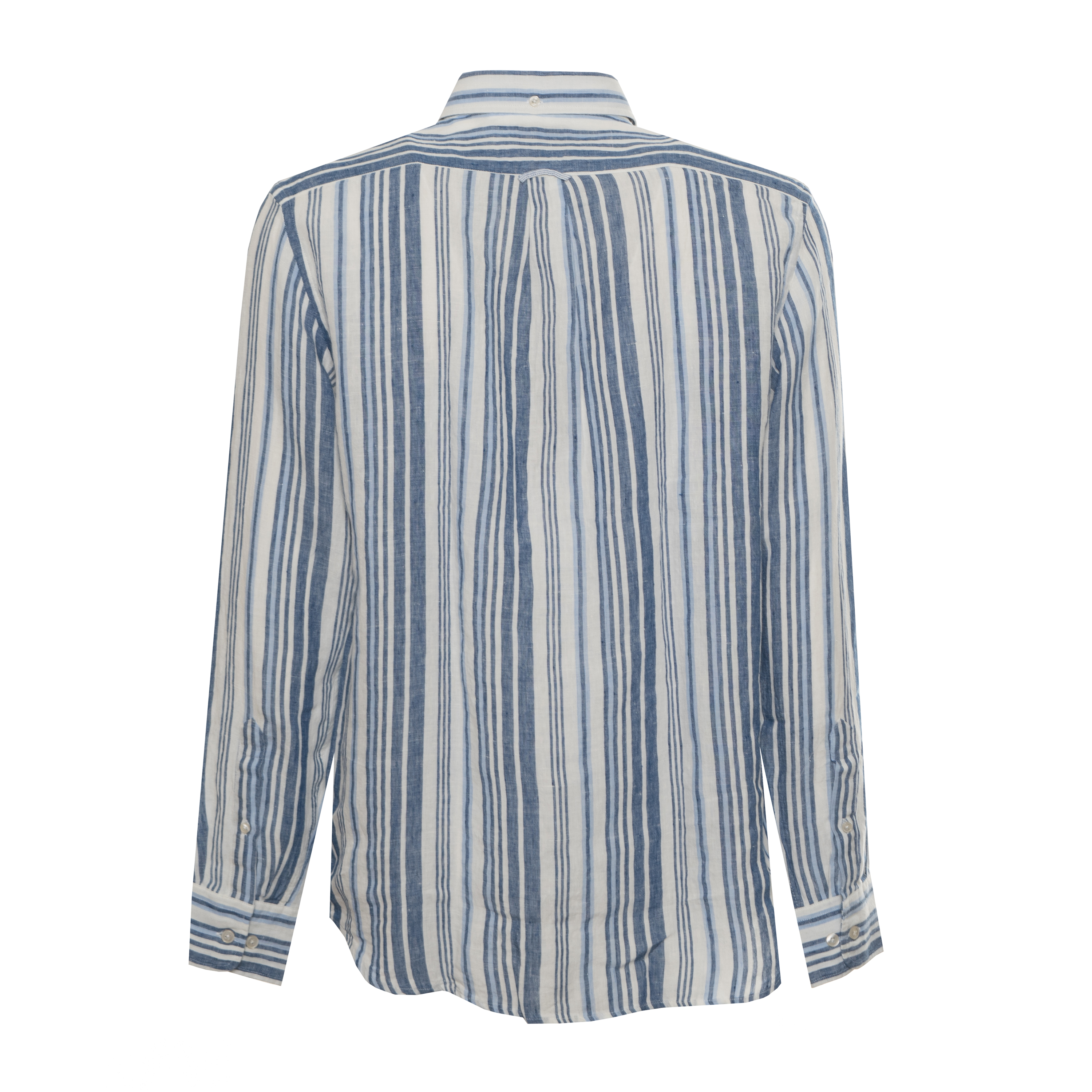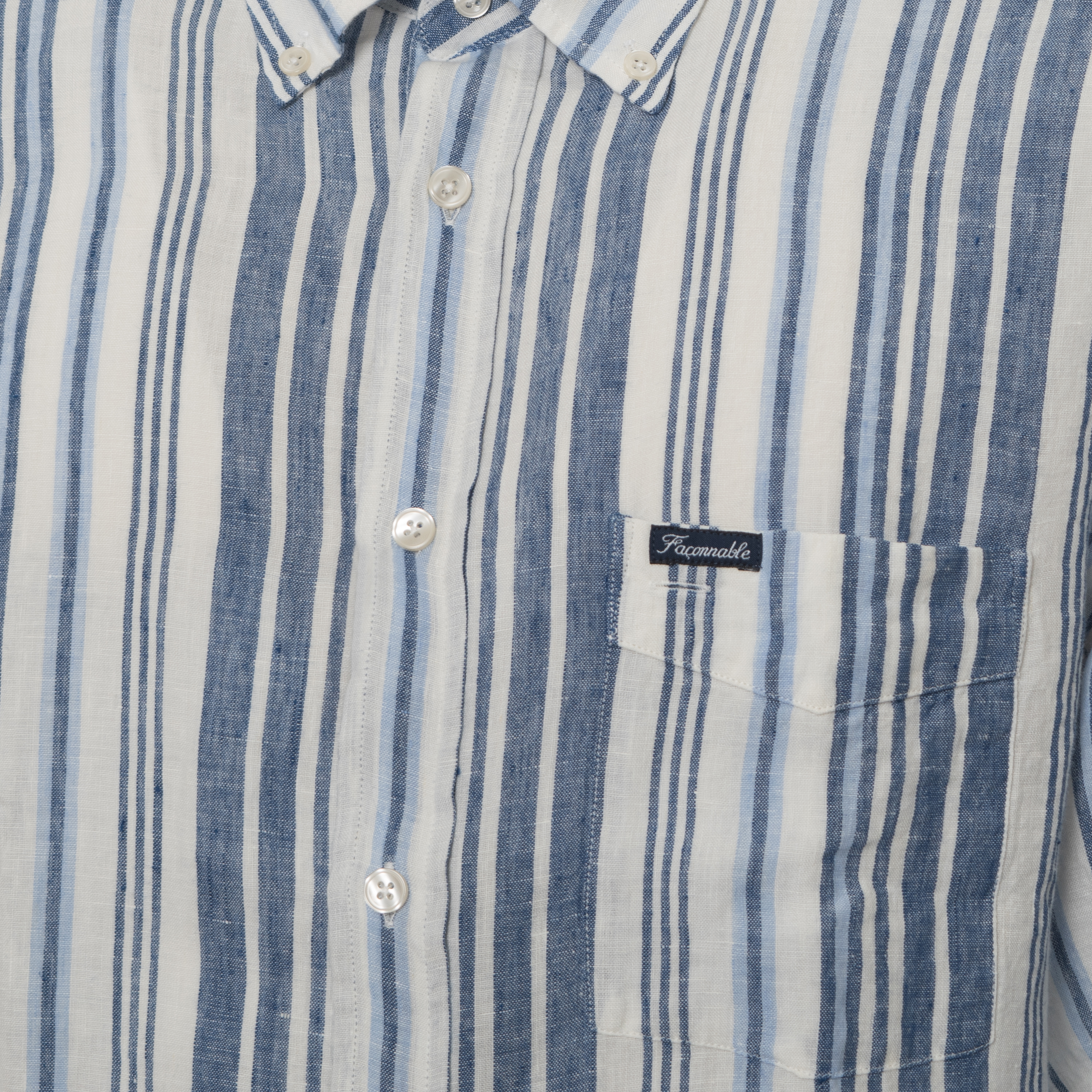 Questa camicia CLUB BD SPW LINEN MU di FACONNABLE è un esempio di sartoria rilassata ma curata. Il colletto button-down e il taschino applicato definiscono un'estetica classica, mentre il motivo a righe verticali conferisce un ritmo visivo ordinato e distinto. La cura nei dettagli si riflette nelle cuciture precise e nella disposizione simmetrica degli elementi decorativi.
