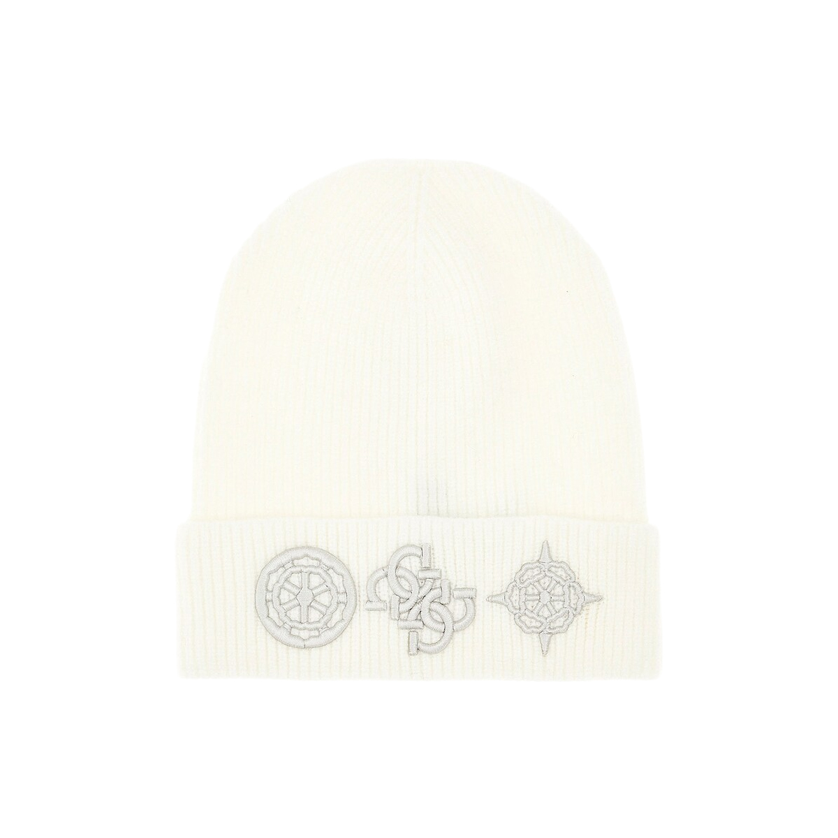 Un berretto dalla linea classica caratterizzato da una lavorazione a solchi che conferisce elasticità e struttura. GUESS propone questo accessorio con un ampio risvolto alla base, arricchito da tre motivi ricamati centrali che includono il monogramma del brand e simboli ornamentali. La composizione tessile vede una prevalenza di acrilico e poliestere, integrando poliammide e una percentuale di lana per una mano morbida. La calotta arrotondata assicura un'aderenza naturale, mentre la cucitura posteriore definisce la forma ergonomica del capo.