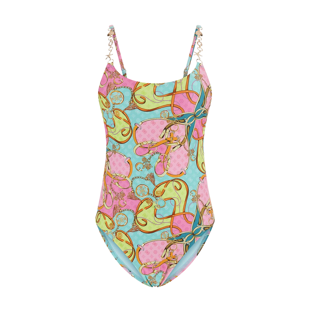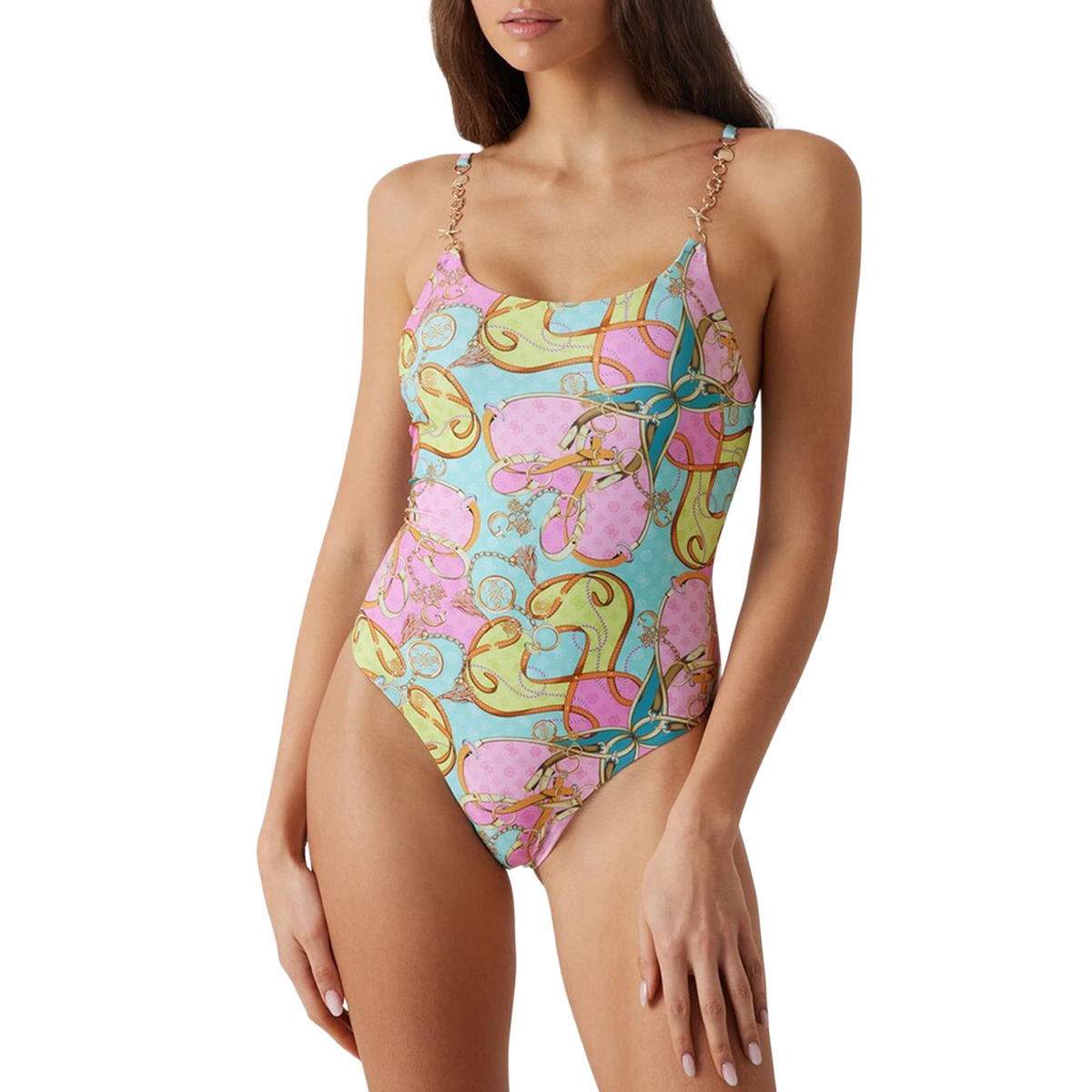 Questo costume intero ONE PIECE di GUESS è un capo dalla struttura definita, progettato per offrire un'estetica ricercata nel settore beachwear. Il taglio si distingue per una sgambatura pronunciata e uno scollo rotondo, bilanciato da spalline sottili realizzate con una catena metallica che conferisce un carattere deciso alla silhouette.