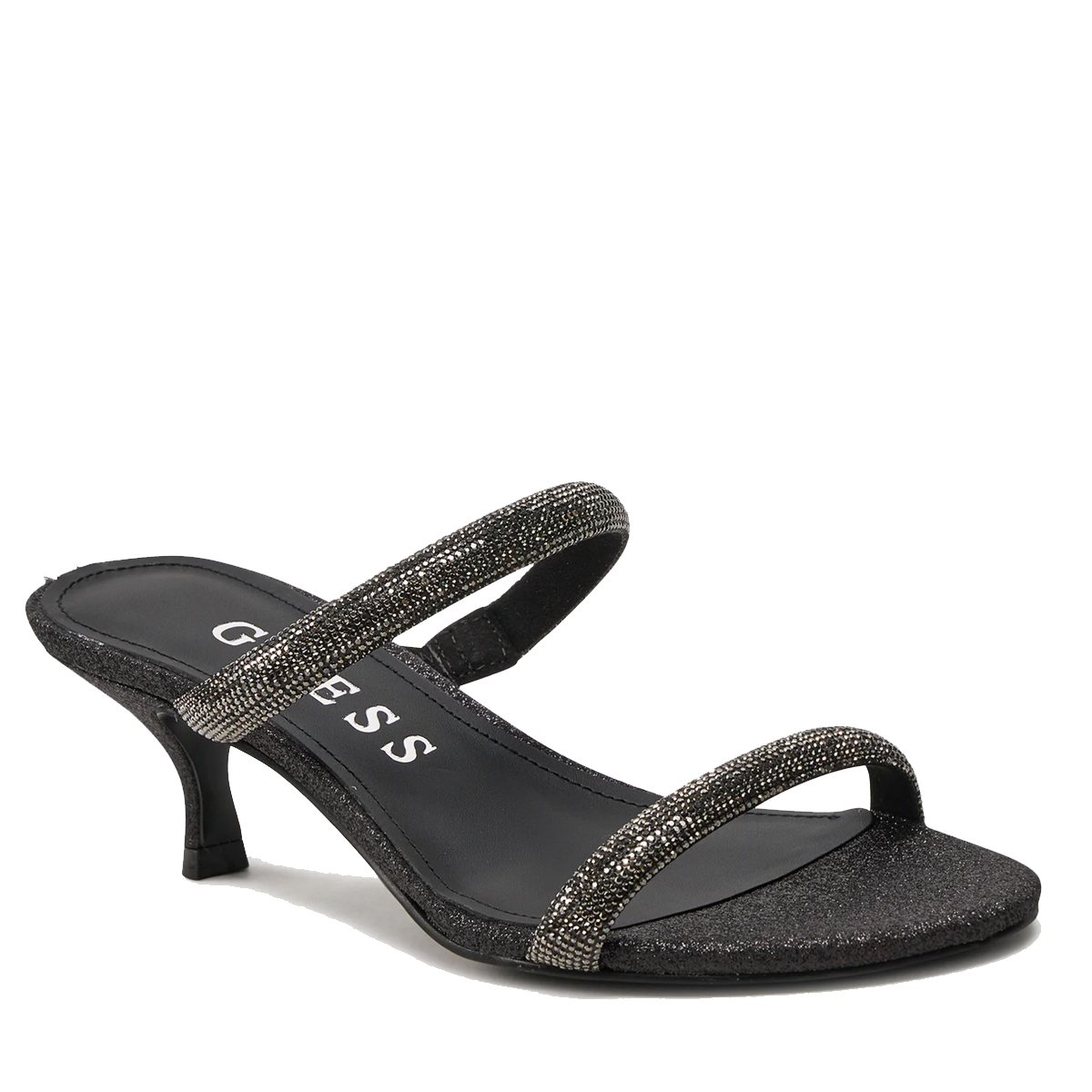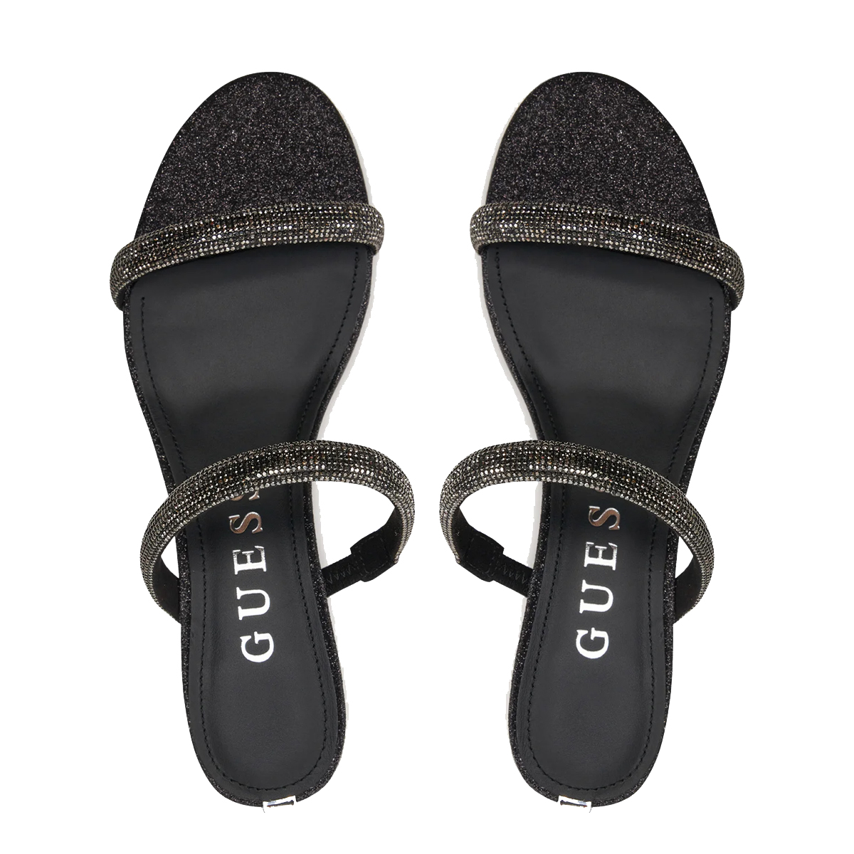 Realizzati in 100% poliestere, questi sandali offrono una superficie resistente e uniforme, trattata per ottenere una finitura brillante che si estende lungo tutta la suola interna. Il logo GUESS impresso sul plantare garantisce il riconoscimento del marchio, mentre la struttura leggera assicura una calzata armoniosa e stabile per contesti formali e cerimonie.