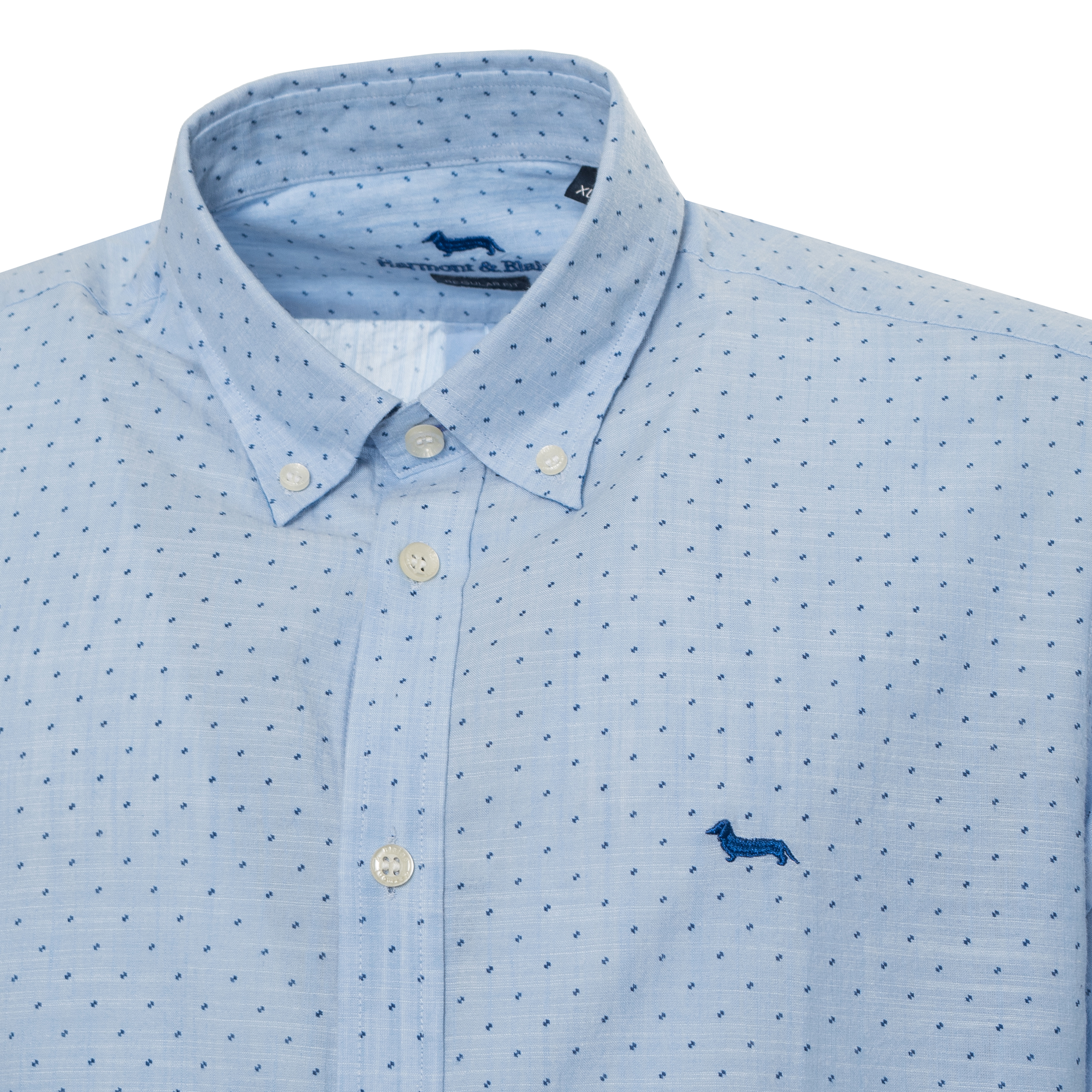 Questa camicia a manica lunga firmata Harmont & Blaine si distingue per un taglio regular fit che assicura comfort e una caduta naturale lungo i fianchi. Il tessuto in puro cotone presenta una trama bicolore composta da micro-motivi geometrici distribuiti uniformemente su tutta la superficie. Il collo button-down conferisce una struttura ordinata, fissata da piccoli bottoni coordinati alla chiusura centrale. Sul petto, l'iconico logo del bassotto è ricamato con cura, aggiungendo un dettaglio distintivo a questa proposta di alta qualità sartoriale. I polsini sono rifiniti con precisione, completando un'estetica bilanciata.