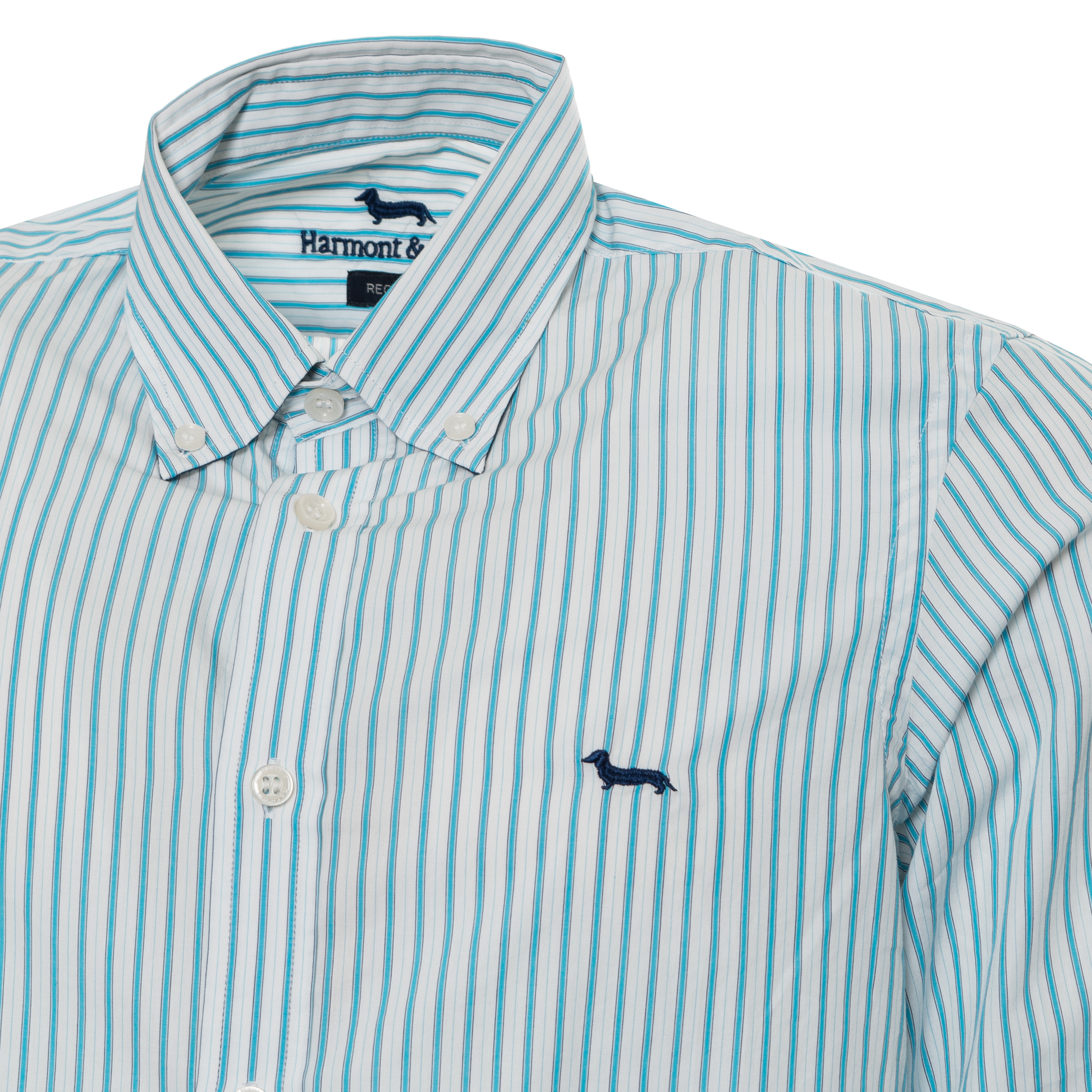 Una costruzione accurata caratterizza questa camicia Harmont & Blaine in puro cotone. Il collo button-down presenta punte assicurate da piccoli bottoni, garantendo una tenuta impeccabile. Lungo il busto, la fantasia a righe bicolore si sviluppa verticalmente, interrotta solo dall'iconico logo ricamato sul petto. I contrasti interni rivelano una cura sartoriale per i dettagli nascosti, mentre il fondo arrotondato e i polsini regolabili completano un'estetica pulita e rigorosa. Questo capo esprime un equilibrio tra precisione tecnica e semplicità tessile.