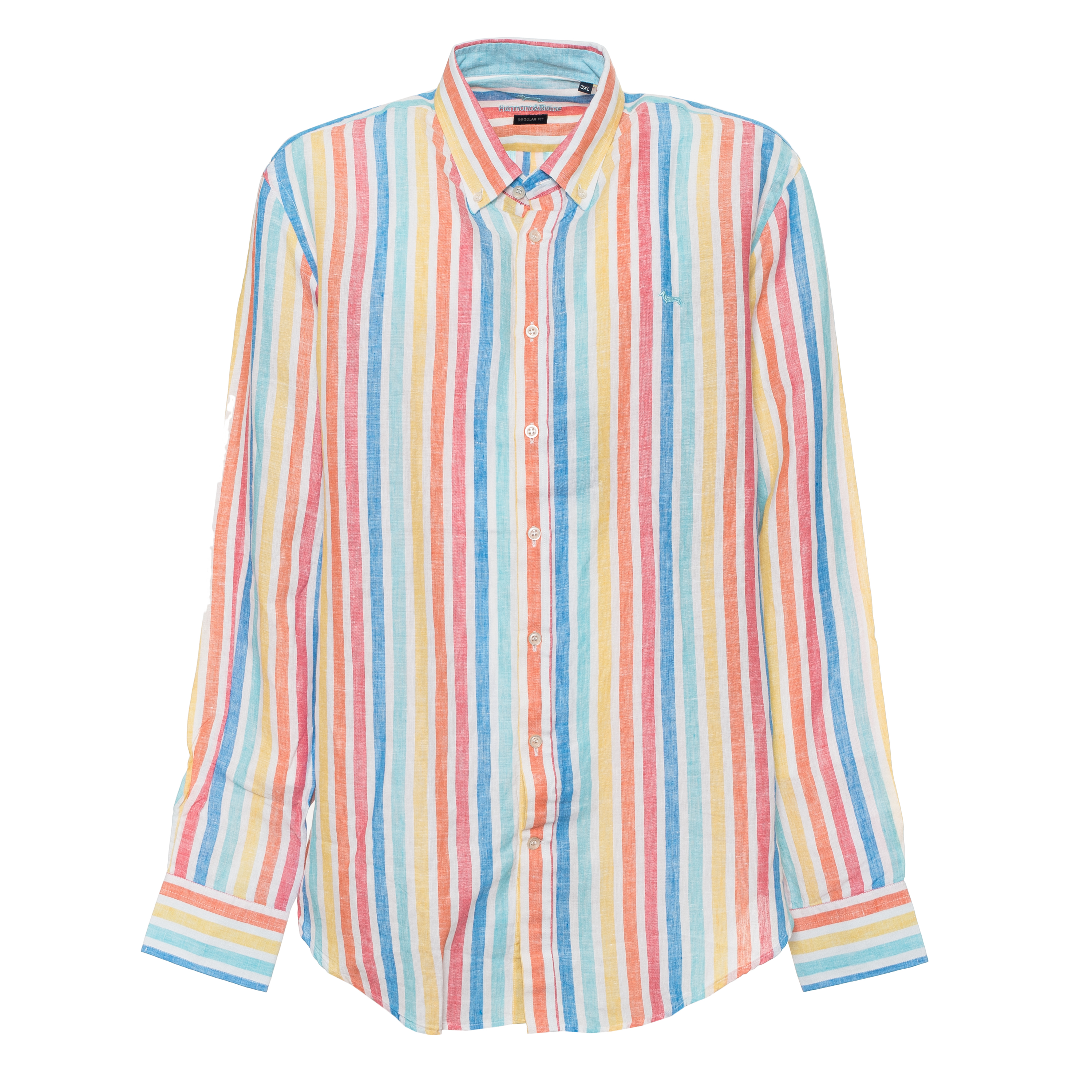 Questa camicia Harmont & Blaine a maniche lunghe presenta una struttura in puro lino caratterizzata da un motivo a righe verticali. Il colletto button-down conferisce un tono ordinato alla silhouette regular fit, mentre il logo ricamato sul petto identifica immediatamente l'origine del capo. Internamente, i contrasti cromatici sul sottocollo e sui polsini aggiungono un dettaglio sartoriale discreto. La chiusura frontale avviene tramite bottoni coordinati, completando una costruzione tessile leggera e traspirante che valorizza l'irregolarità organica della fibra.