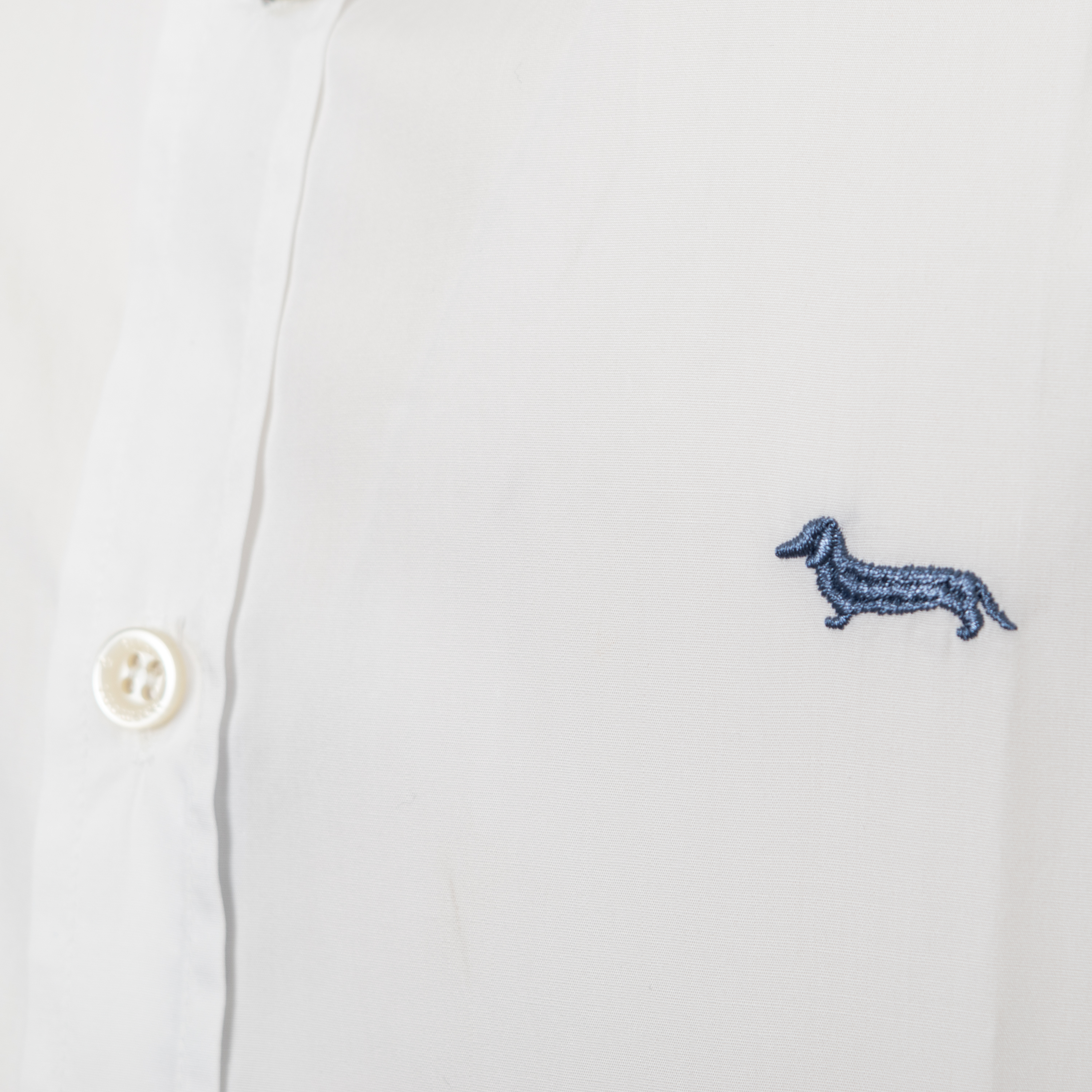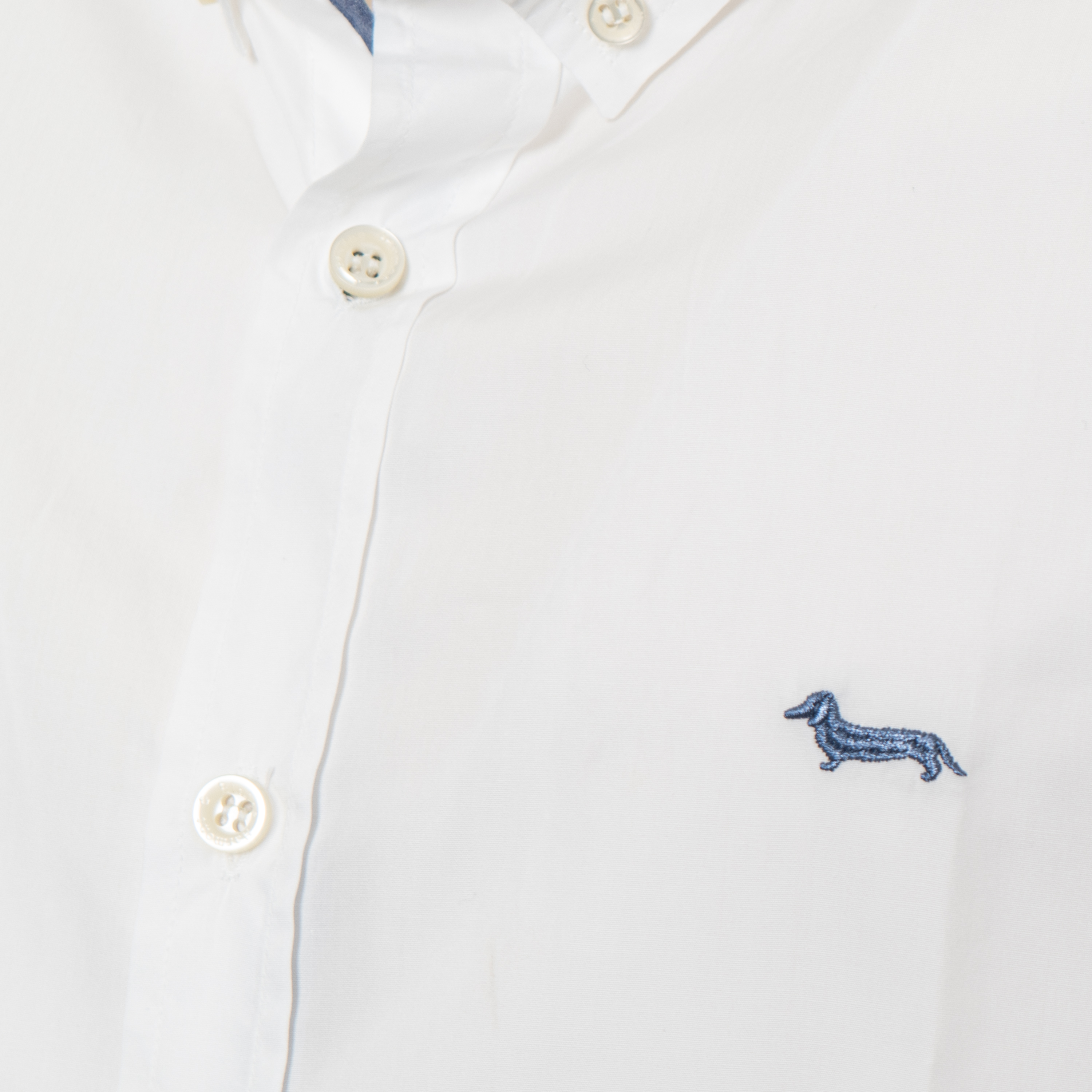 Questa camicia a manica corta firmata Harmont & Blaine esprime un rigore geometrico attraverso il suo taglio straight fit. Realizzata interamente in puro cotone, la struttura presenta un colletto button-down ben definito che mantiene la forma con precisione. La chiusura frontale è scandita da bottoni coordinati, mentre il celebre bassotto ricamato sul petto identifica immediatamente l'estetica del marchio. Le maniche corte terminano con un orlo lineare, completando un design essenziale focalizzato sulla pulizia delle linee e sulla qualità tattile della fibra naturale.