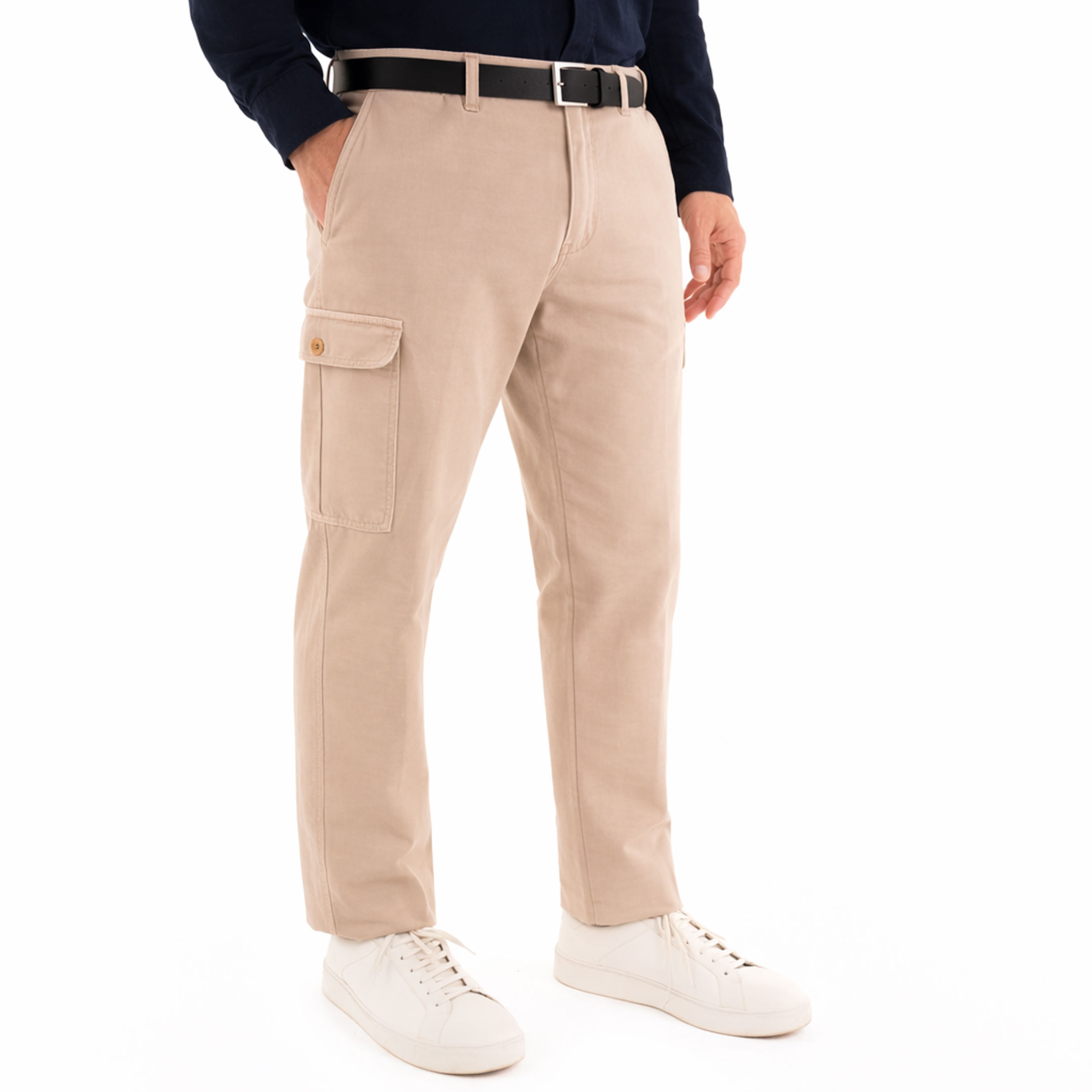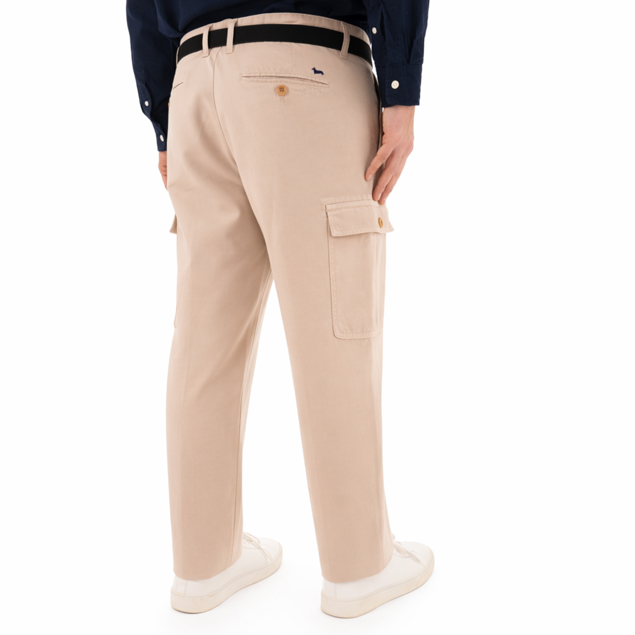 La freschezza del lino si affianca alla solidità del cotone in questo pantalone Harmont & Blaine di manifattura italiana. La trama naturale del tessuto conferisce un aspetto autentico, esaltato da una costruzione a sei tasche che include ampi comparti cargo laterali rifiniti con bottone. Il taglio scivola lungo la gamba con precisione sartoriale, terminando in un fondo regolare. Ogni cucitura rivela l'attenzione artigianale tipica del marchio, mentre la chiusura classica con zip e bottone assicura una vestibilità impeccabile e discreta.